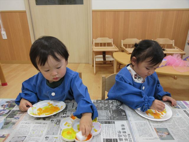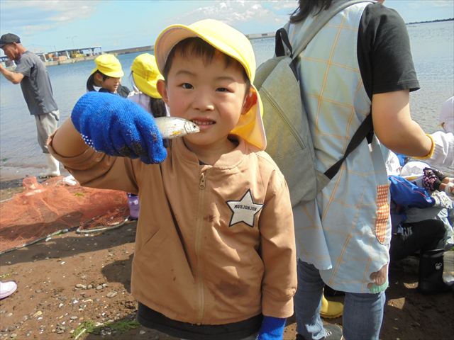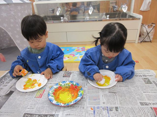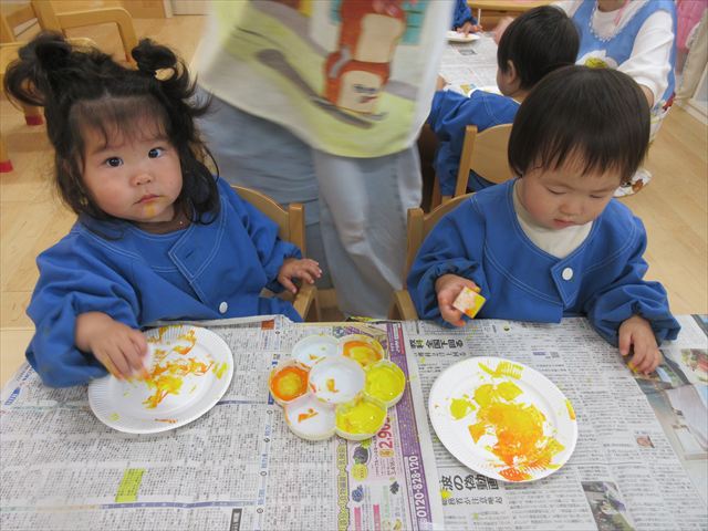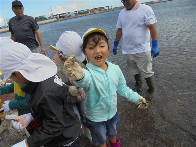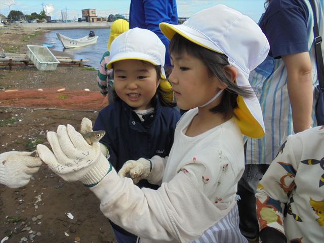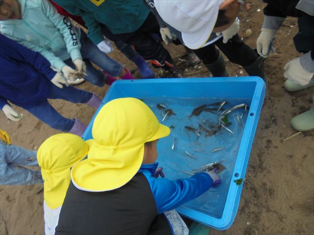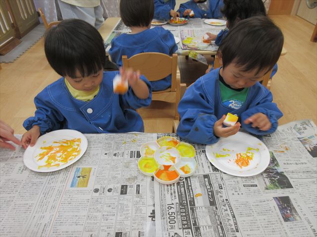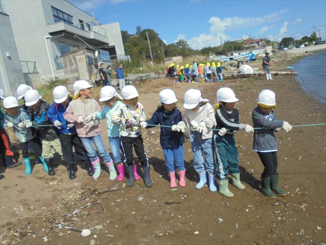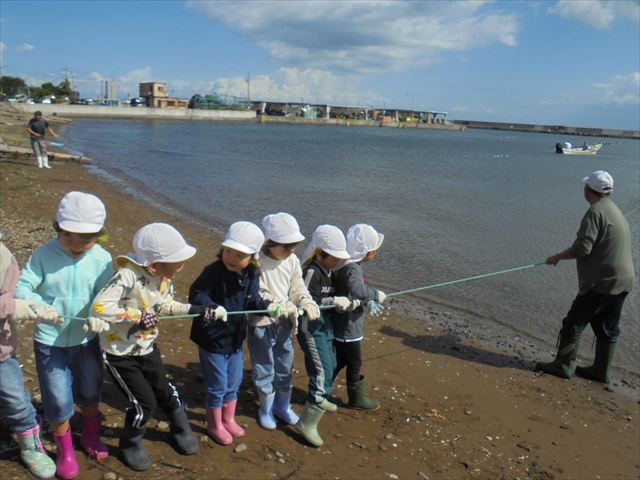 今日は年長さんの地引網体験活動がありました。お魚さわって大喜びでした。かめ組は色遊びを楽しみました。いるか組はだるまのお面づくりをしました。ぺんぎん組はお散歩に行ってから園庭で遊びました。