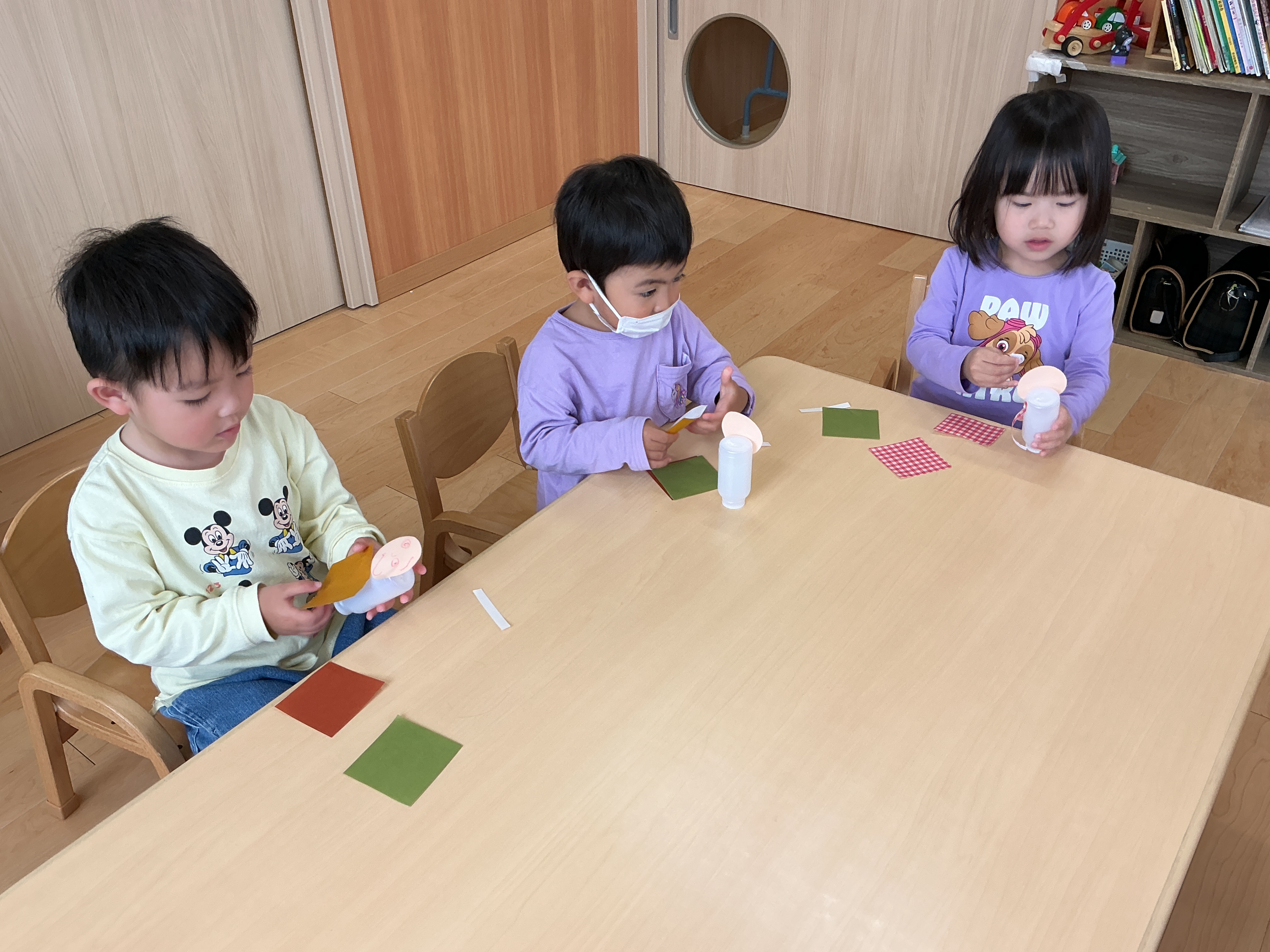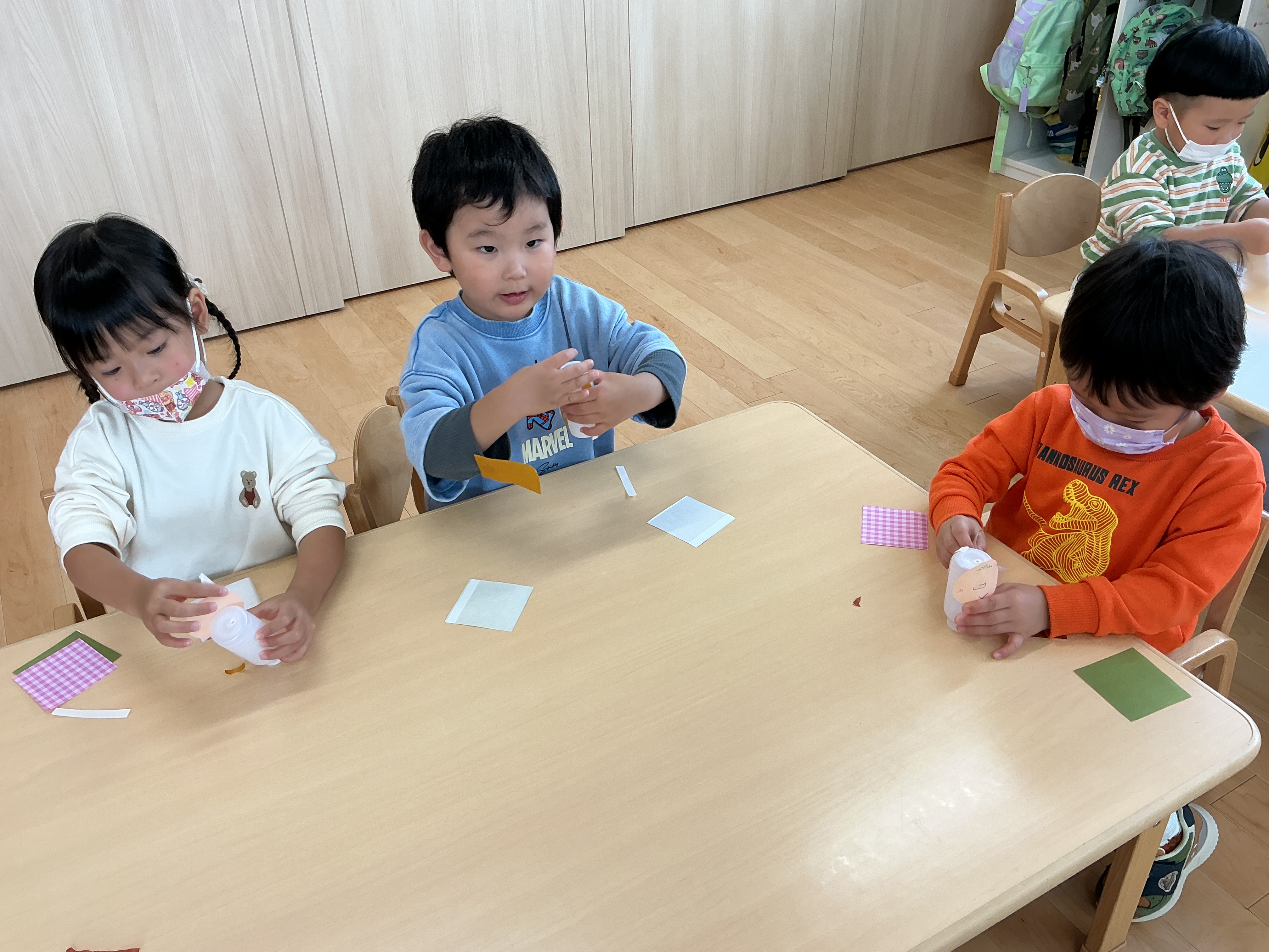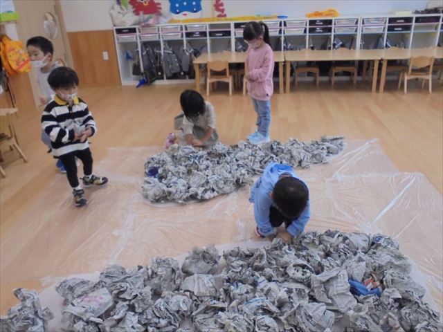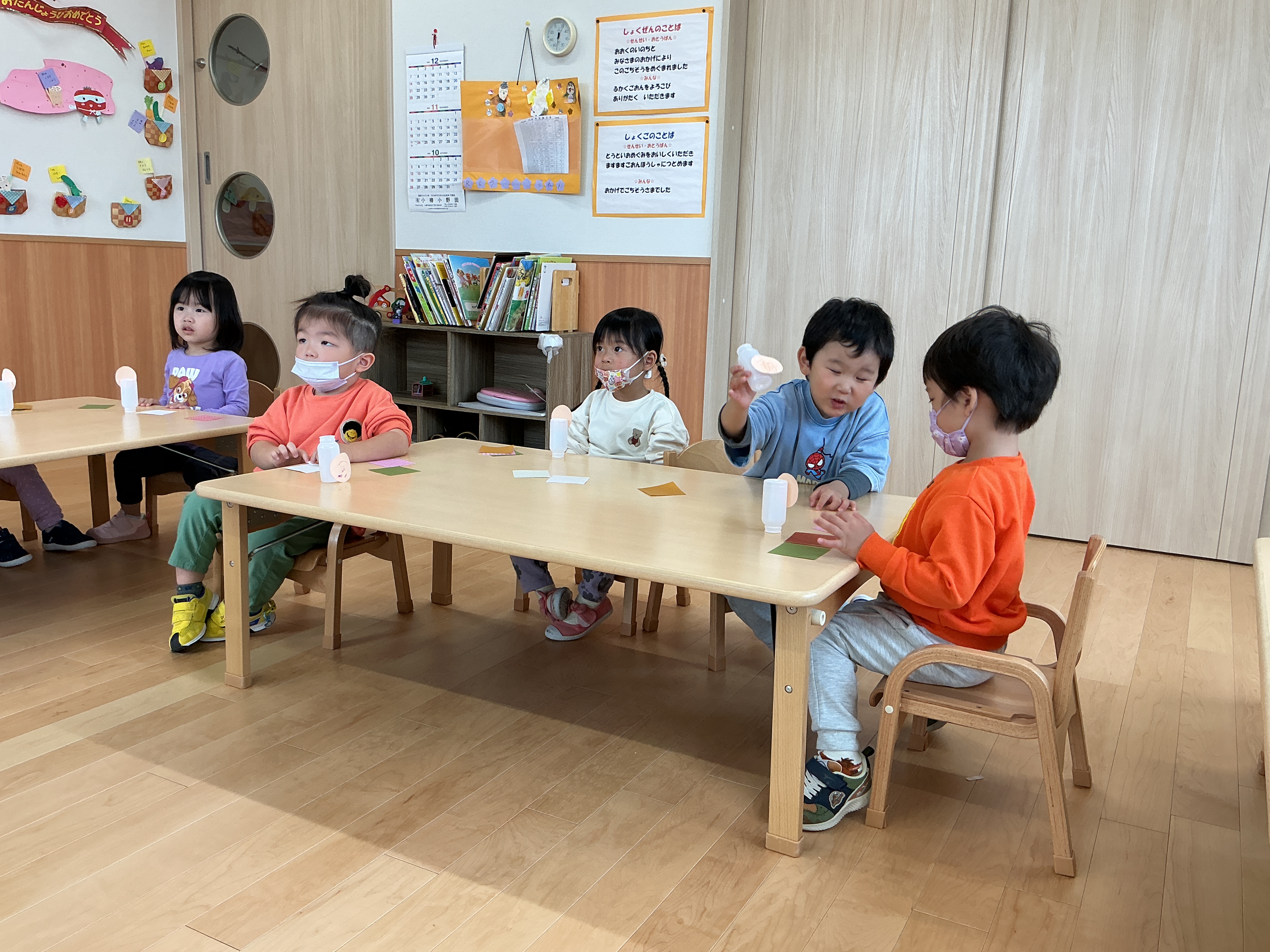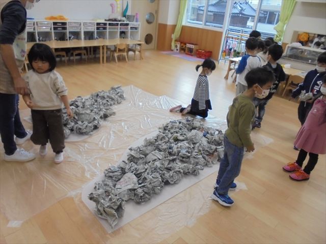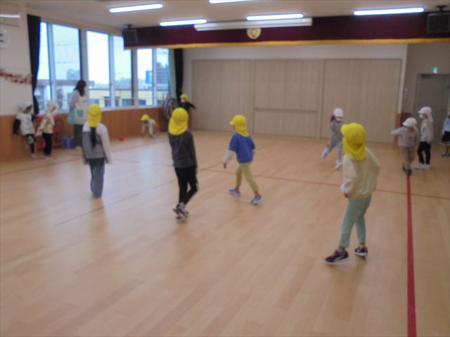 先週はインフルエンザが蔓延していましたが、今週から少し落ち着いてきたようです。今週いっぱいはマスクの着用をお願いします。年少さんは折り紙遊び、年中さんは発表会で使う岩づくり、年長さんはドッジボール遊び、ぺんぎん組さんはミノムシづくりをしていました。