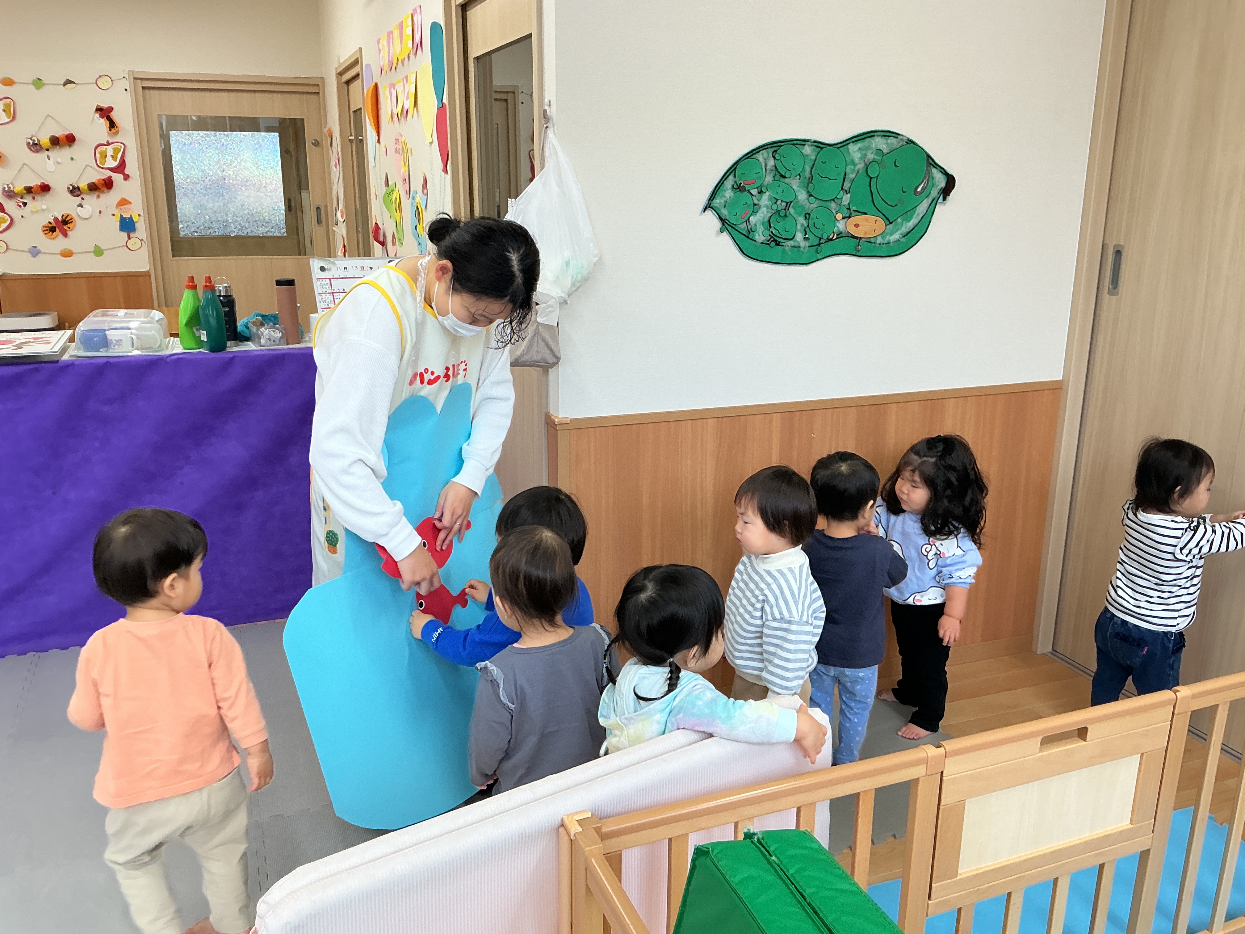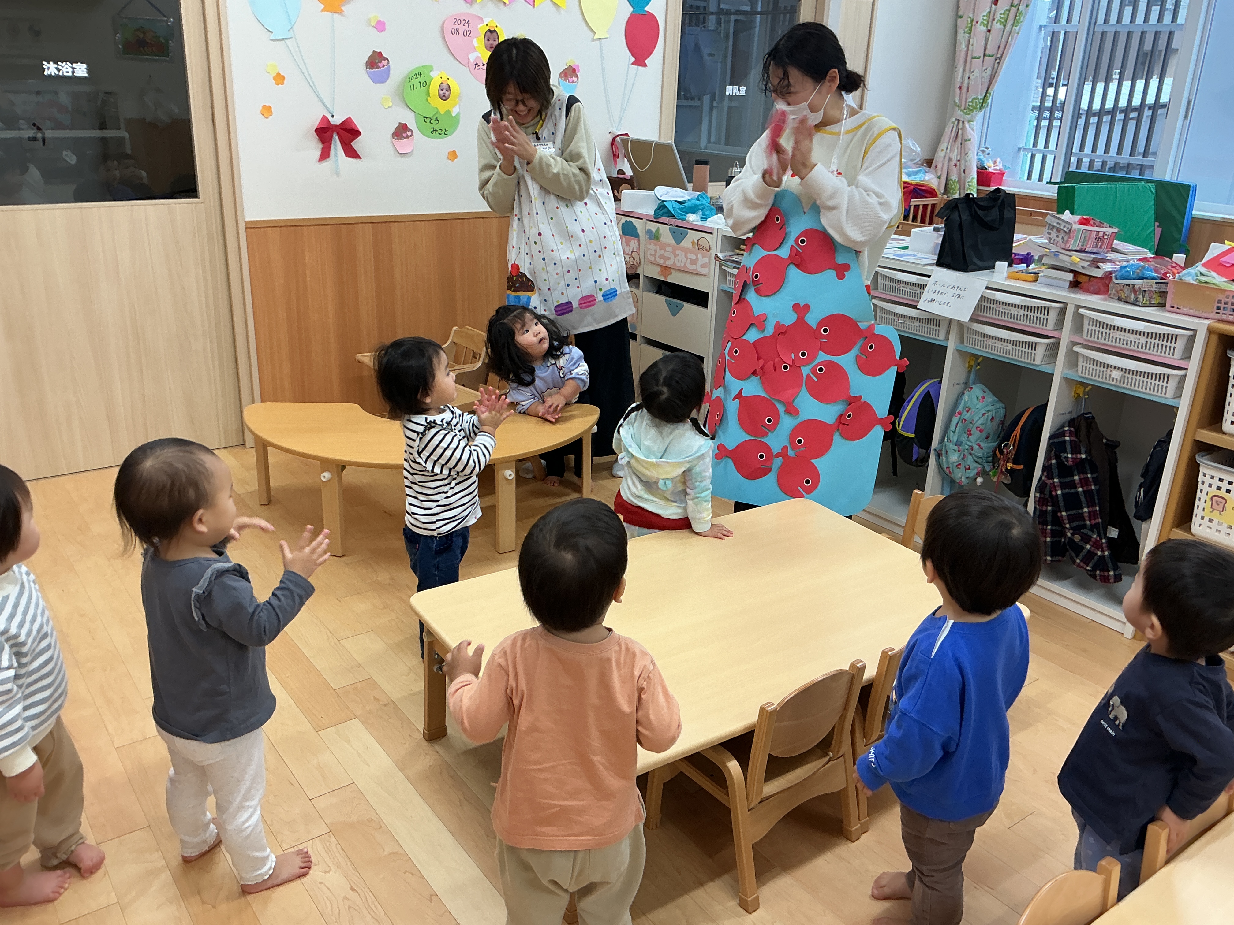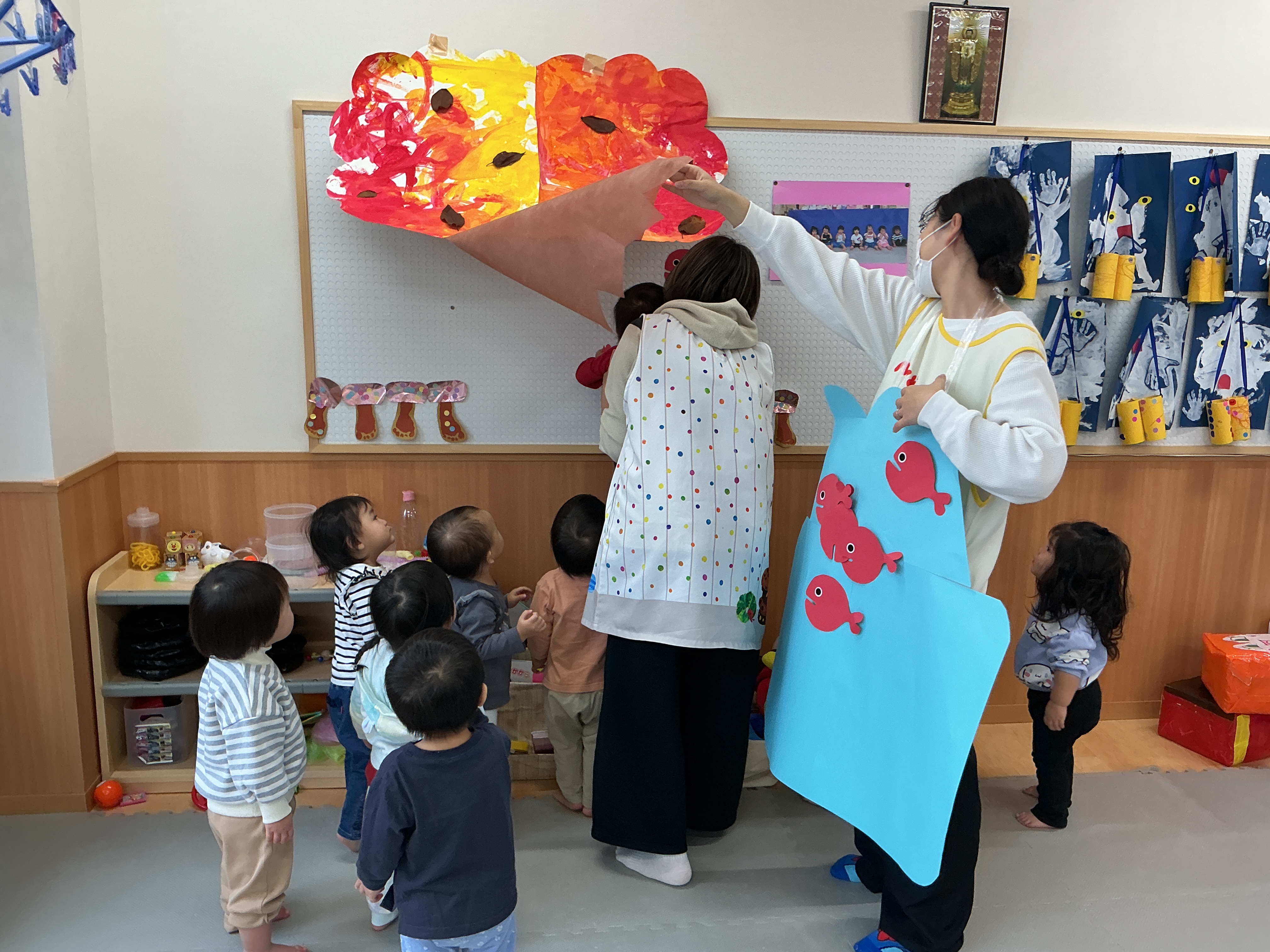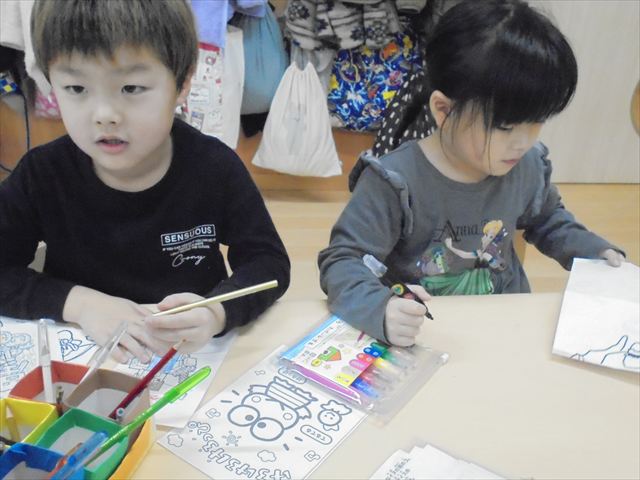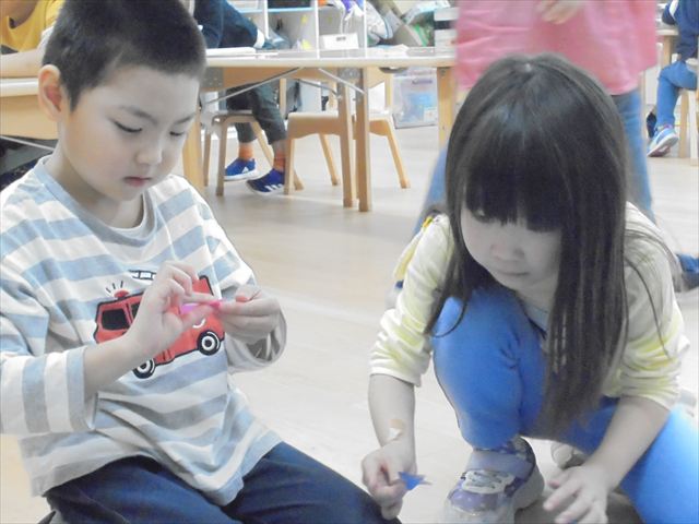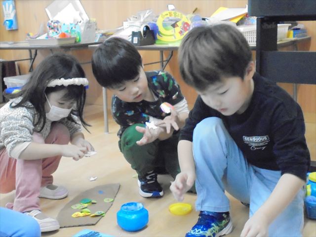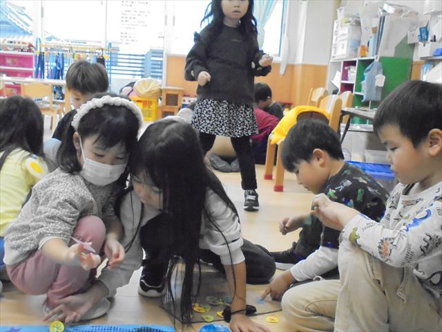 「きんぎょがにげた」の絵本のきんぎょさんから、「ぼくのおともだちをさがしてください。」というお手紙が、かめ組に届きました。みんなできんぎょさんのお友達を探しましたよ。年長さんはお友達と力を合わせて発表会の準備をしていました。