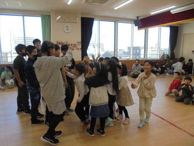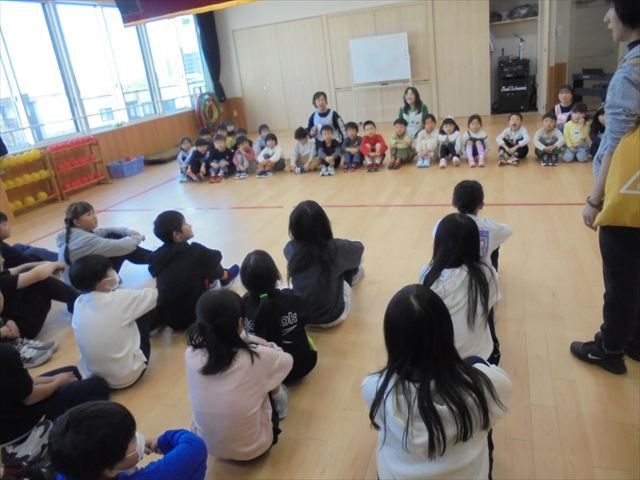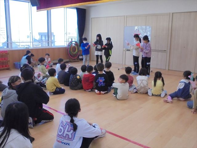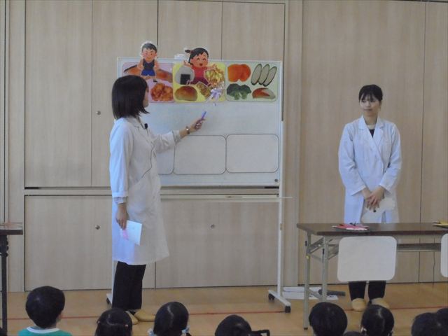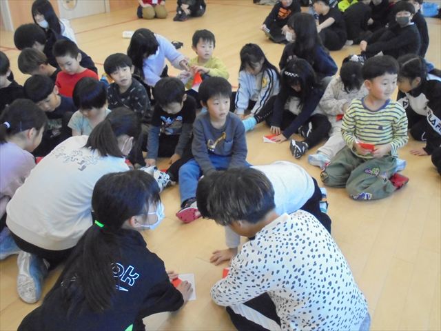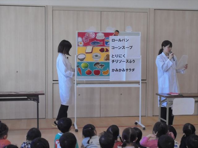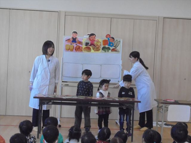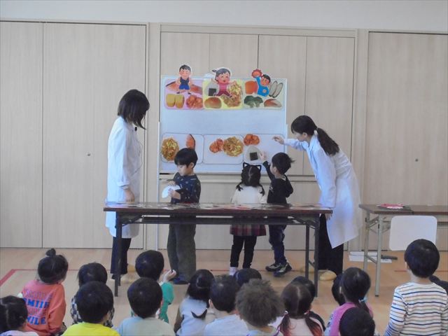 11月27日(木)子どもたちの様子 今日は、潮見台小学校5年生と年長さんの交流会がありました。また、給食を提供いただいている株)日総さんの栄養士の方に食育教室を開催していただきました。 潮見台小学校5年生の皆さんよろしくお願いします。 絵本の読み聞かせ しっぽとり鬼 ケイドロ鬼 合唱 お絵描き 折り紙 食育教室をはじめます。 元気が出るお弁当つくってみよう By 小樽幼稚園スタッフ | 2025年11月27日 | お知らせ, 子ども達の様子 | ← 11月26日(水)子どもたちの様子