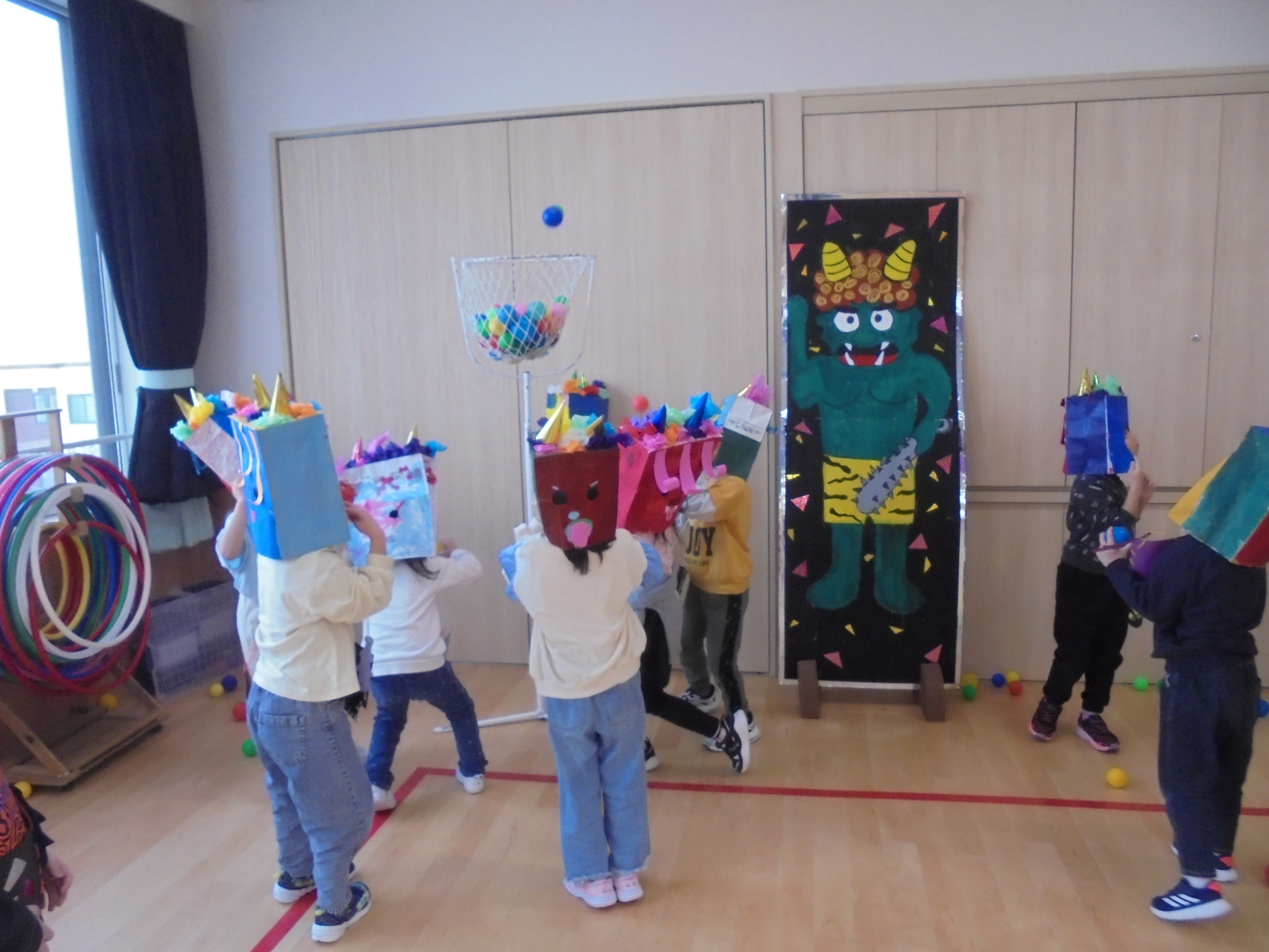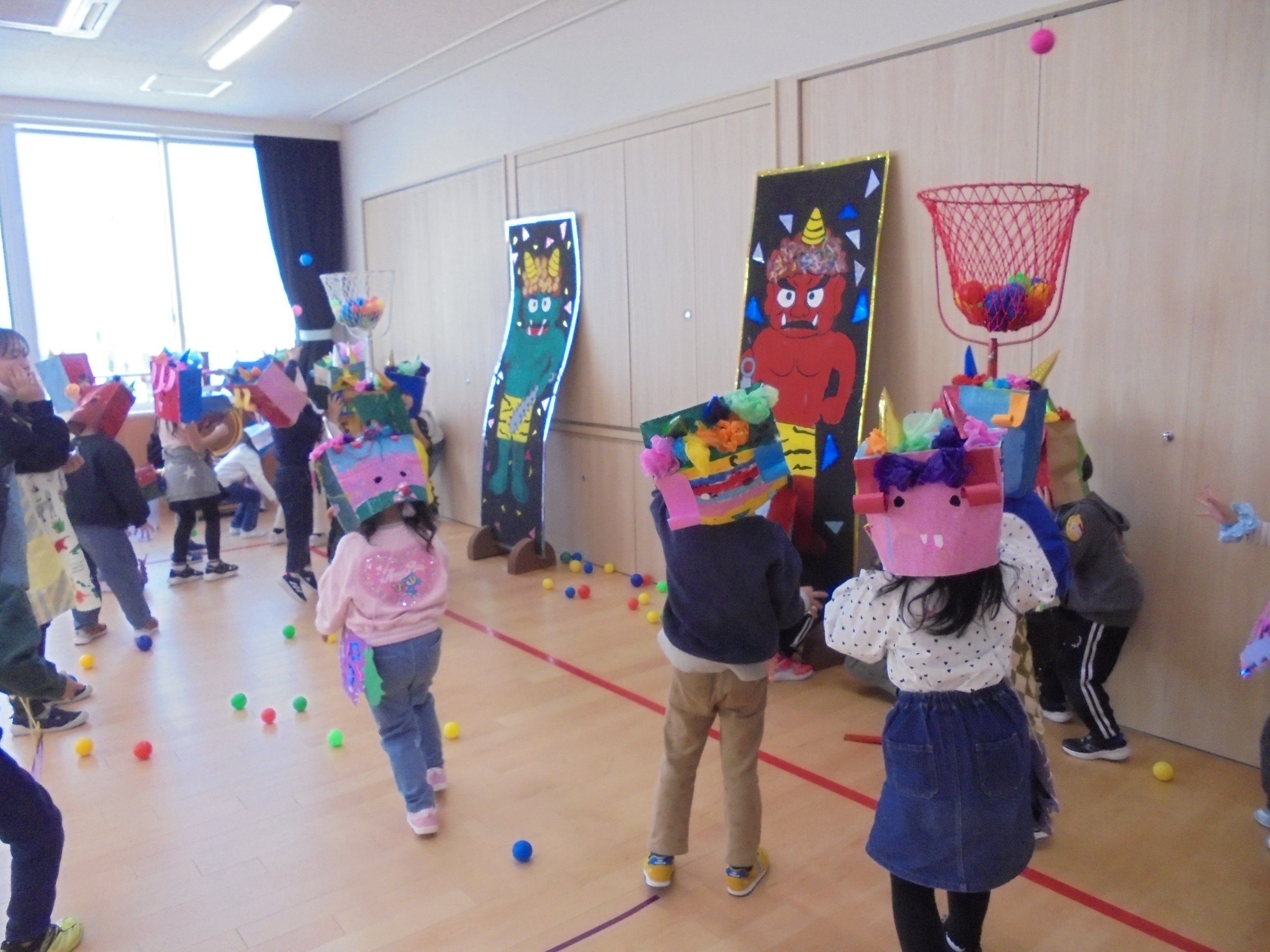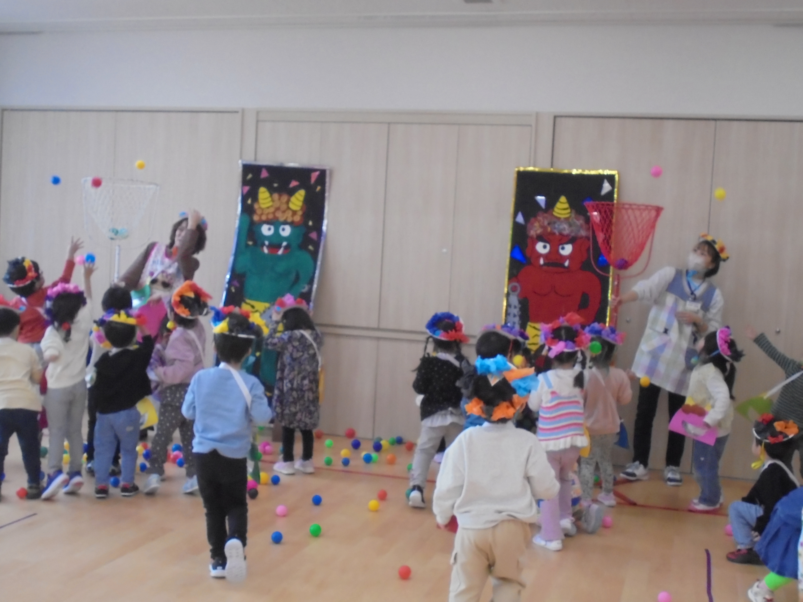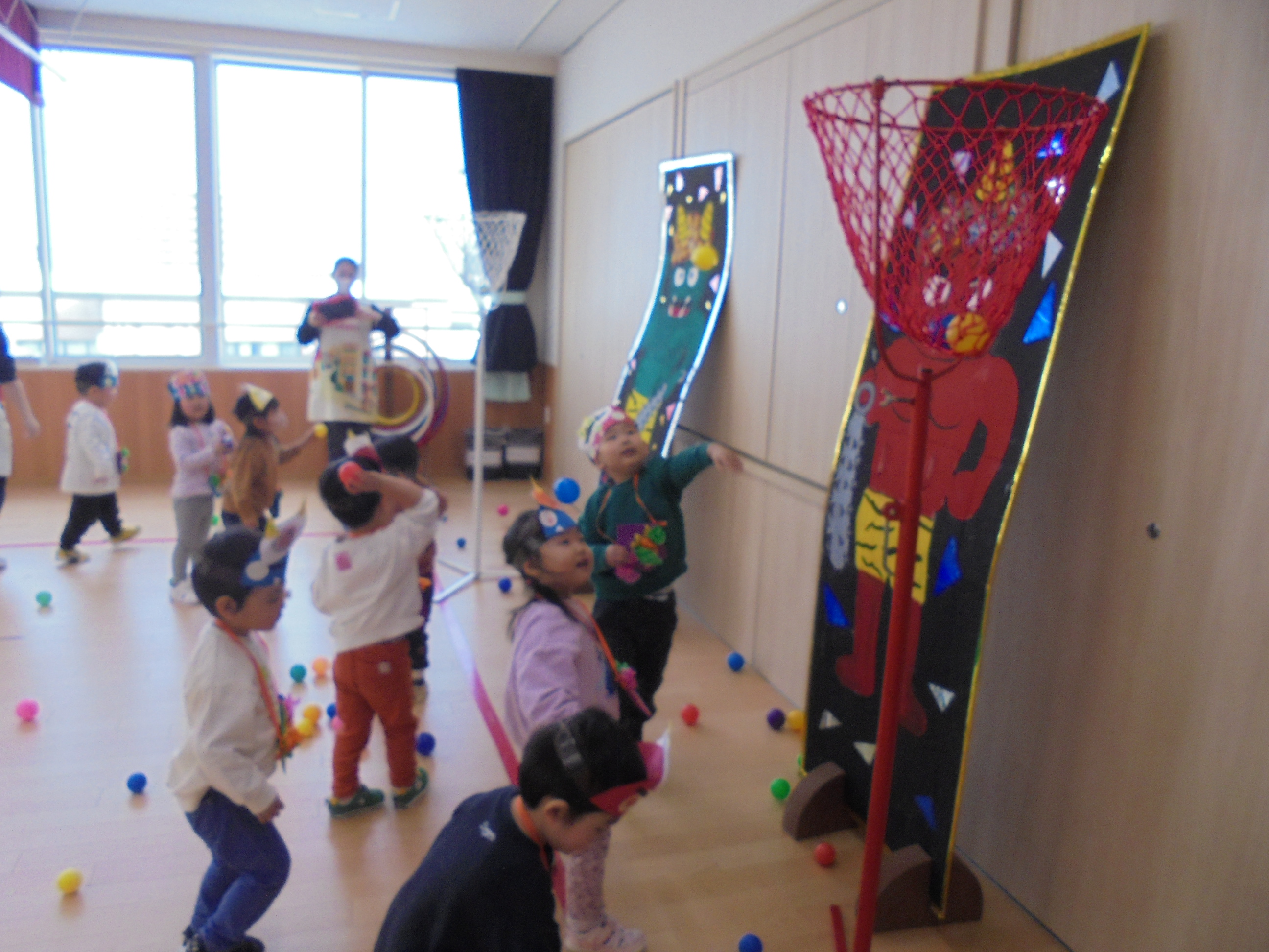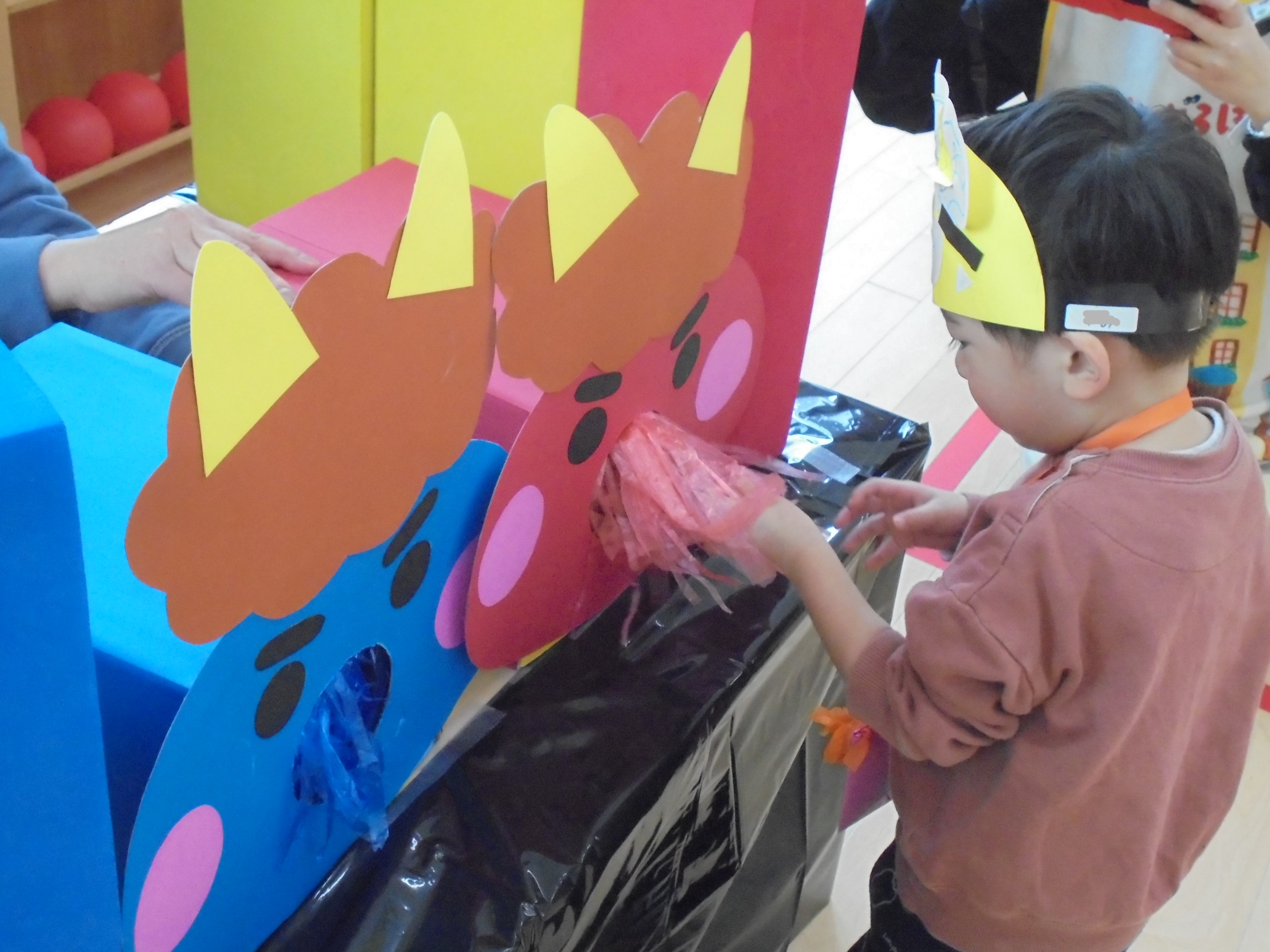 今日は節分会がありました。自分たちにいる鬼を追い出そうと「オニはーそと」「福はーうち」と声を出しながら、豆の代わりにボールを投げました。また、オニの口に手を入れてお菓子をゲットしましたよ!