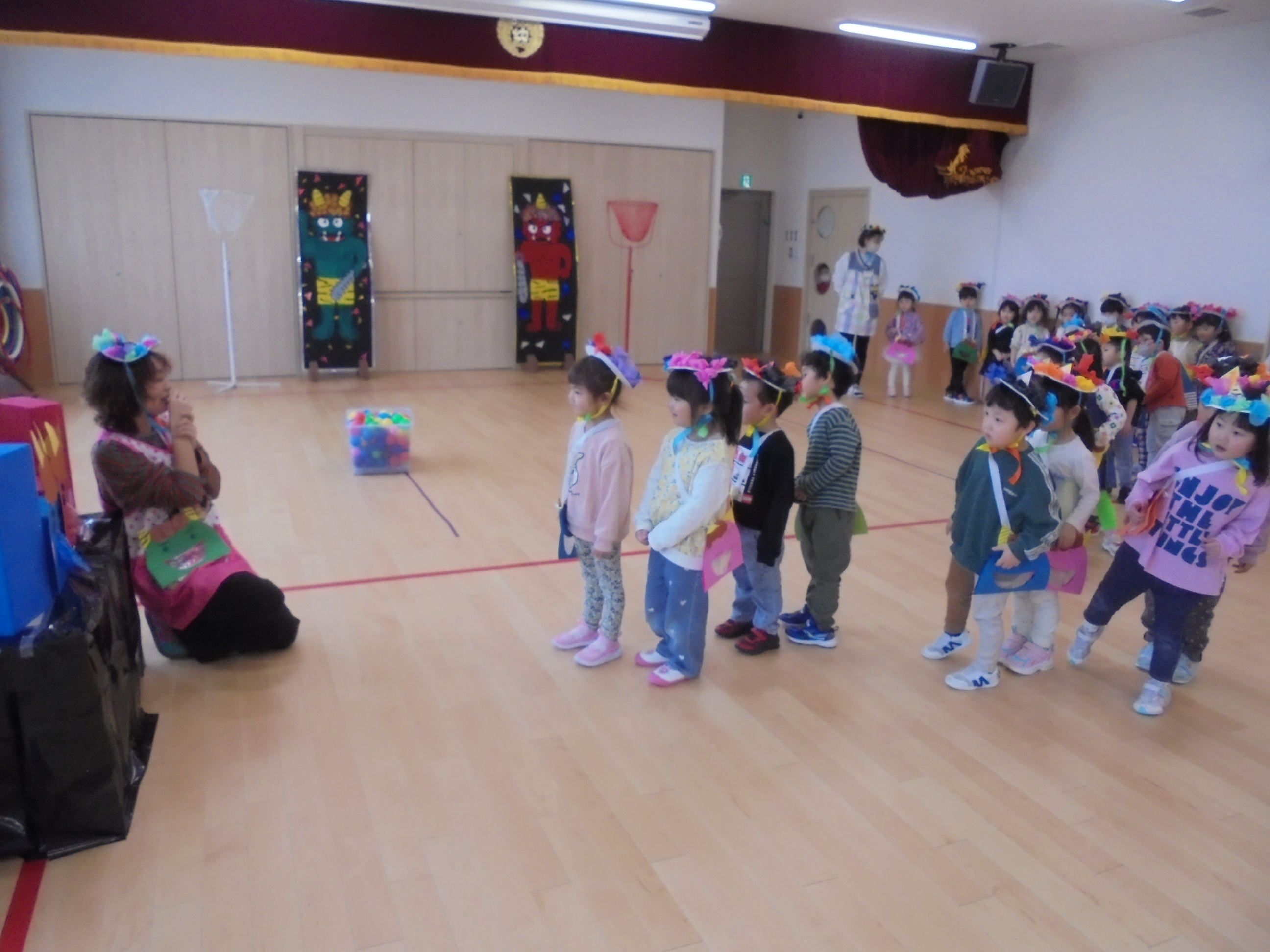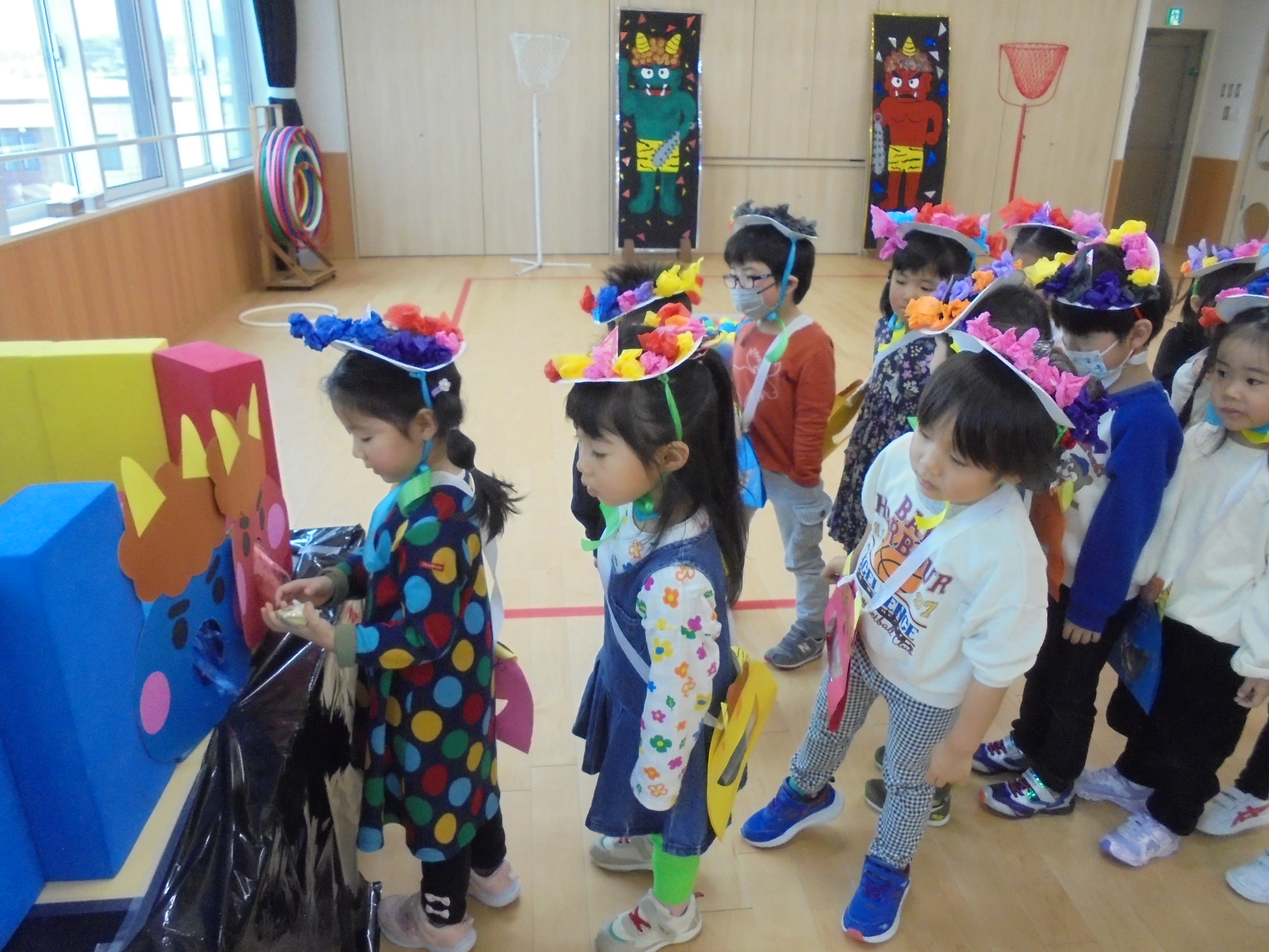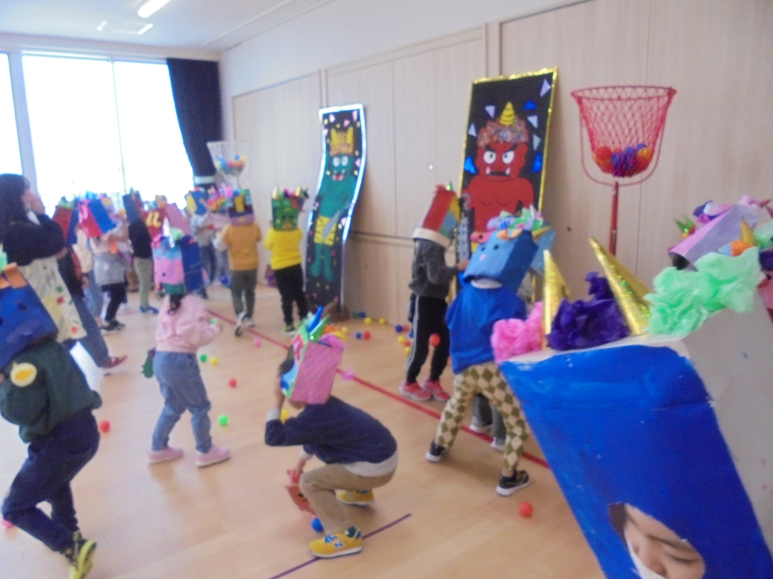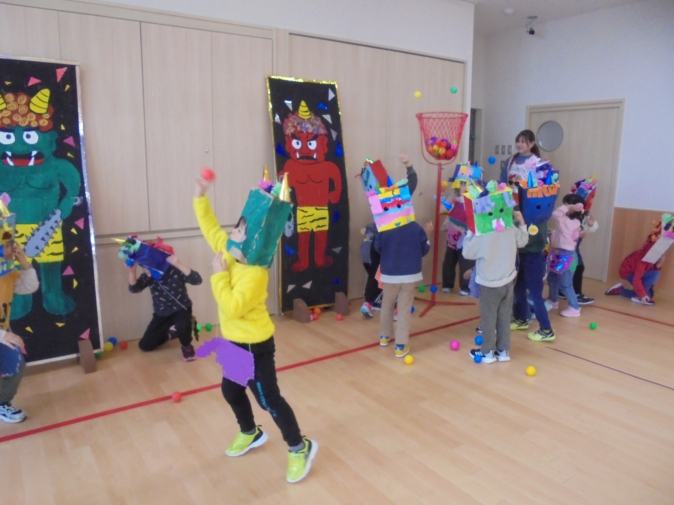 今日は節分会がありました。自分たちにいる鬼を追い出そうと「オニはーそと」「福はーうち」と声を出しながら、豆の代わりにボールを投げました。また、オニの口に手を入れてお菓子をゲットしましたよ!