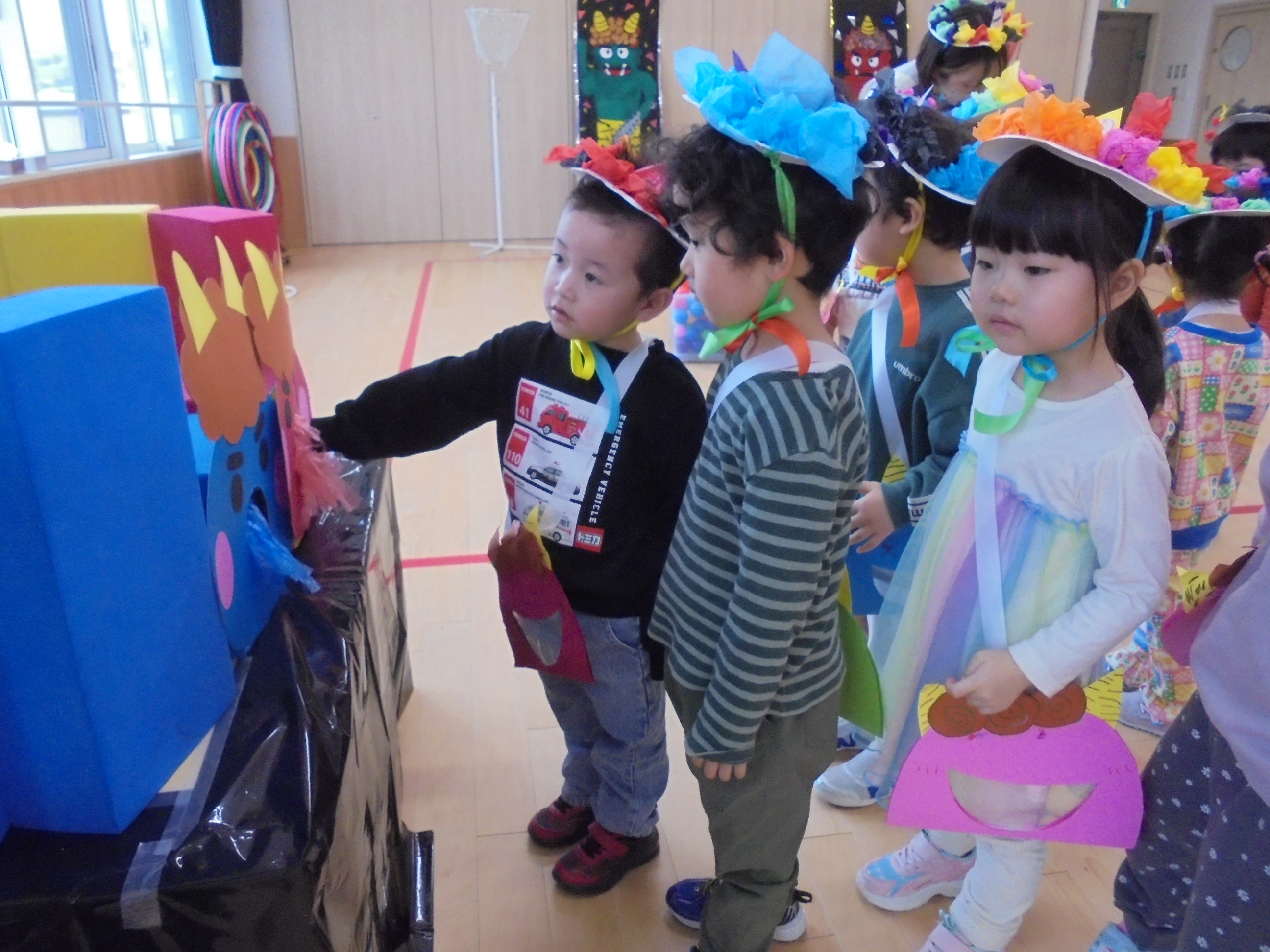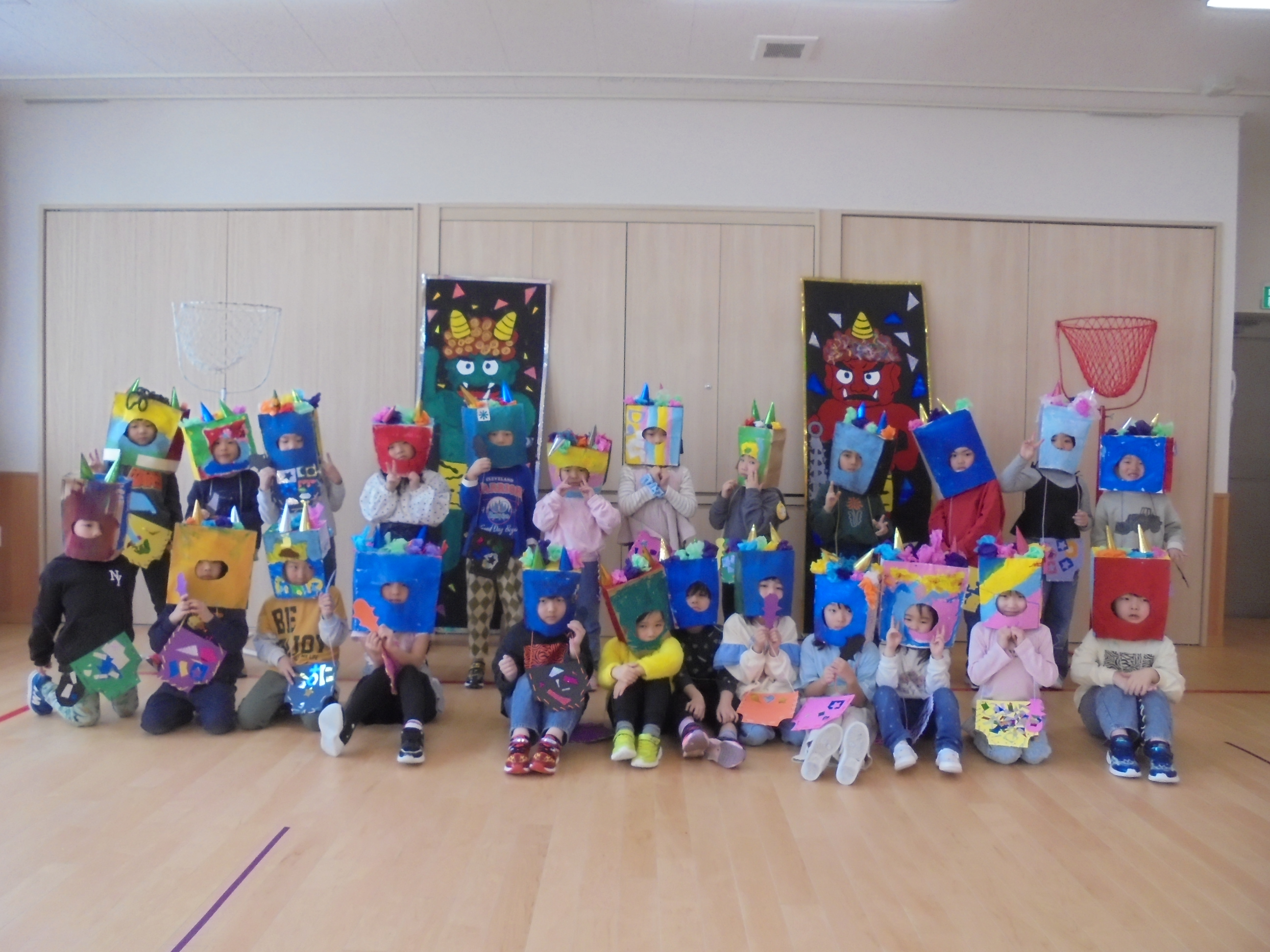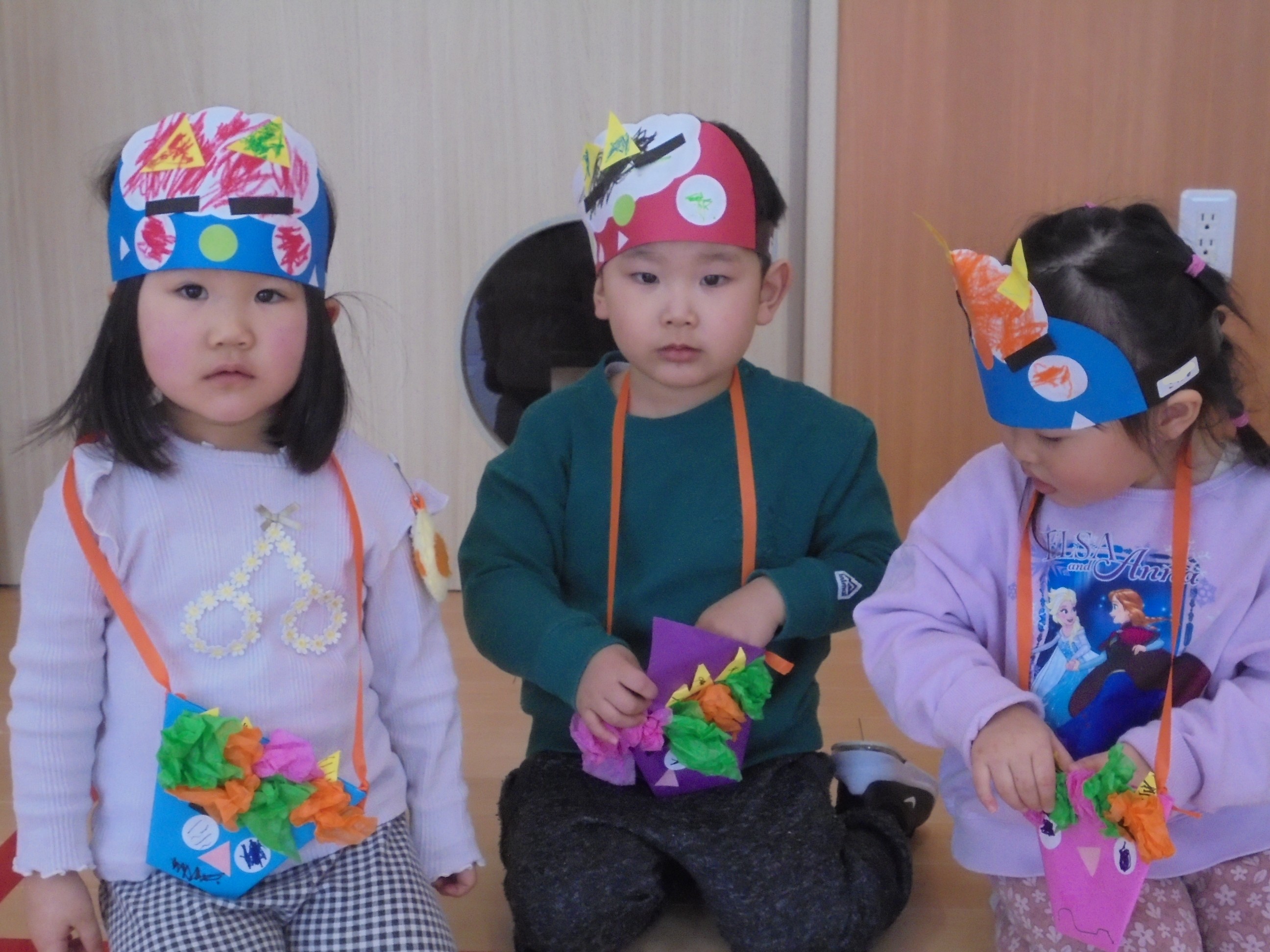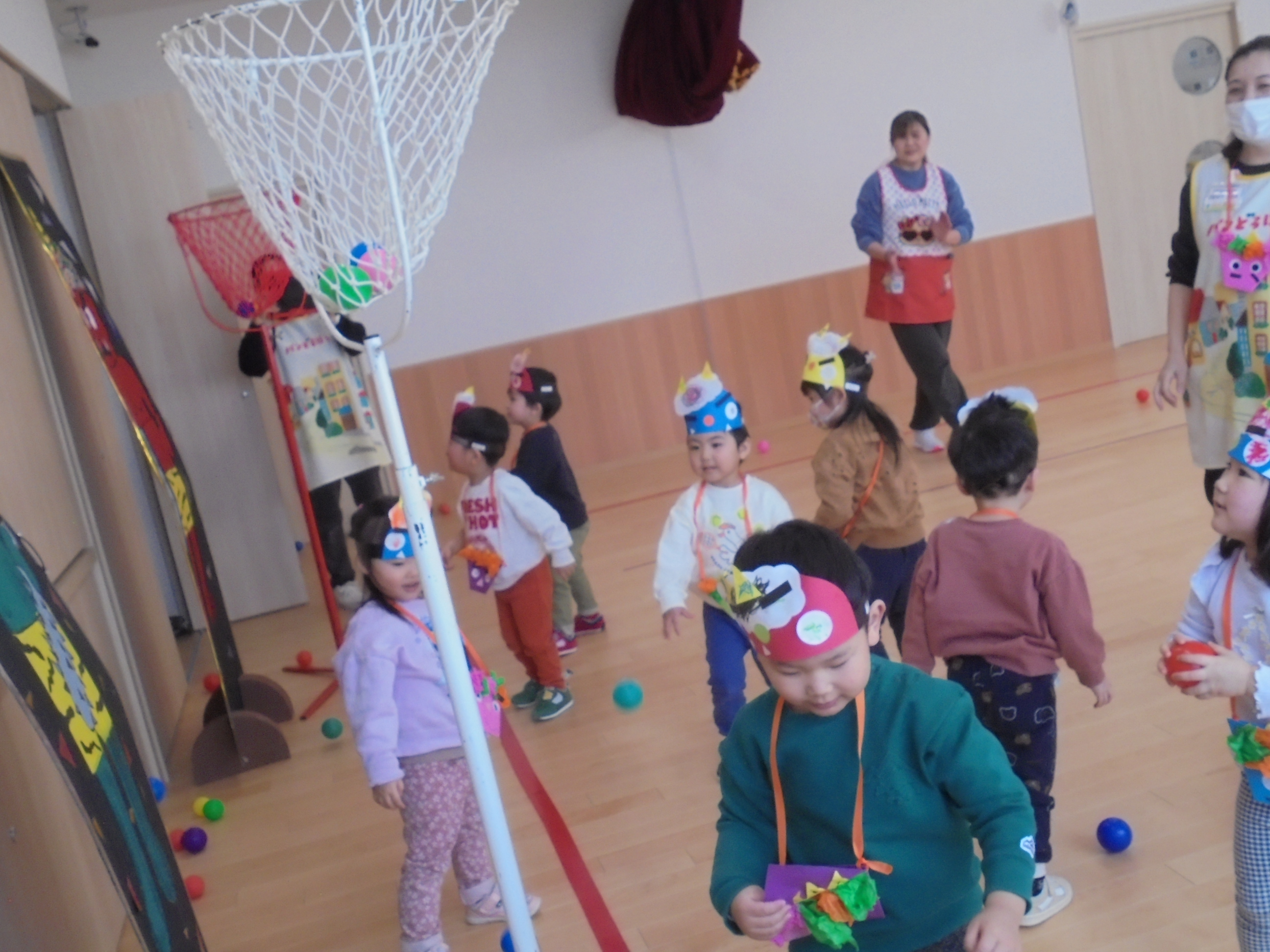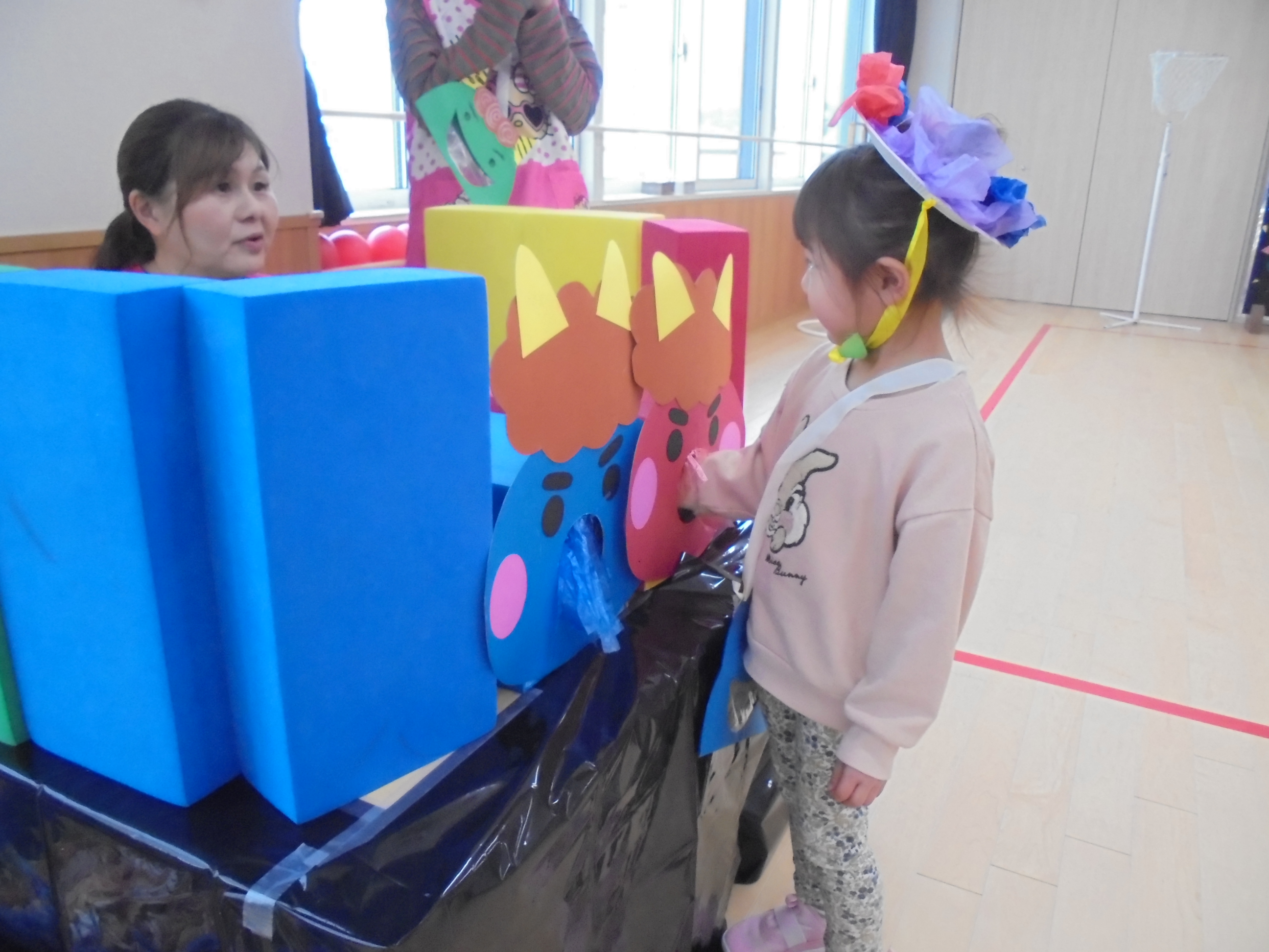 今日は節分会がありました。自分たちにいる鬼を追い出そうと「オニはーそと」「福はーうち」と声を出しながら、豆の代わりにボールを投げました。また、オニの口に手を入れてお菓子をゲットしましたよ!
