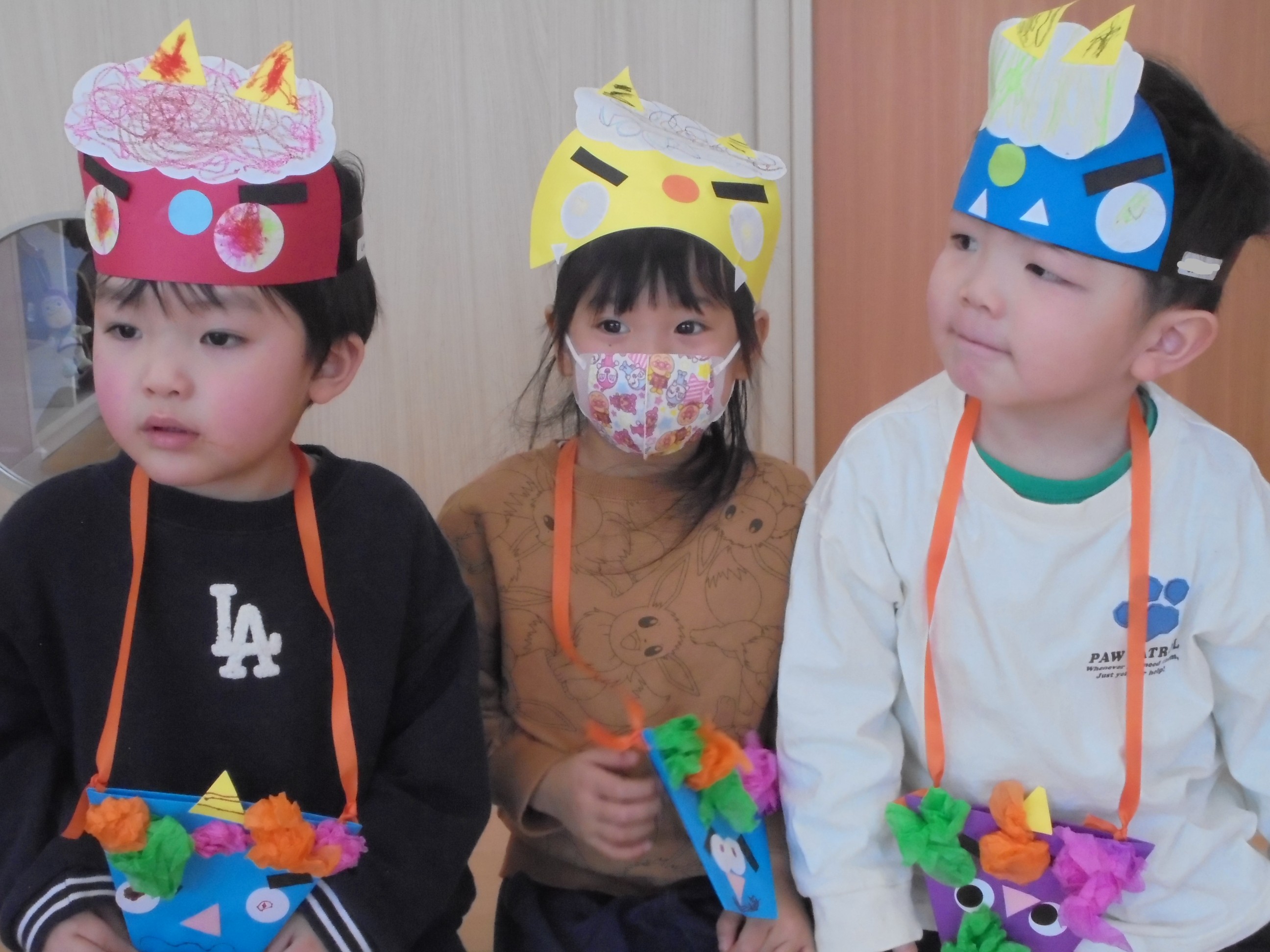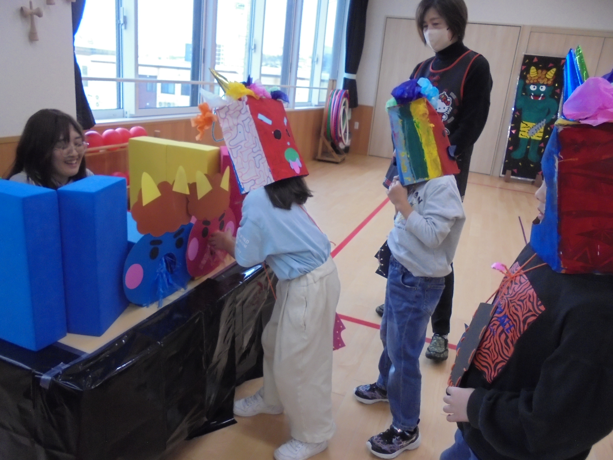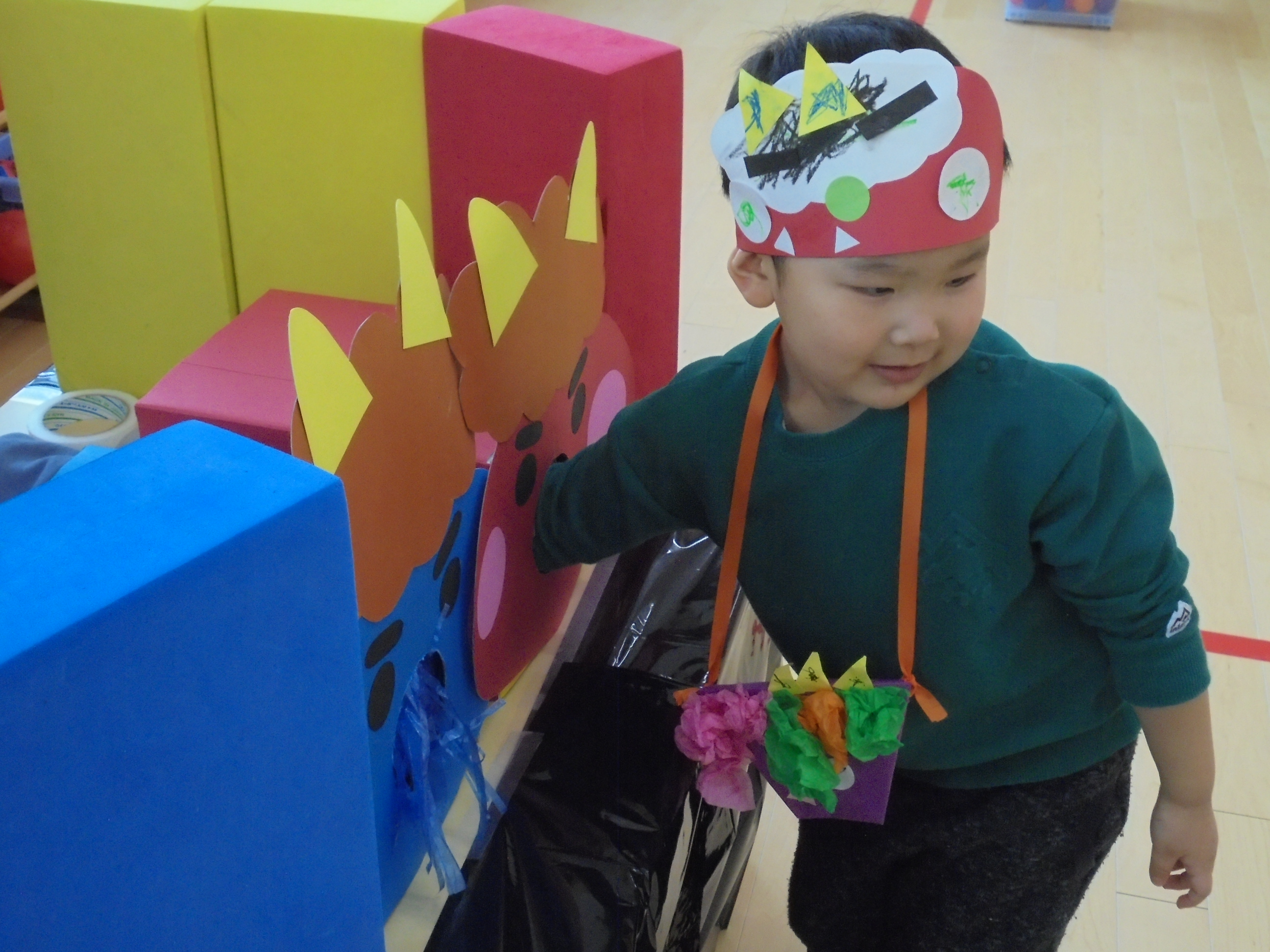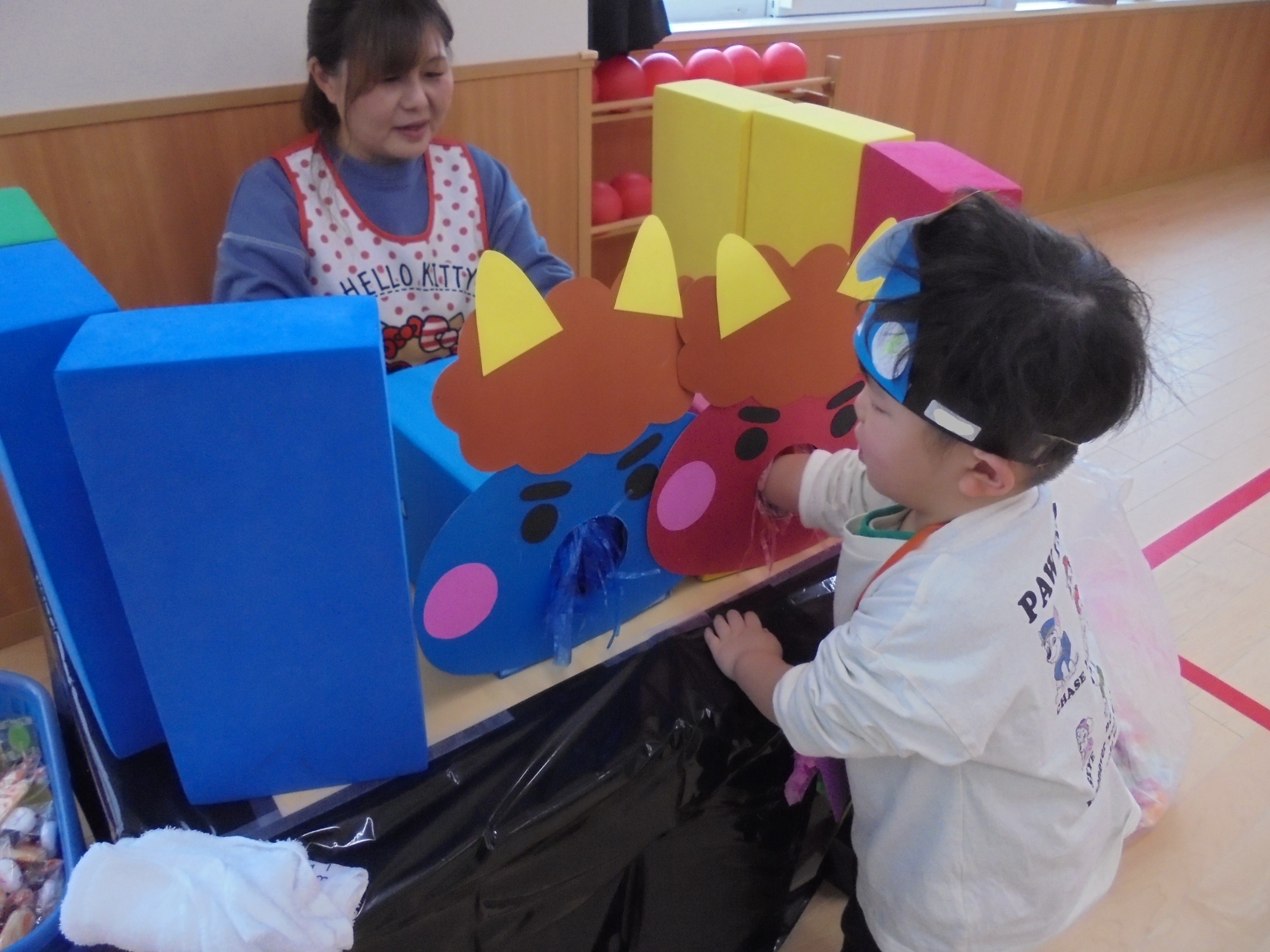今日は節分会がありました。自分たちにいる鬼を追い出そうと「オニはーそと」「福はーうち」と声を出しながら、豆の代わりにボールを投げました。また、オニの口に手を入れてお菓子をゲットしましたよ!