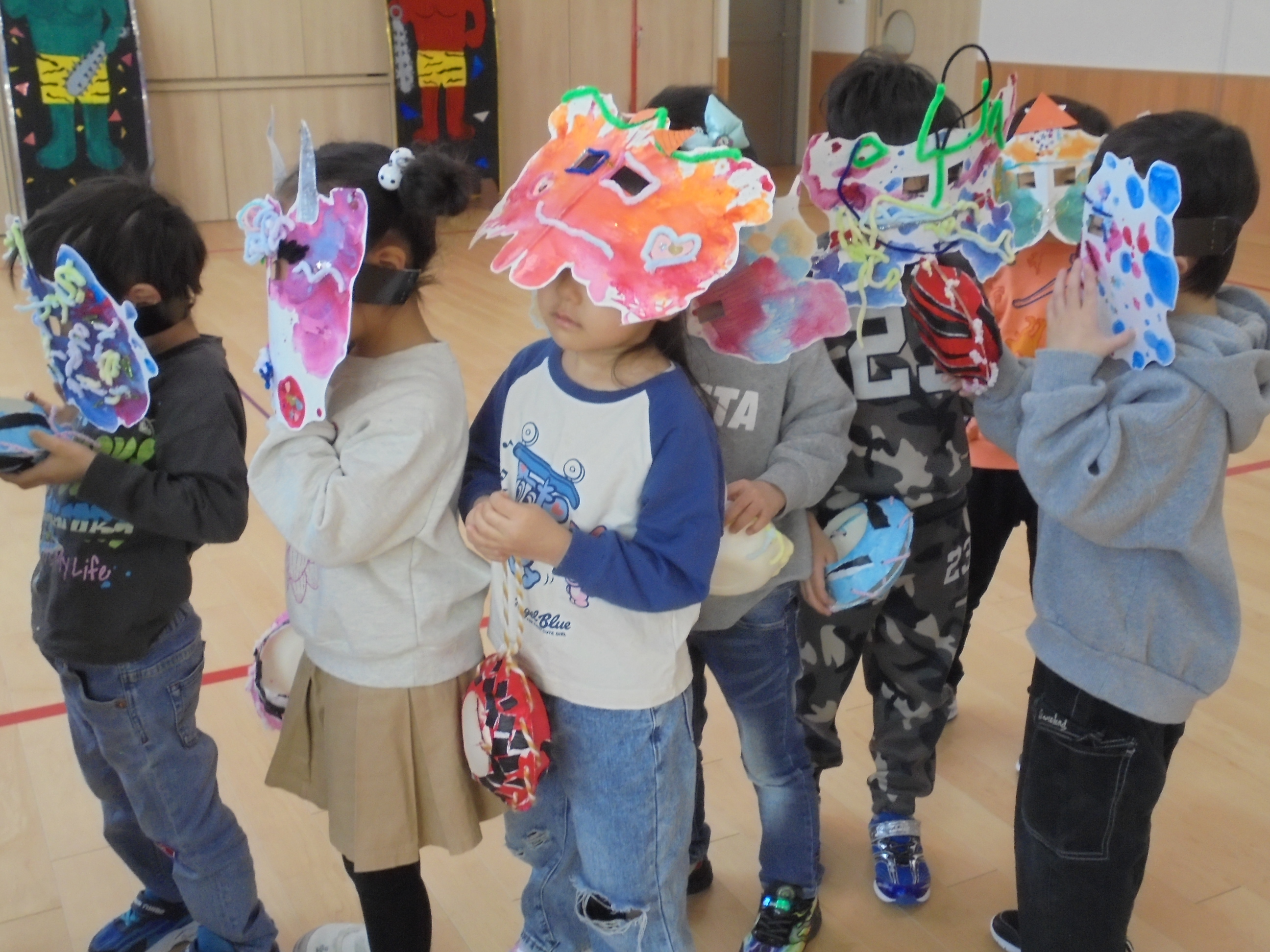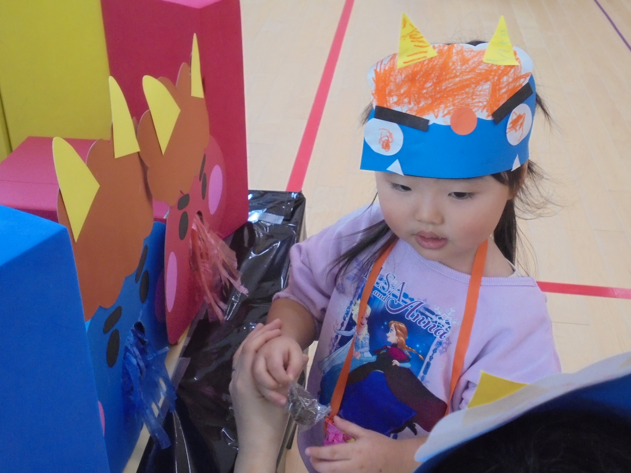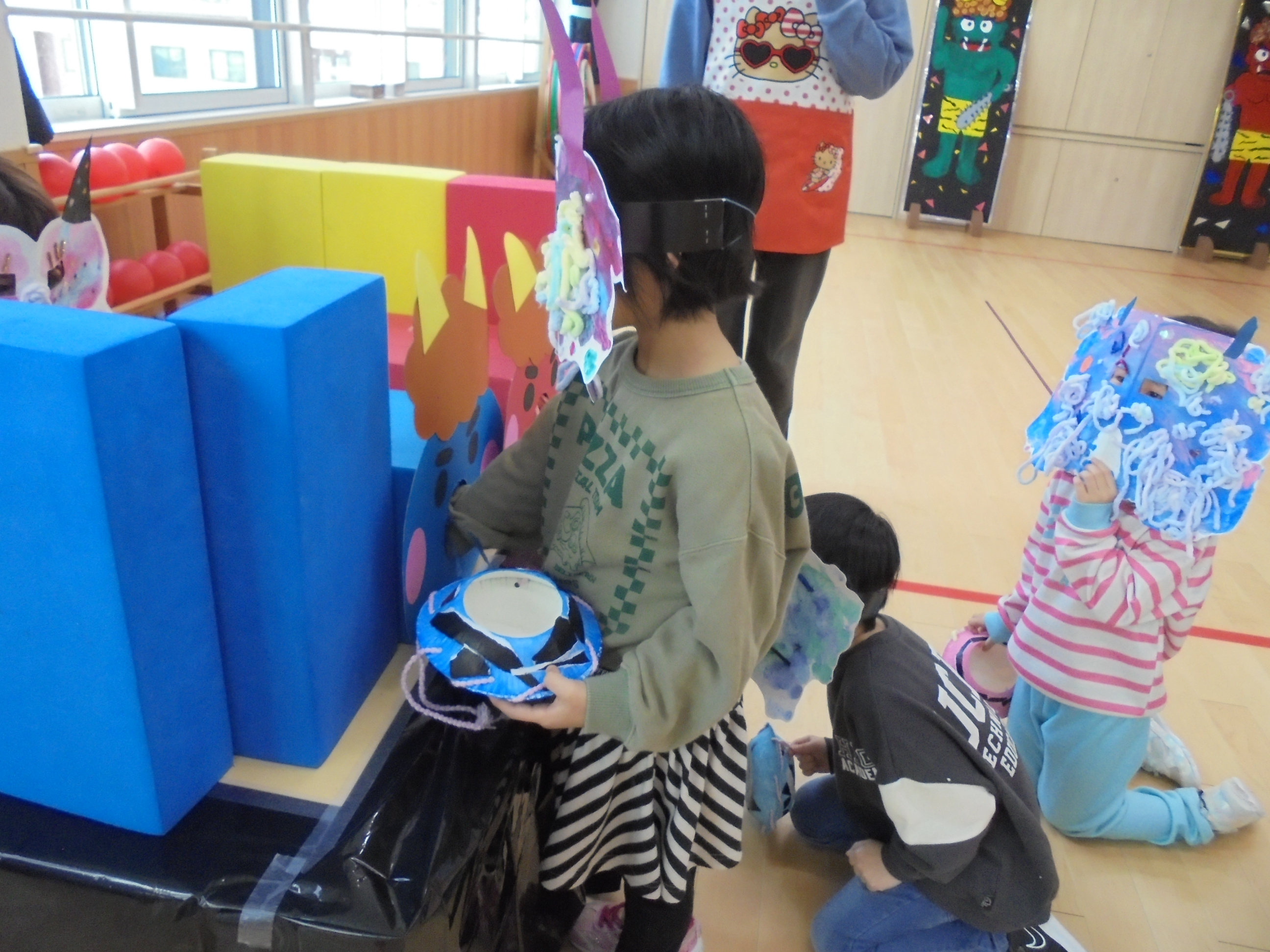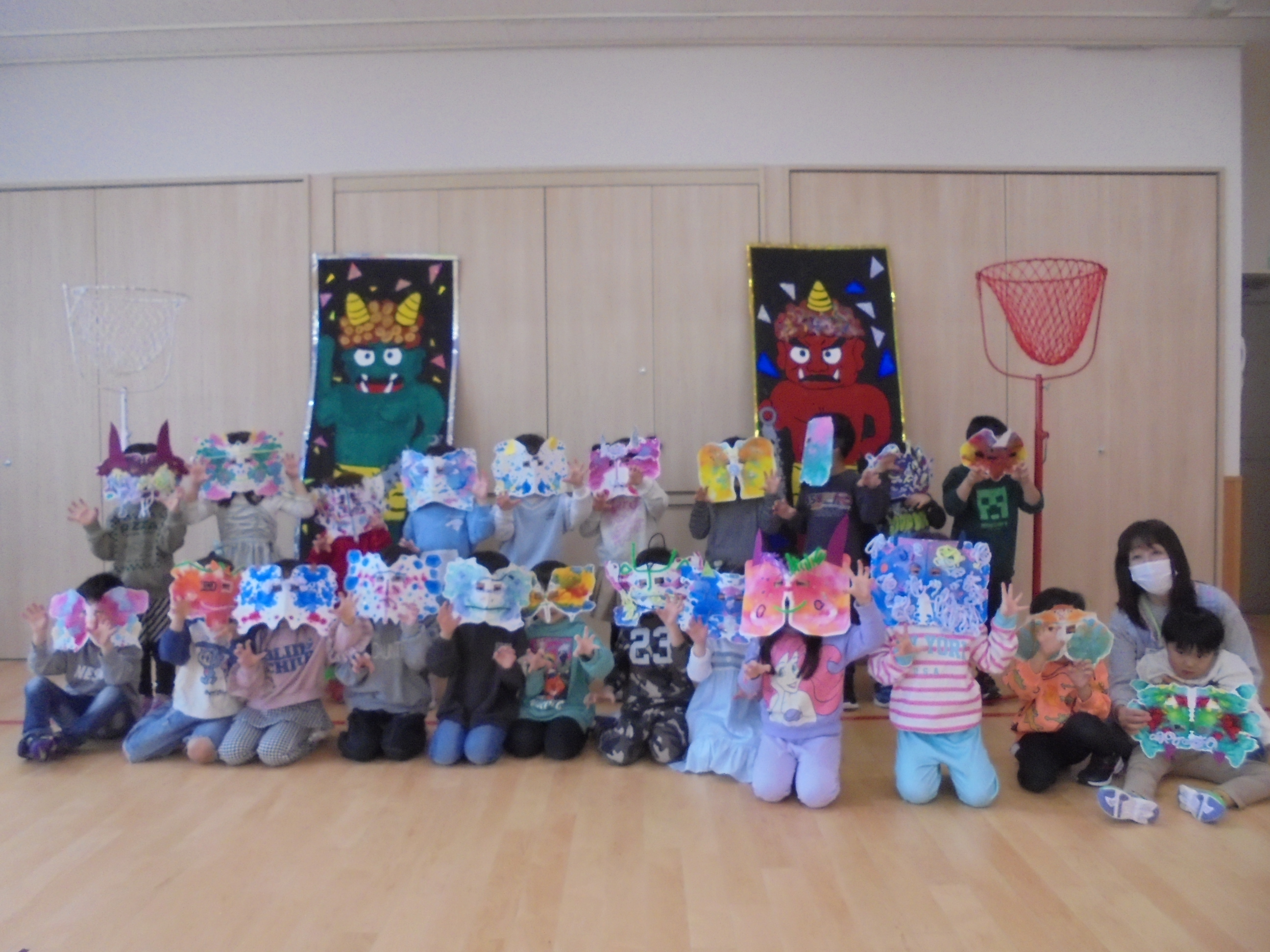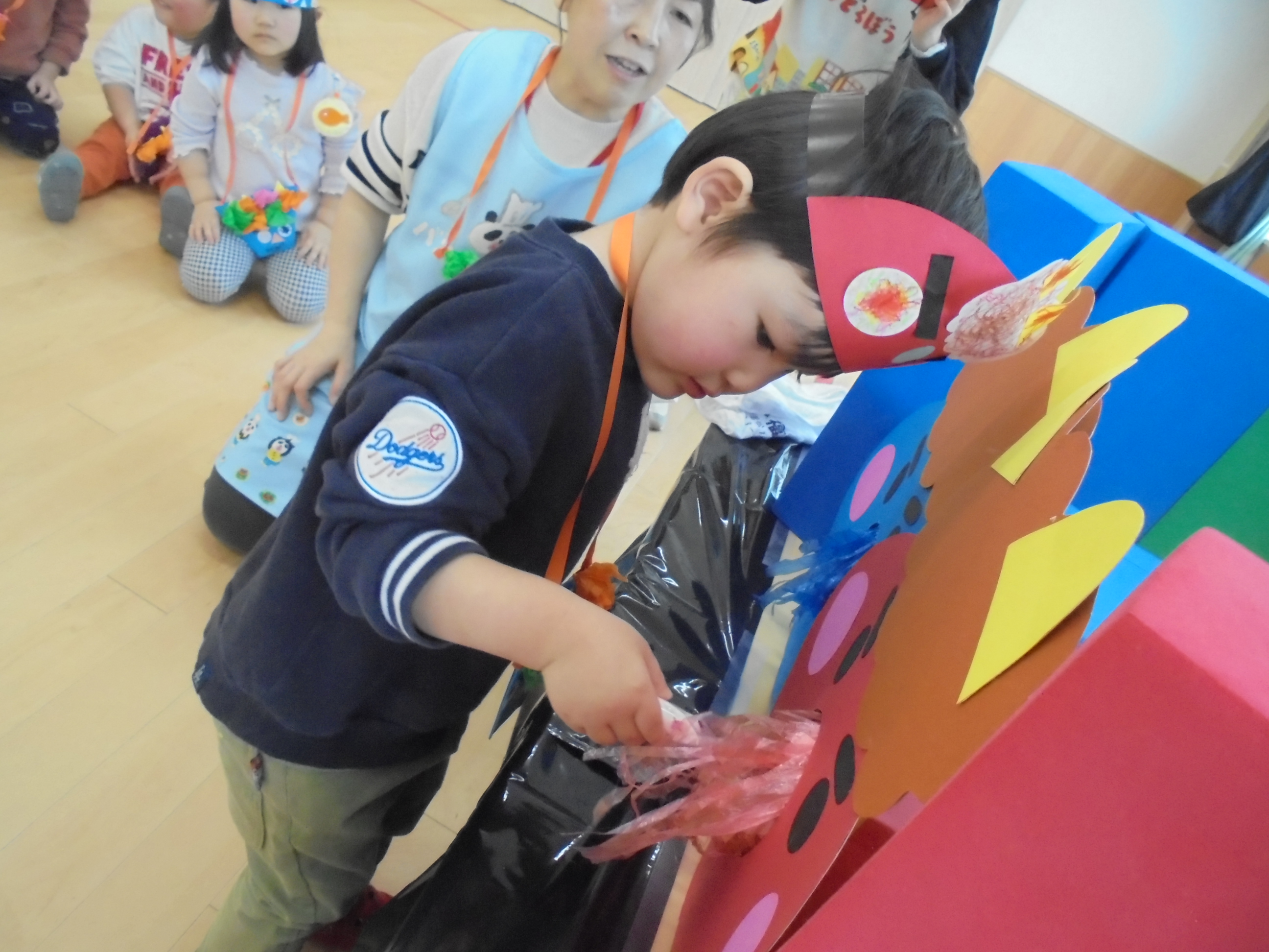今日は節分会がありました。自分たちにいる鬼を追い出そうと「オニはーそと」「福はーうち」と声を出しながら、豆の代わりにボールを投げました。また、オニの口に手を入れてお菓子をゲットしましたよ!