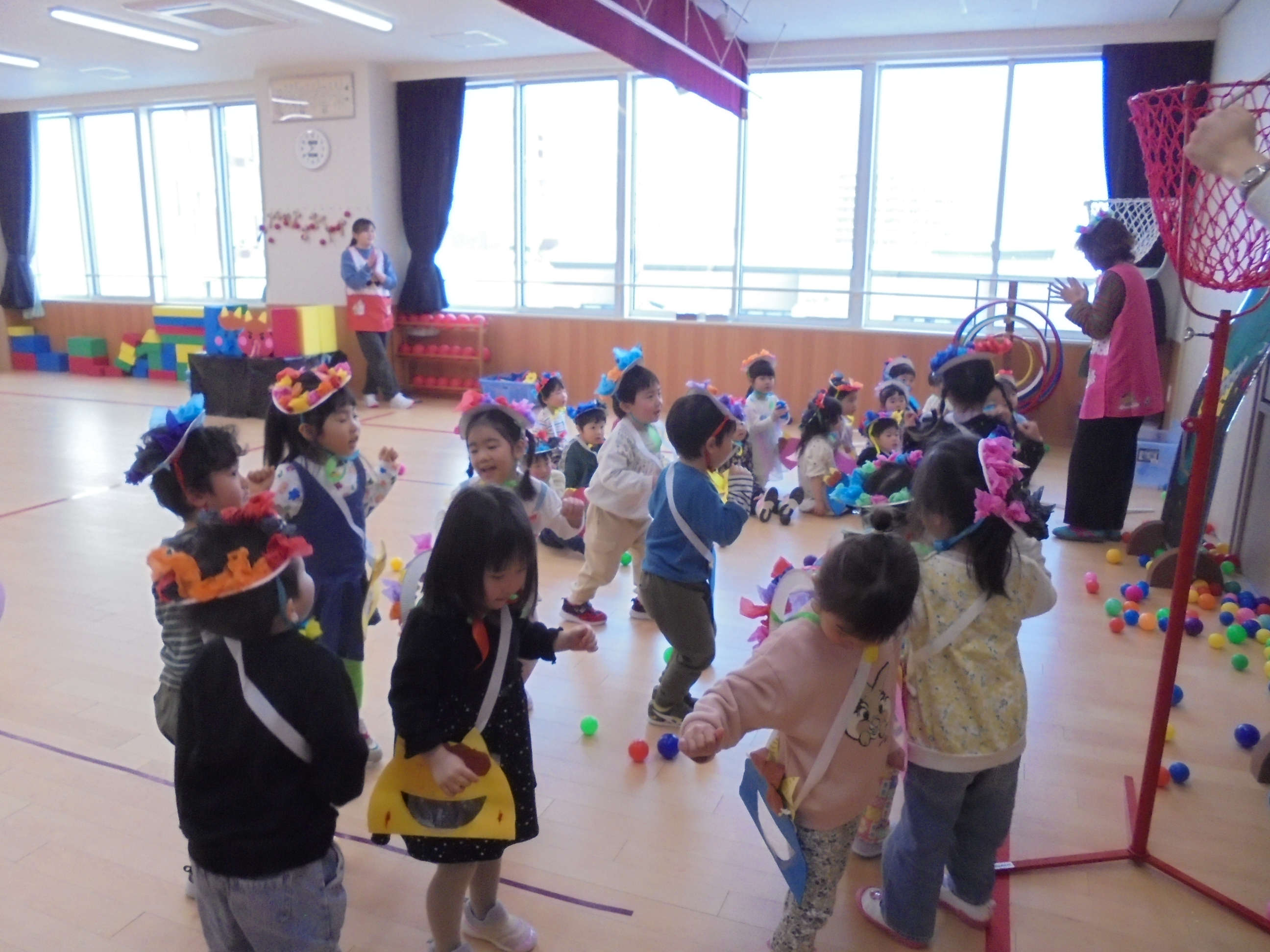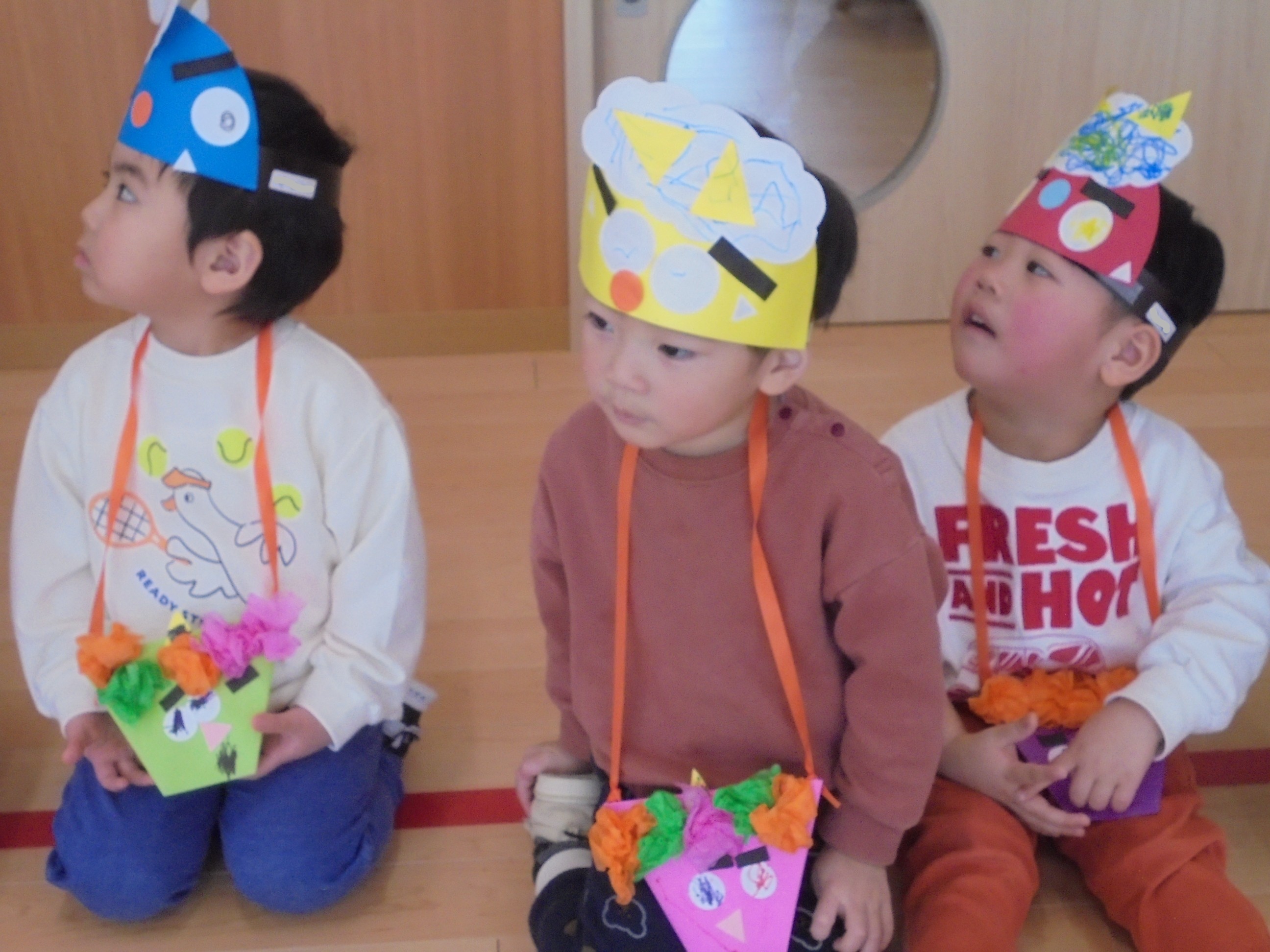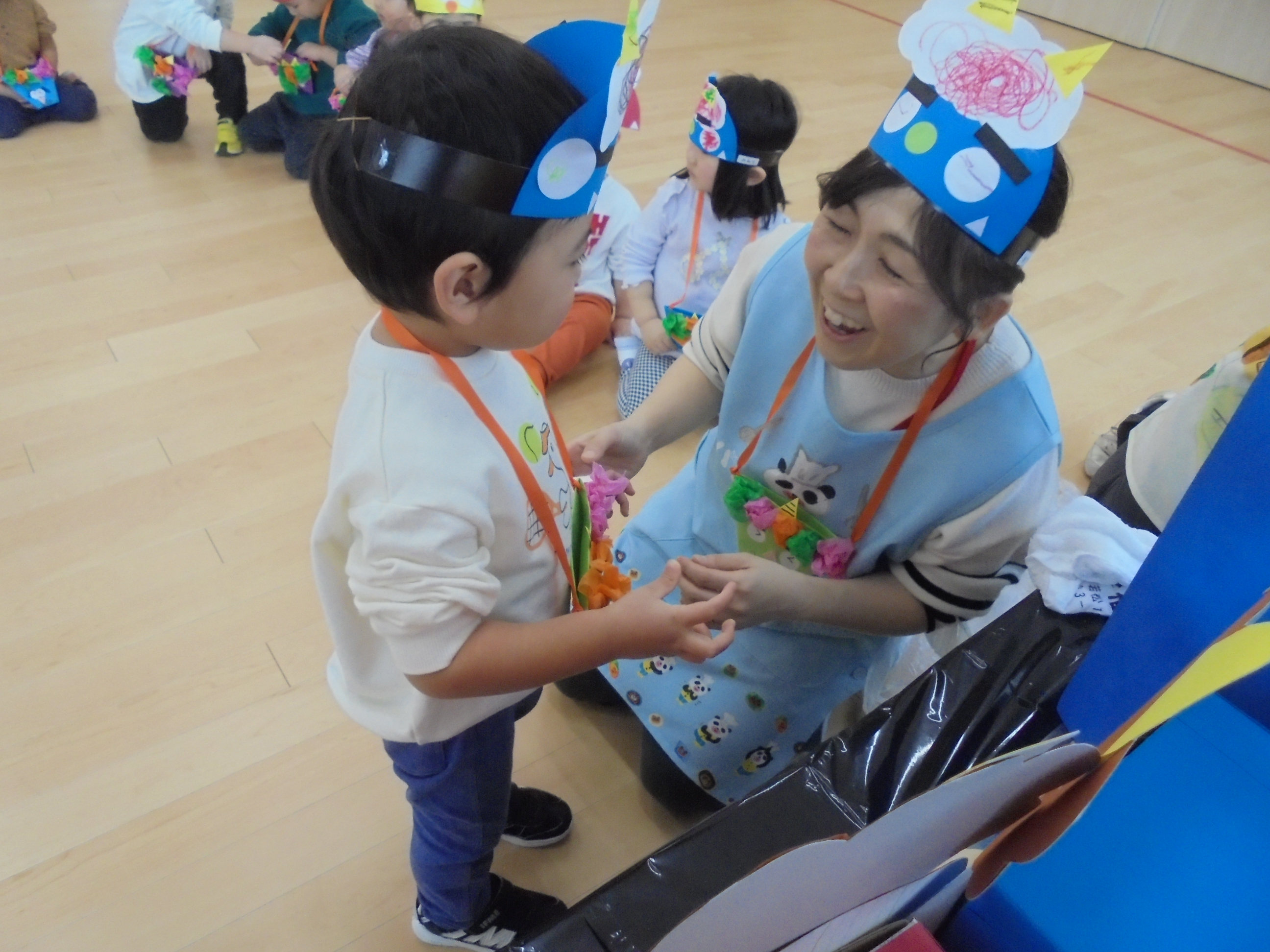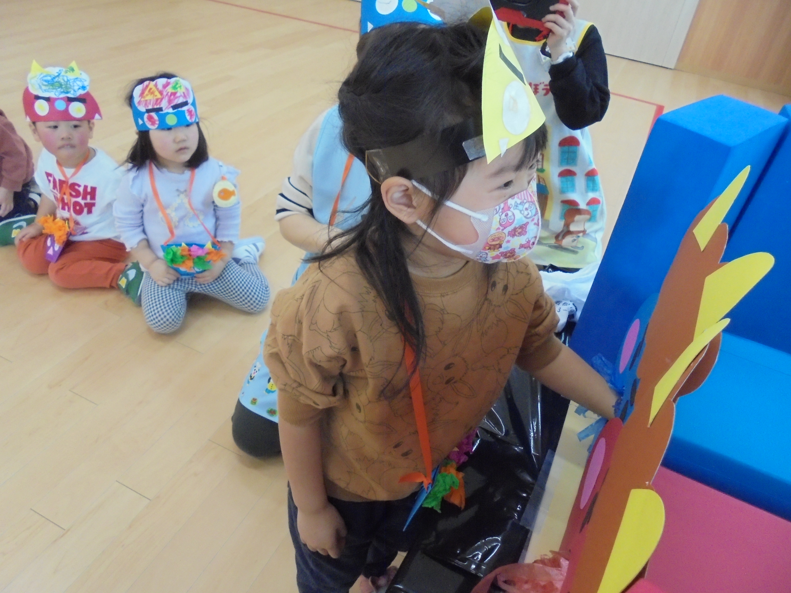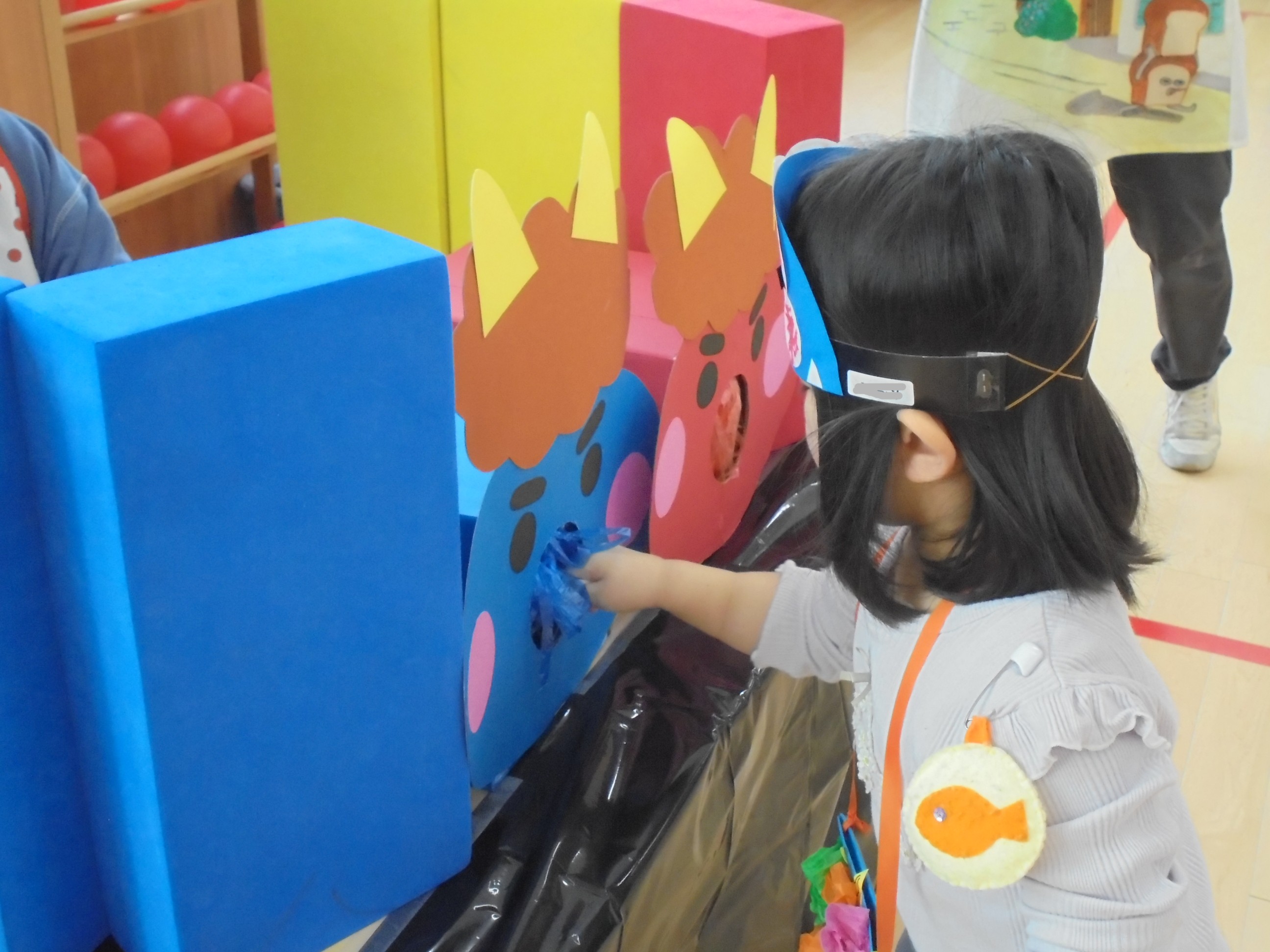 今日は節分会がありました。自分たちにいる鬼を追い出そうと「オニはーそと」「福はーうち」と声を出しながら、豆の代わりにボールを投げました。また、オニの口に手を入れてお菓子をゲットしましたよ!