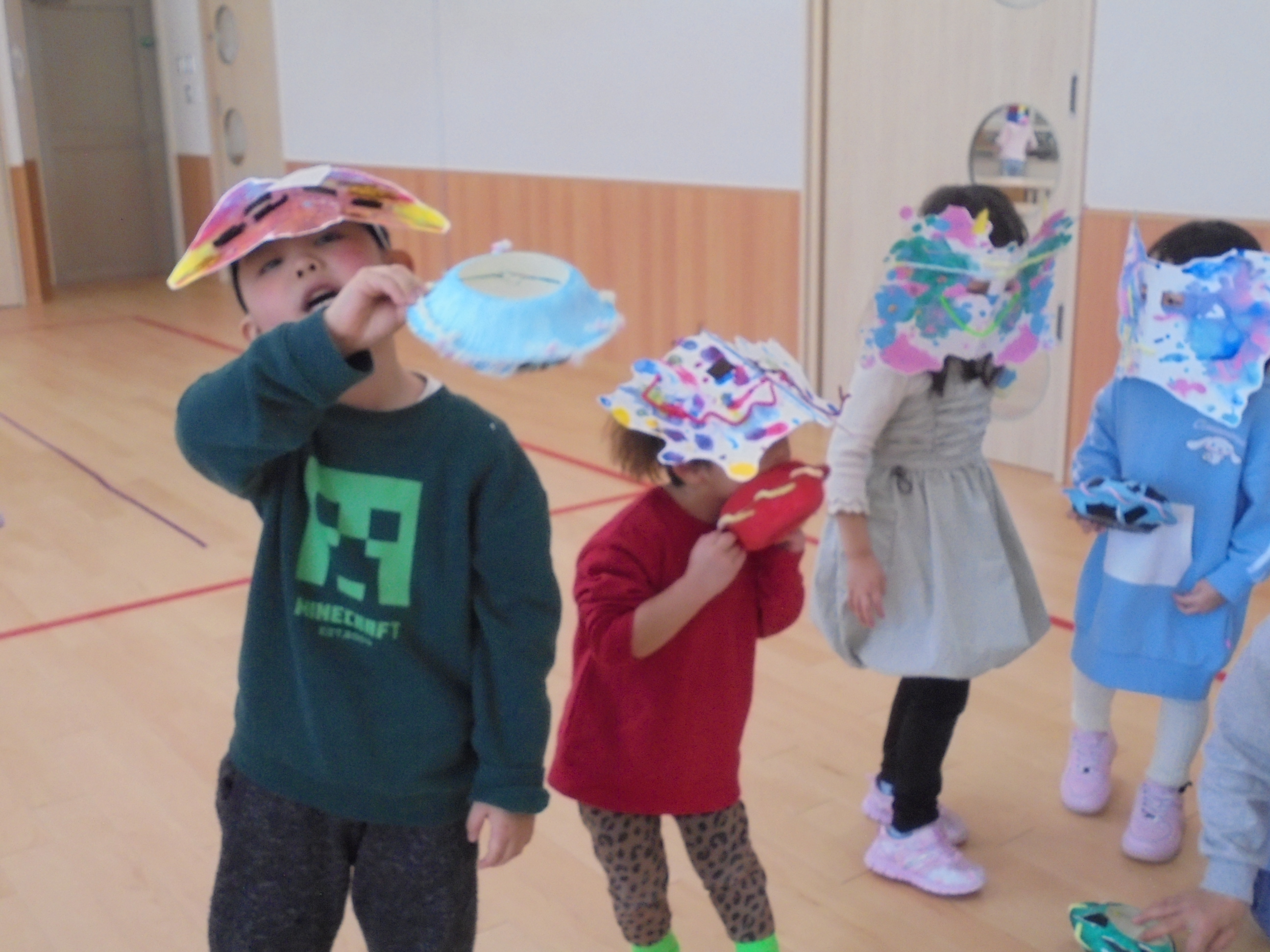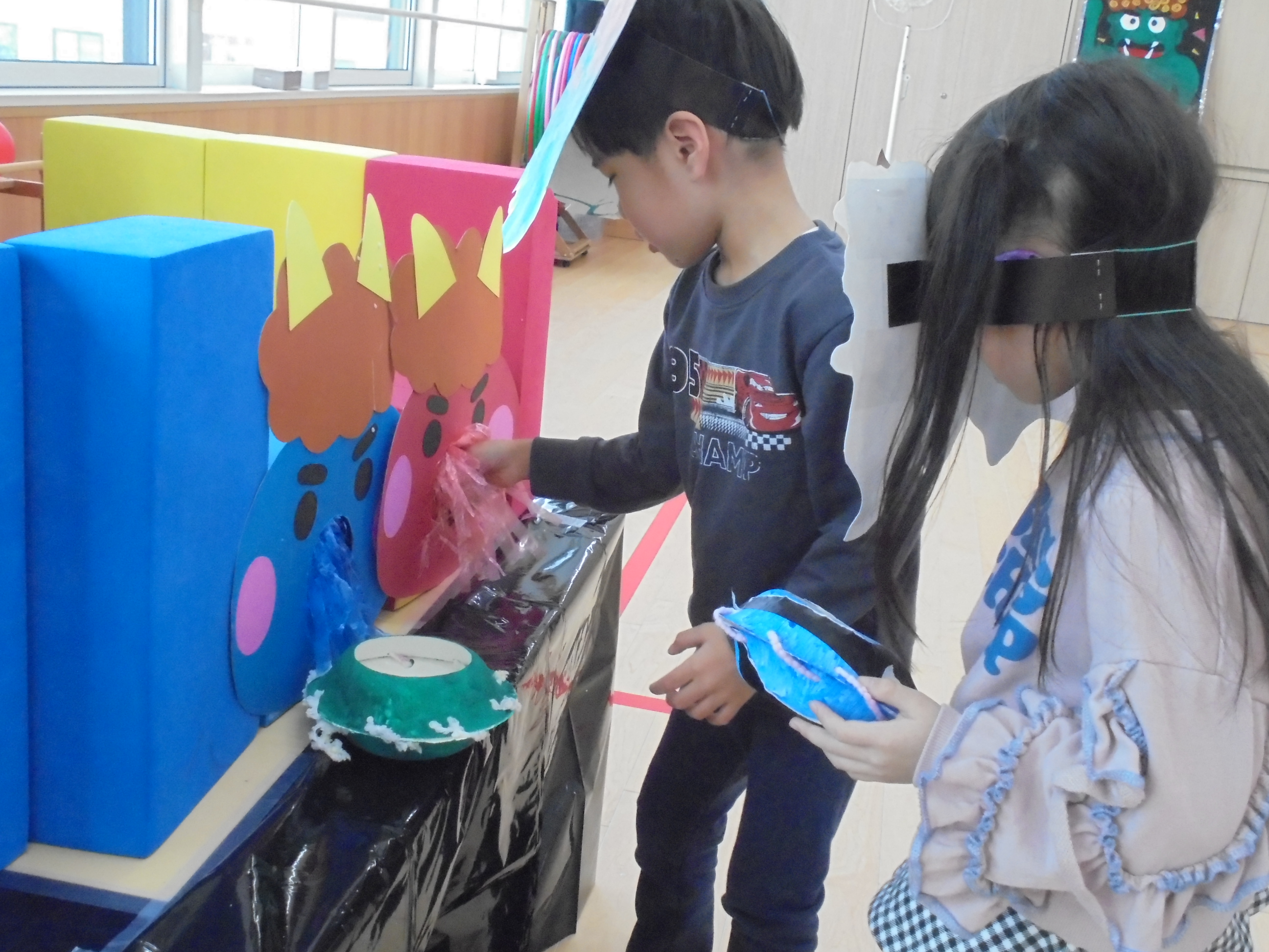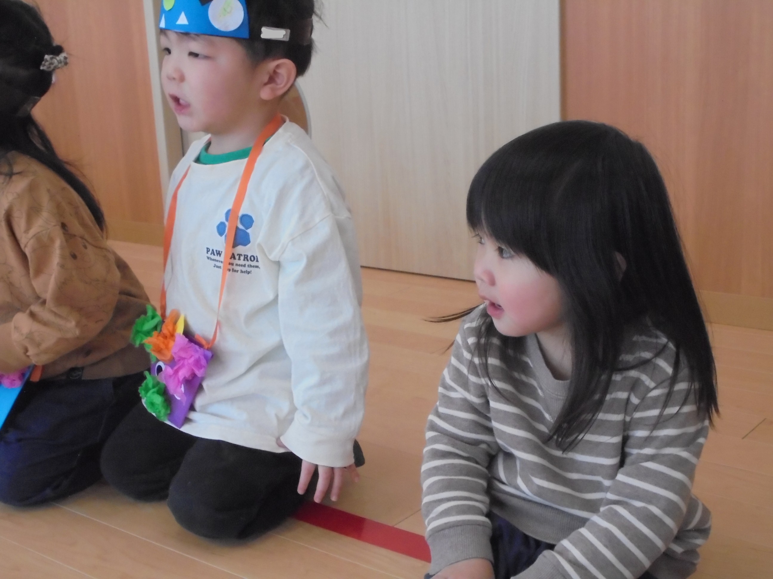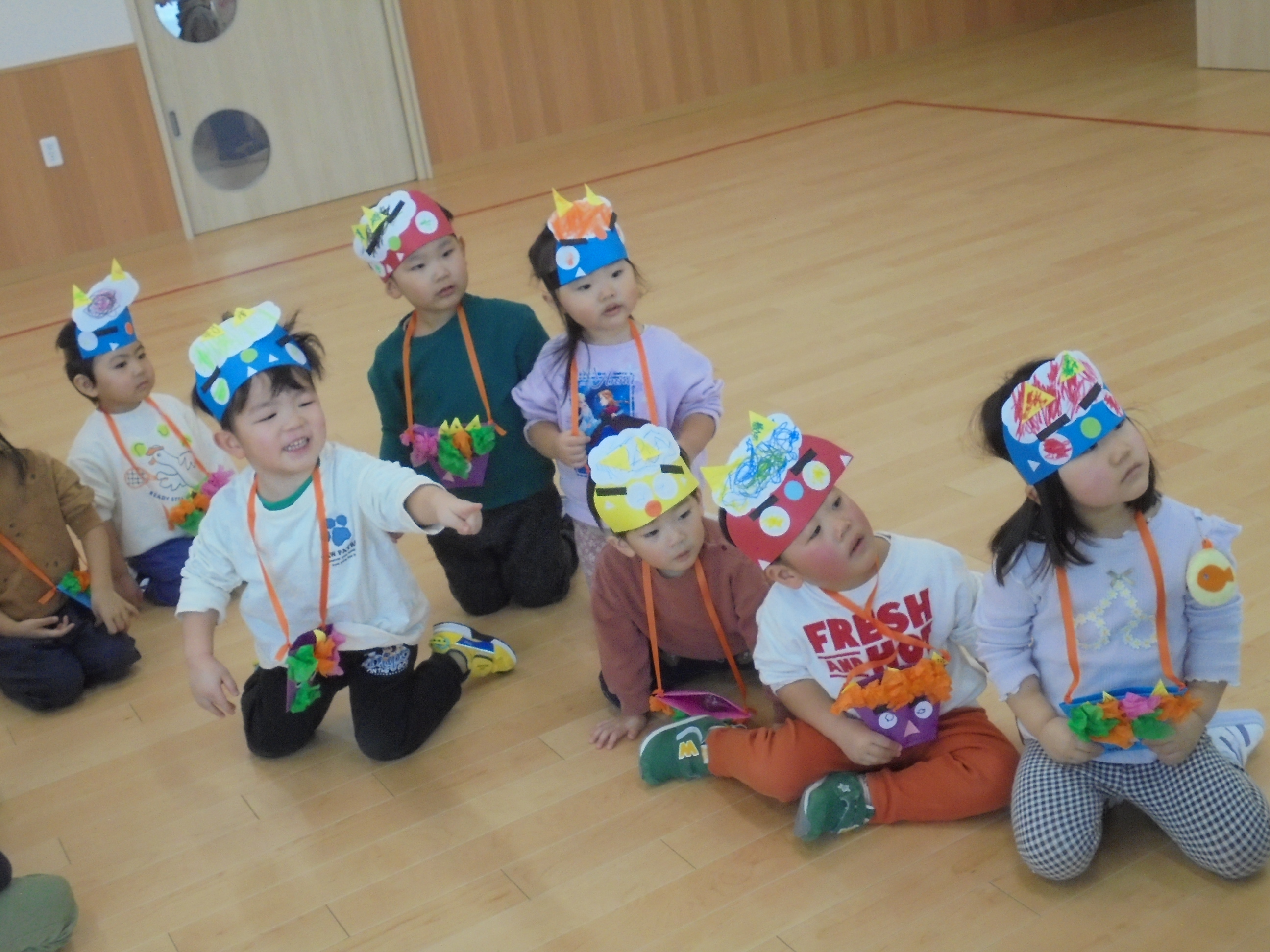 今日は節分会がありました。自分たちにいる鬼を追い出そうと「オニはーそと」「福はーうち」と声を出しながら、豆の代わりにボールを投げました。また、オニの口に手を入れてお菓子をゲットしましたよ!