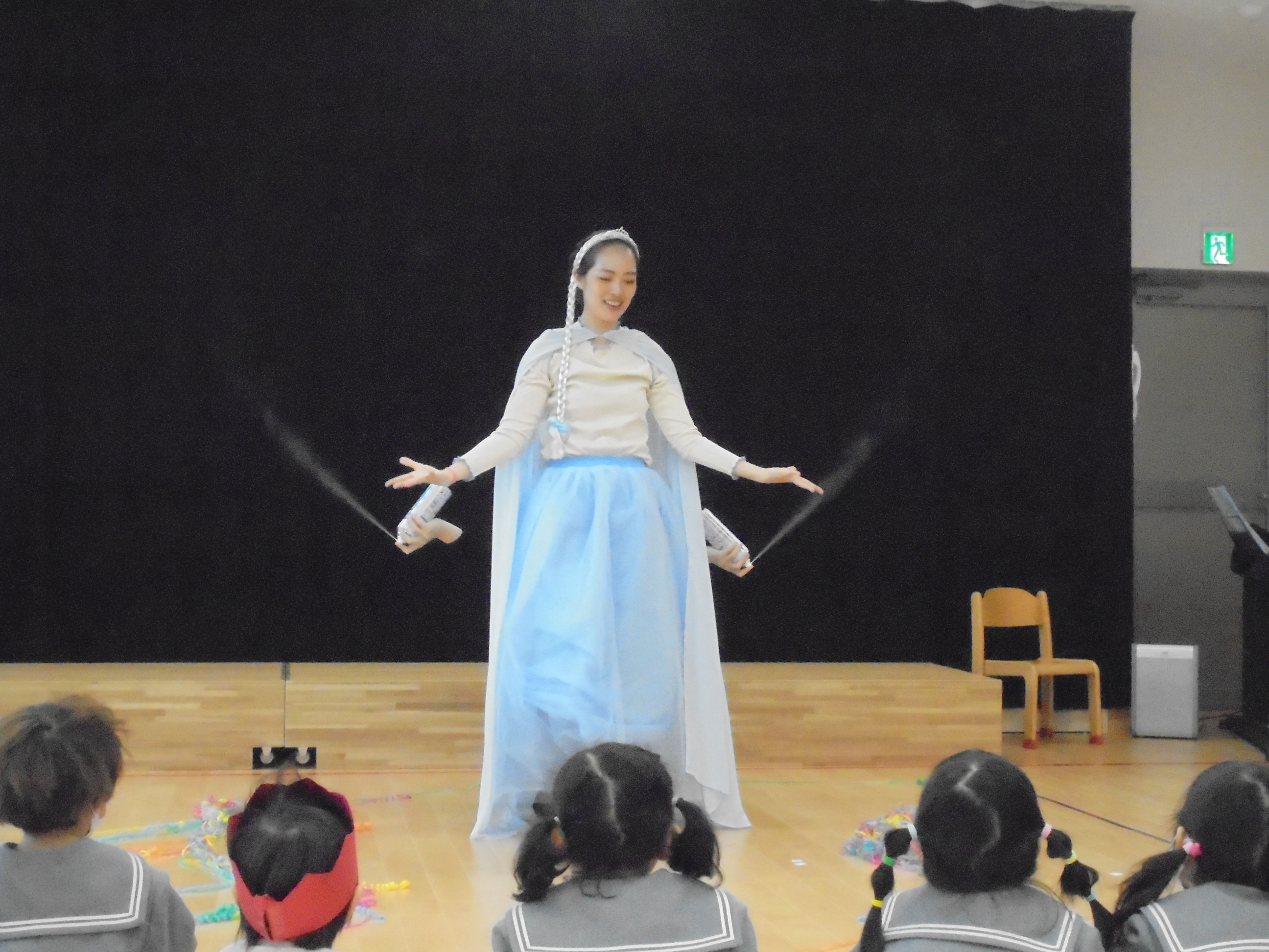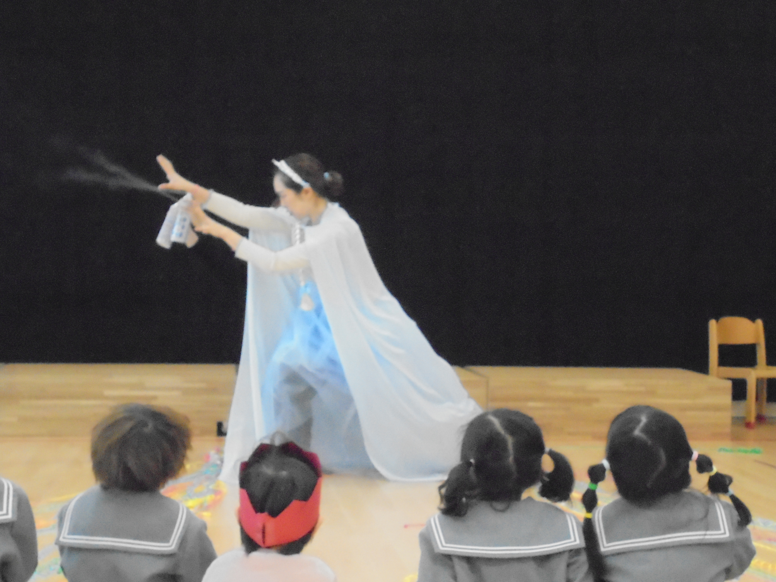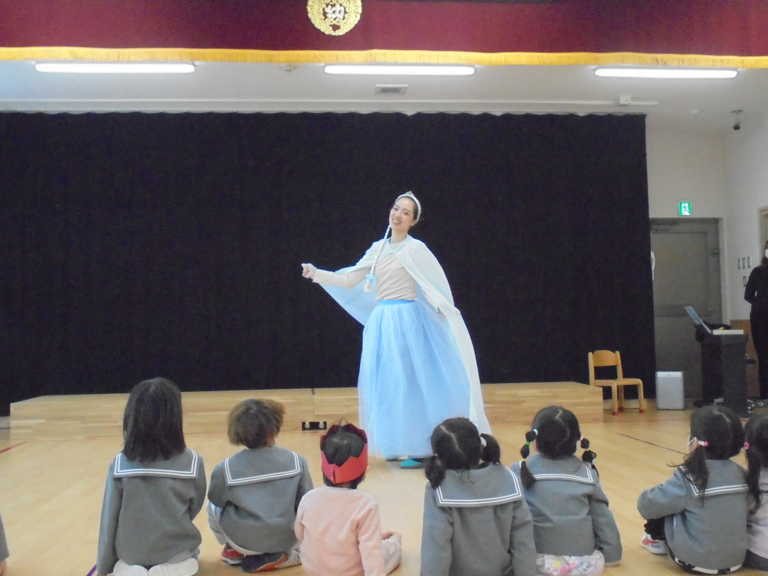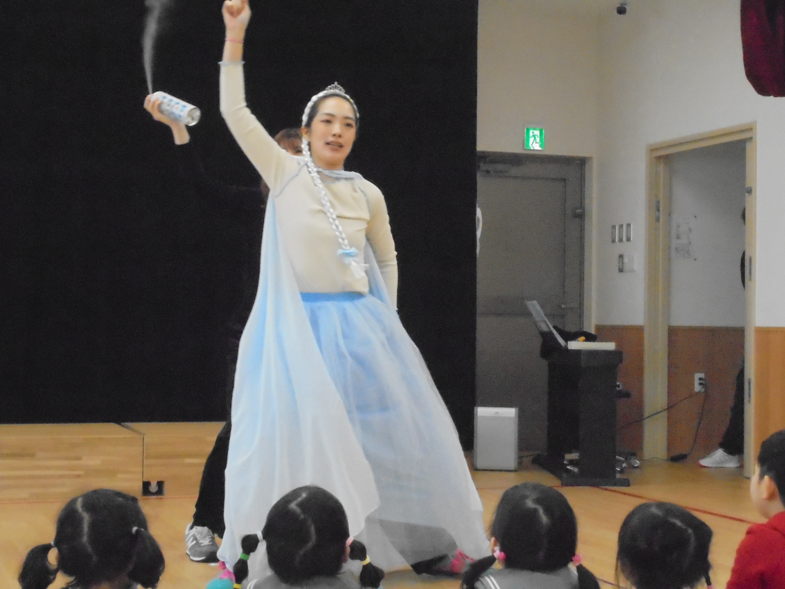 感染症のため延期になっていた1月のお誕生会を行いました。先生たちからの贈り物で「エルサ」が登場し、楽しいひと時を過ごしました! いるか組ではアイスキャンドル作りに挑戦していましたよ。