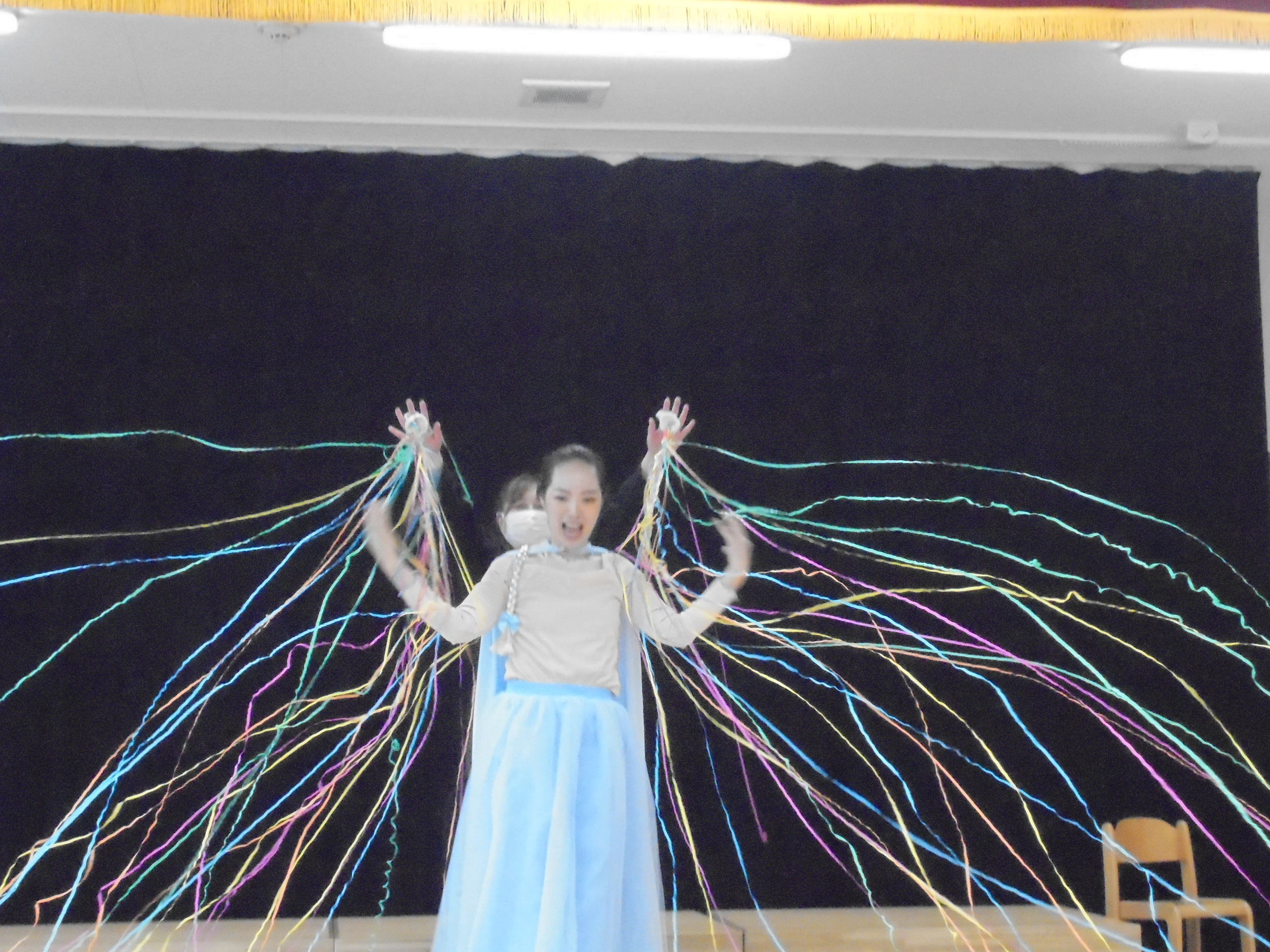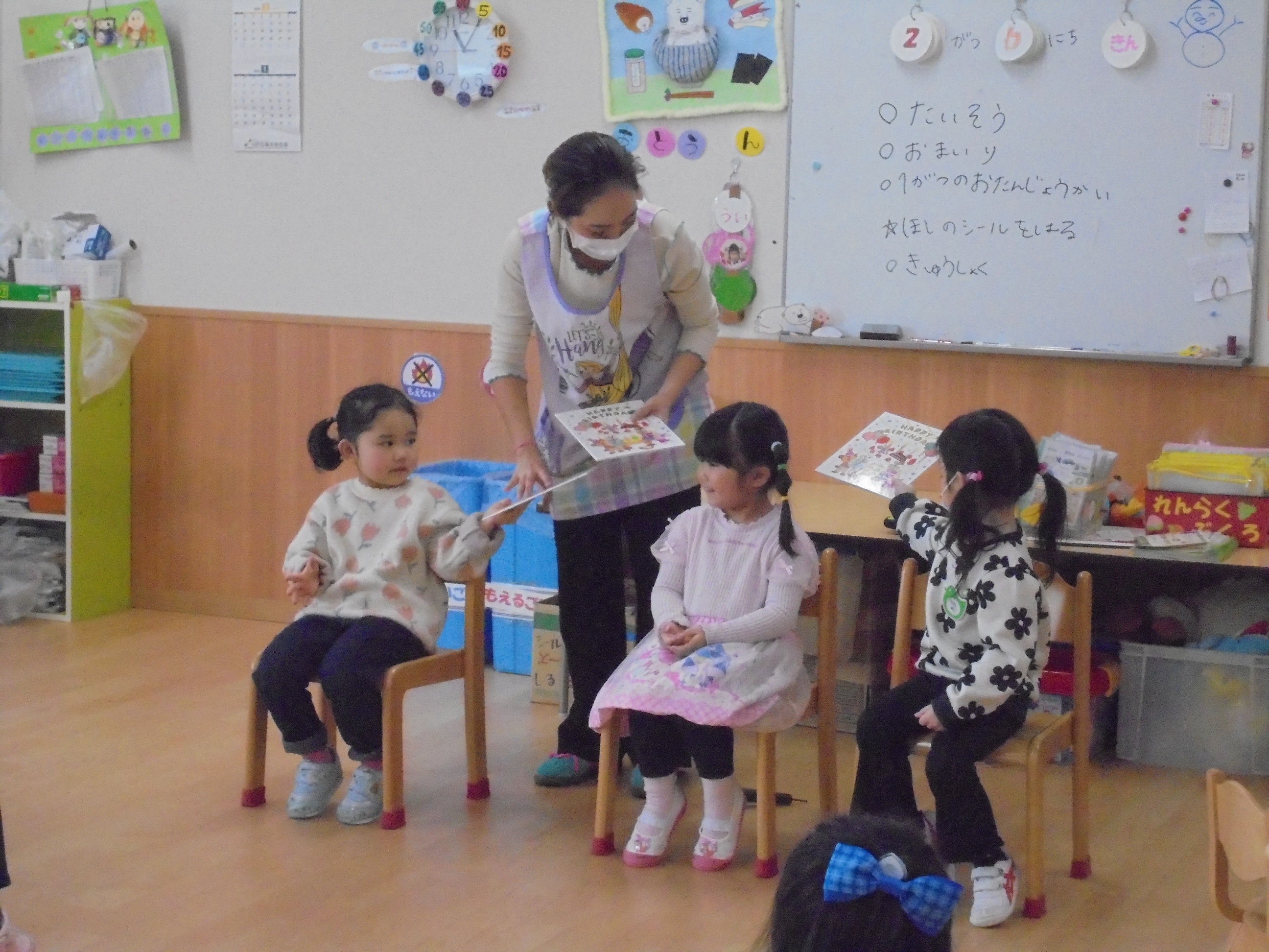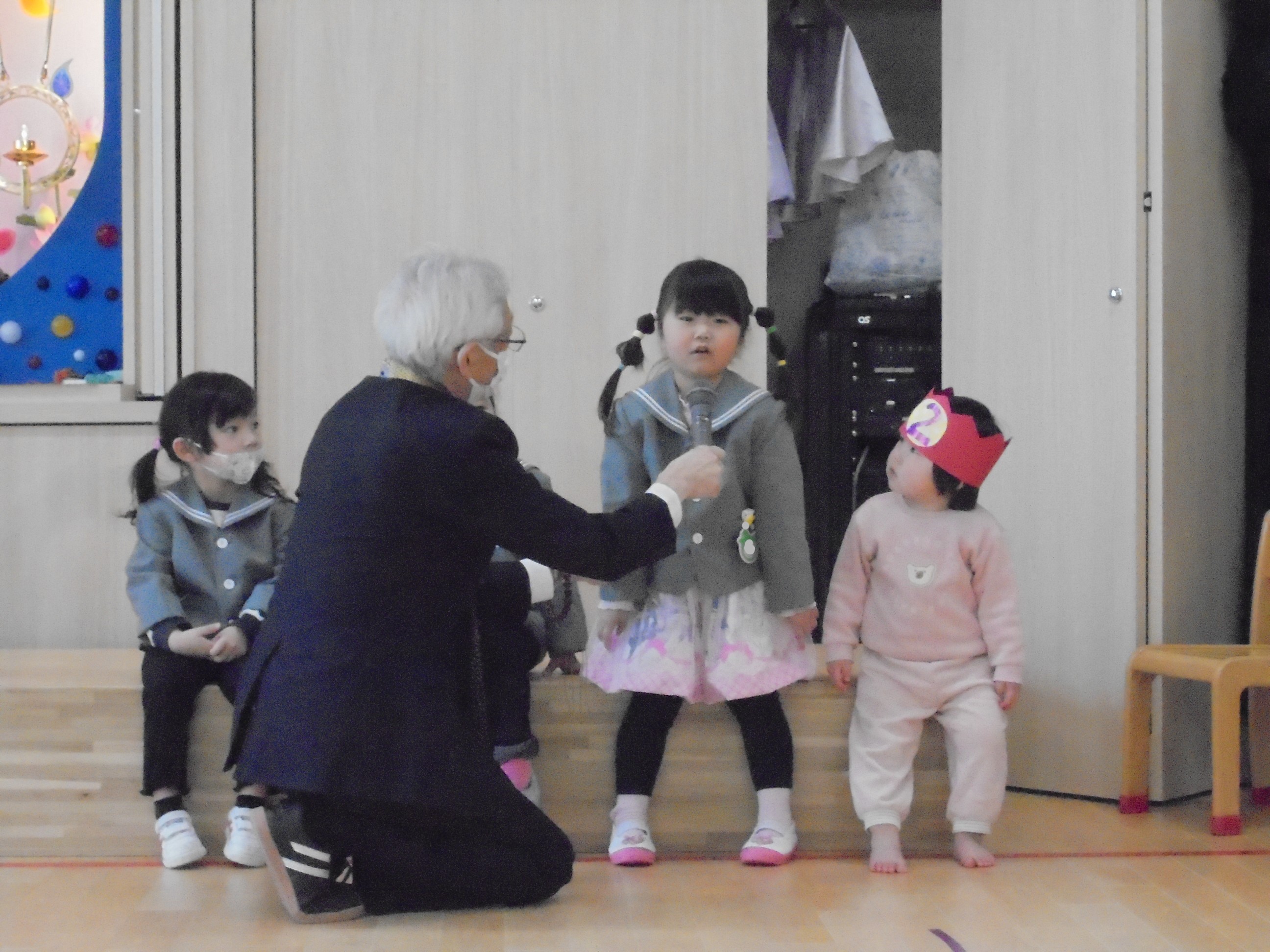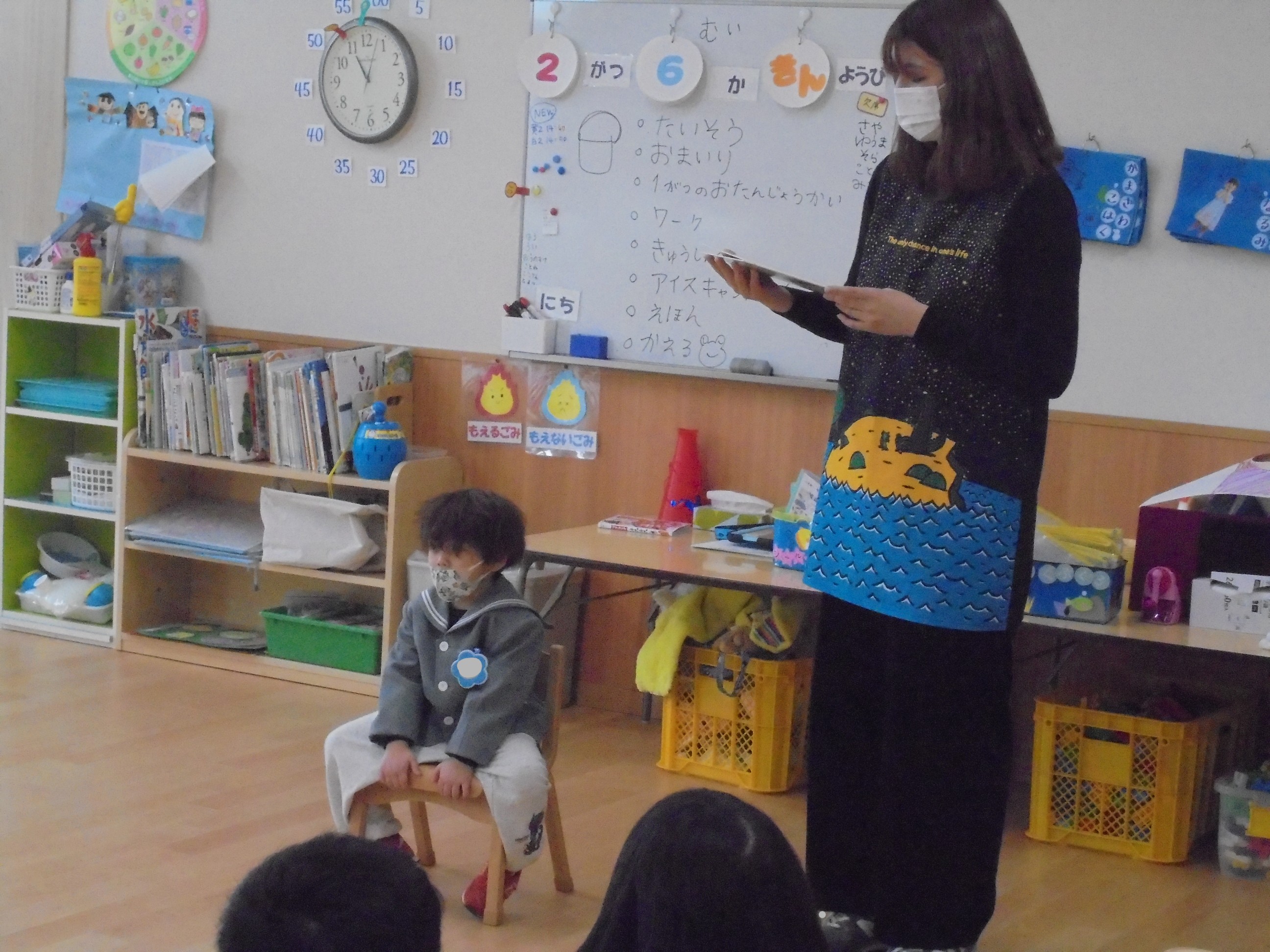 感染症のため延期になっていた1月のお誕生会を行いました。先生たちからの贈り物で「エルサ」が登場し、楽しいひと時を過ごしました! いるか組ではアイスキャンドル作りに挑戦していましたよ。