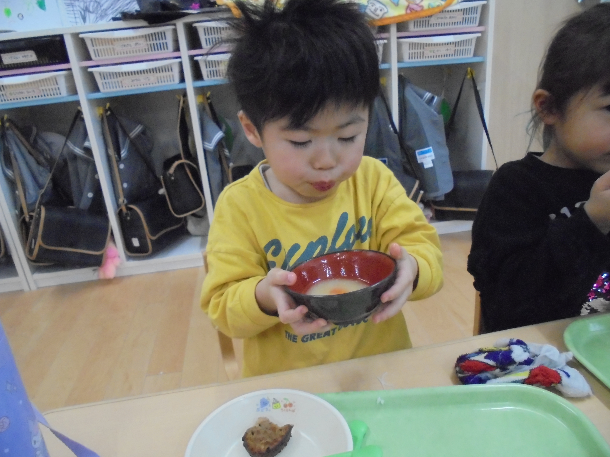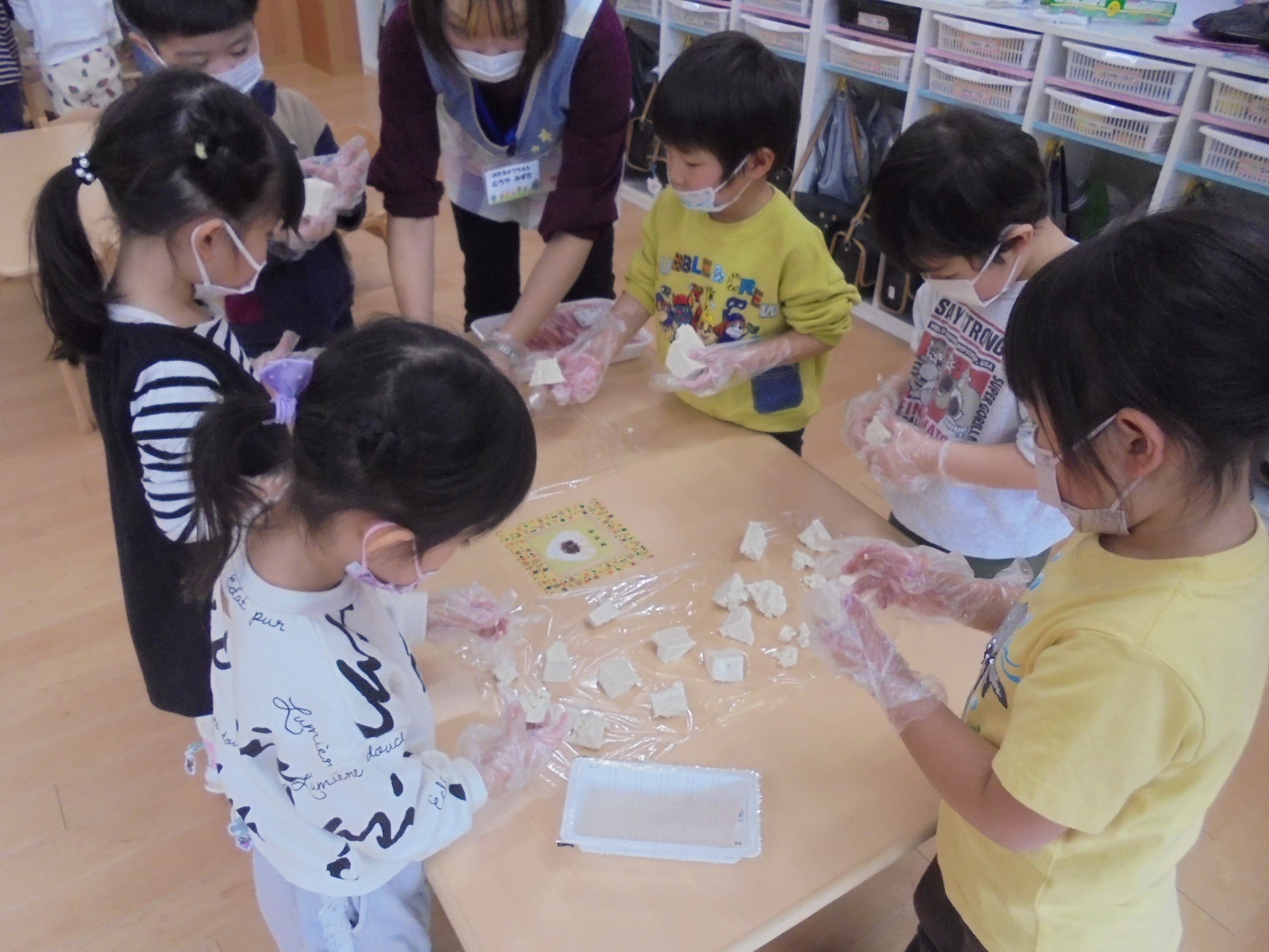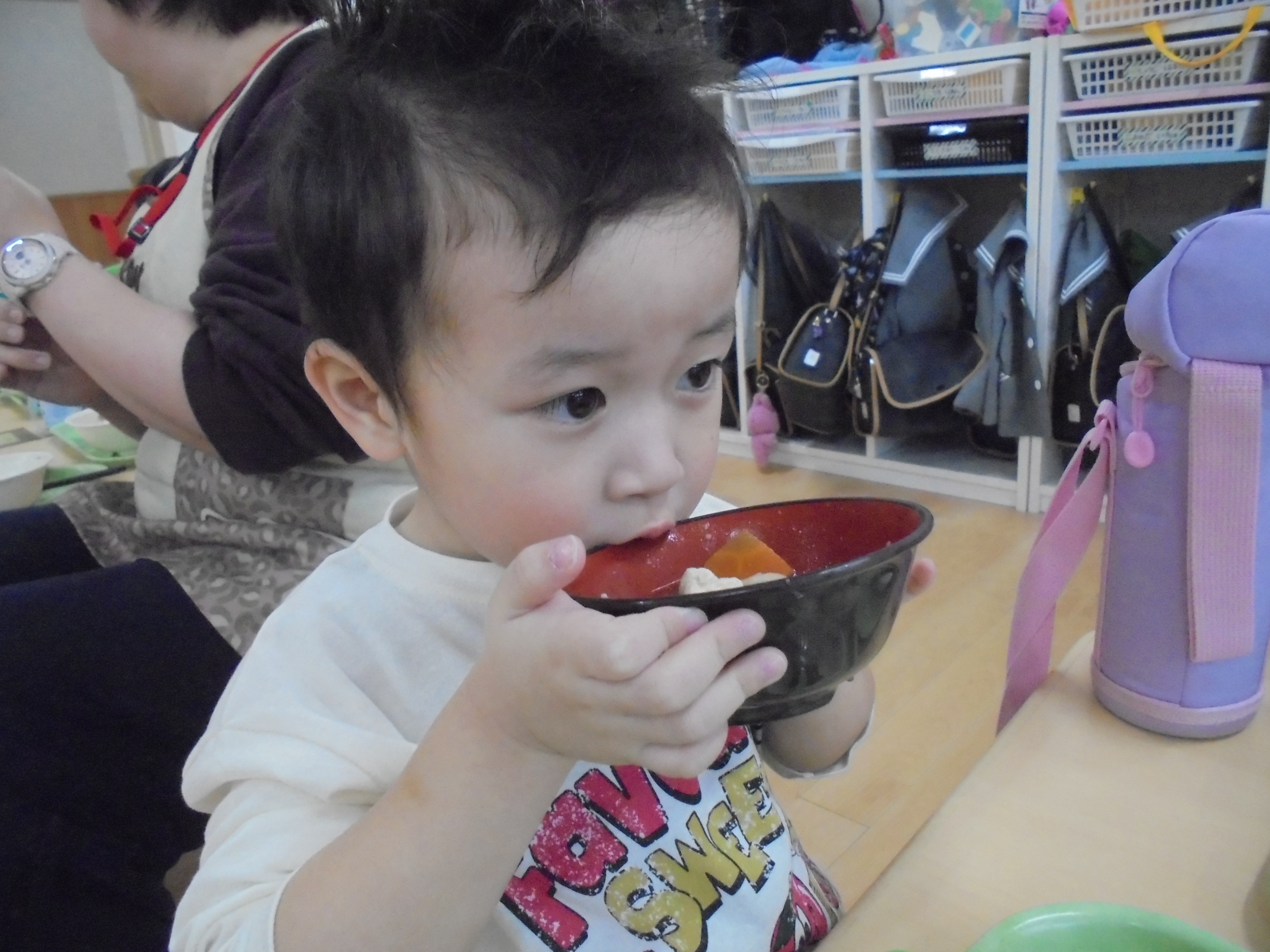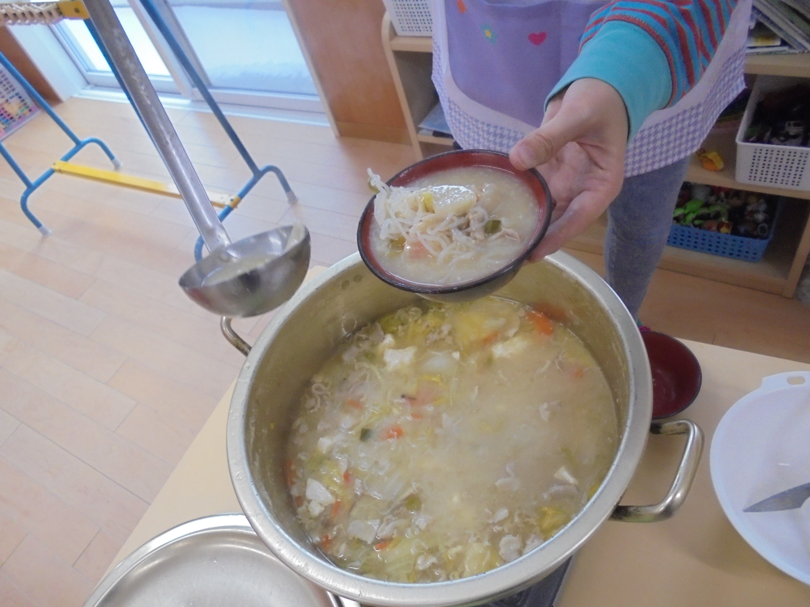 今日は、あざらし組で豚汁を作って食べました。11月に自分たちで作ったお味噌を使って作りました。とっても美味しかったですよ。お味噌は少しずつ持ち帰りました。年中さん年長さんの制作の様子や、いるか組の雪遊びの様子もご覧ください。