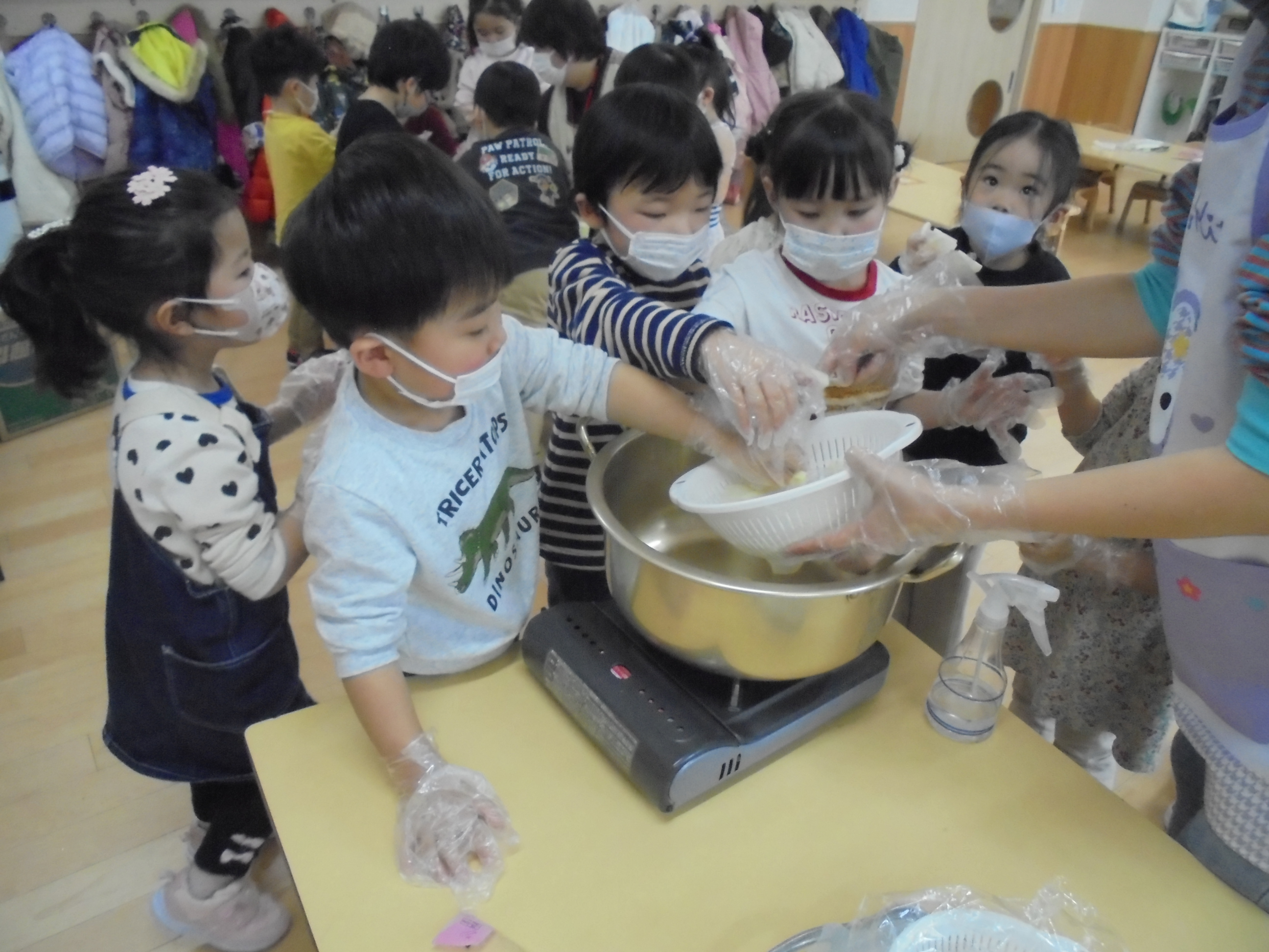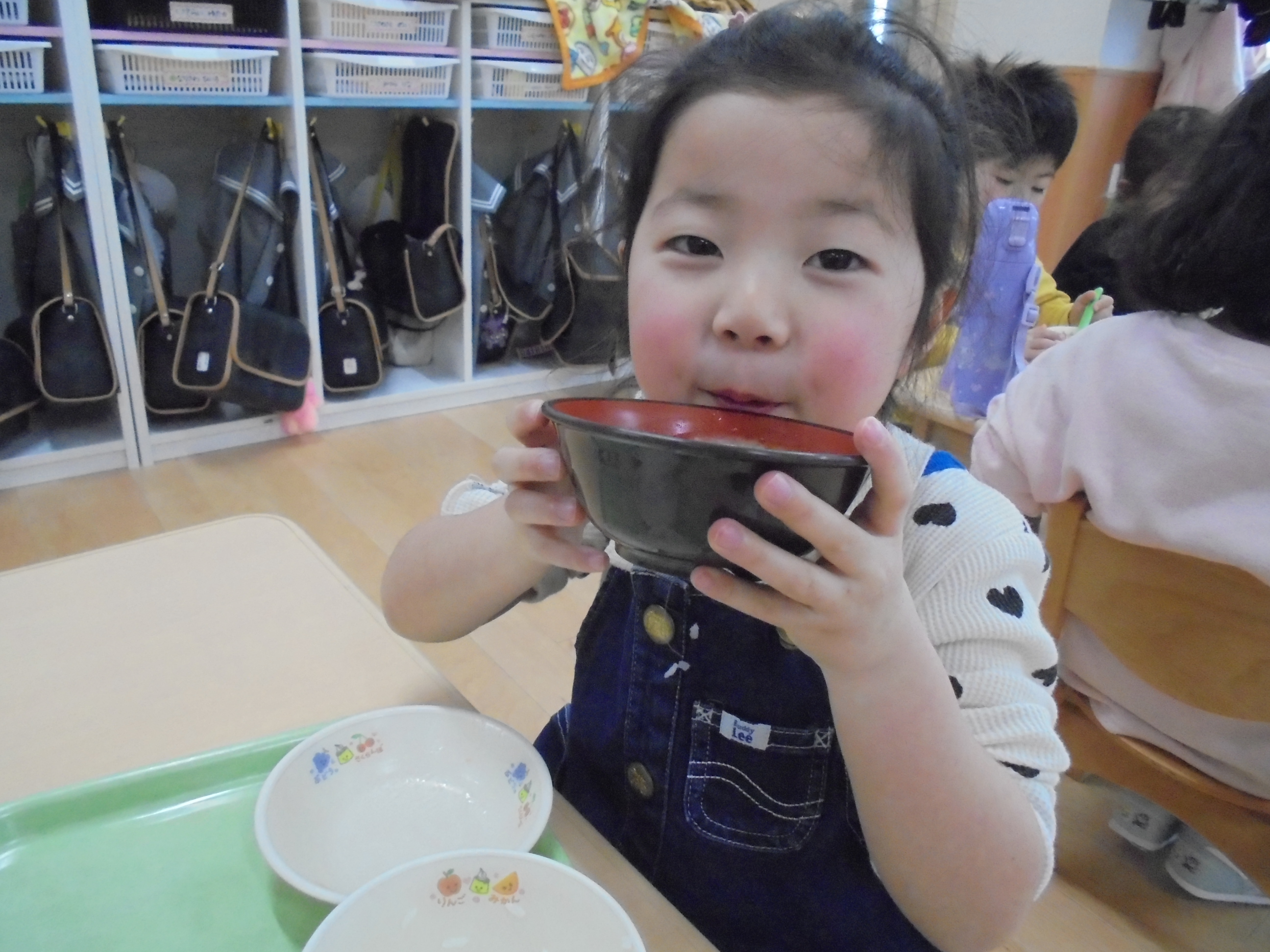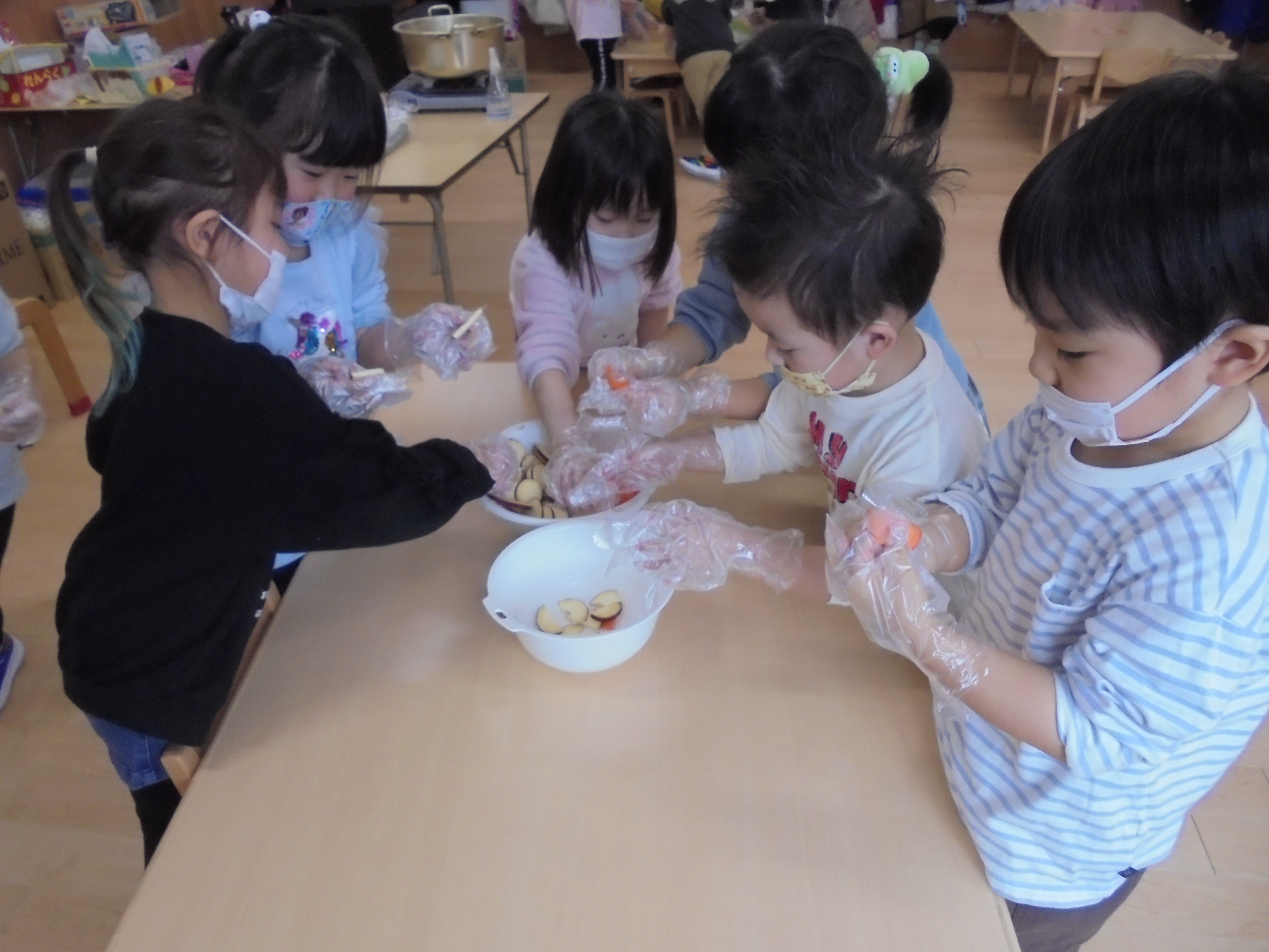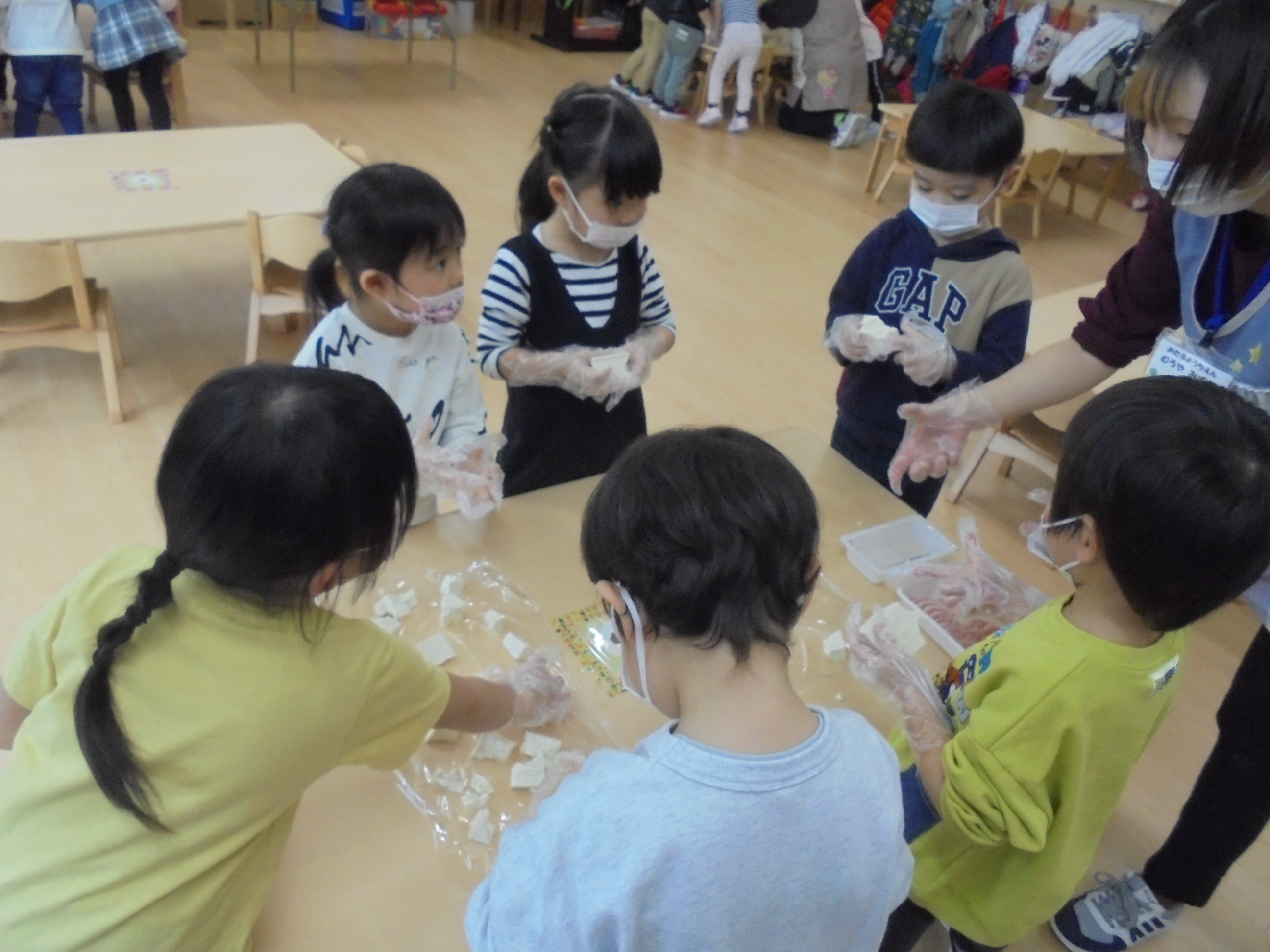 今日は、あざらし組で豚汁を作って食べました。11月に自分たちで作ったお味噌を使って作りました。とっても美味しかったですよ。お味噌は少しずつ持ち帰りました。年中さん年長さんの制作の様子や、いるか組の雪遊びの様子もご覧ください。