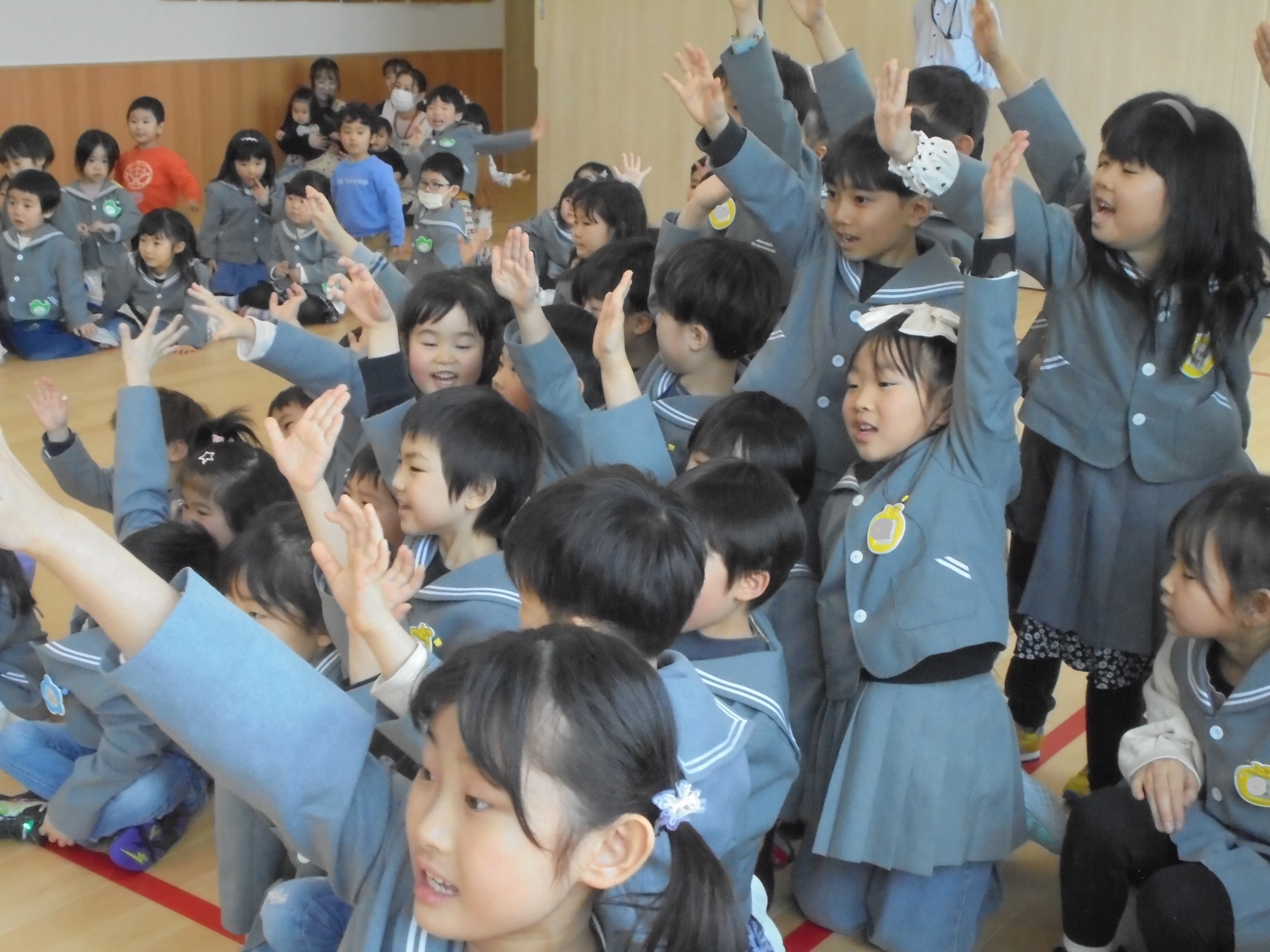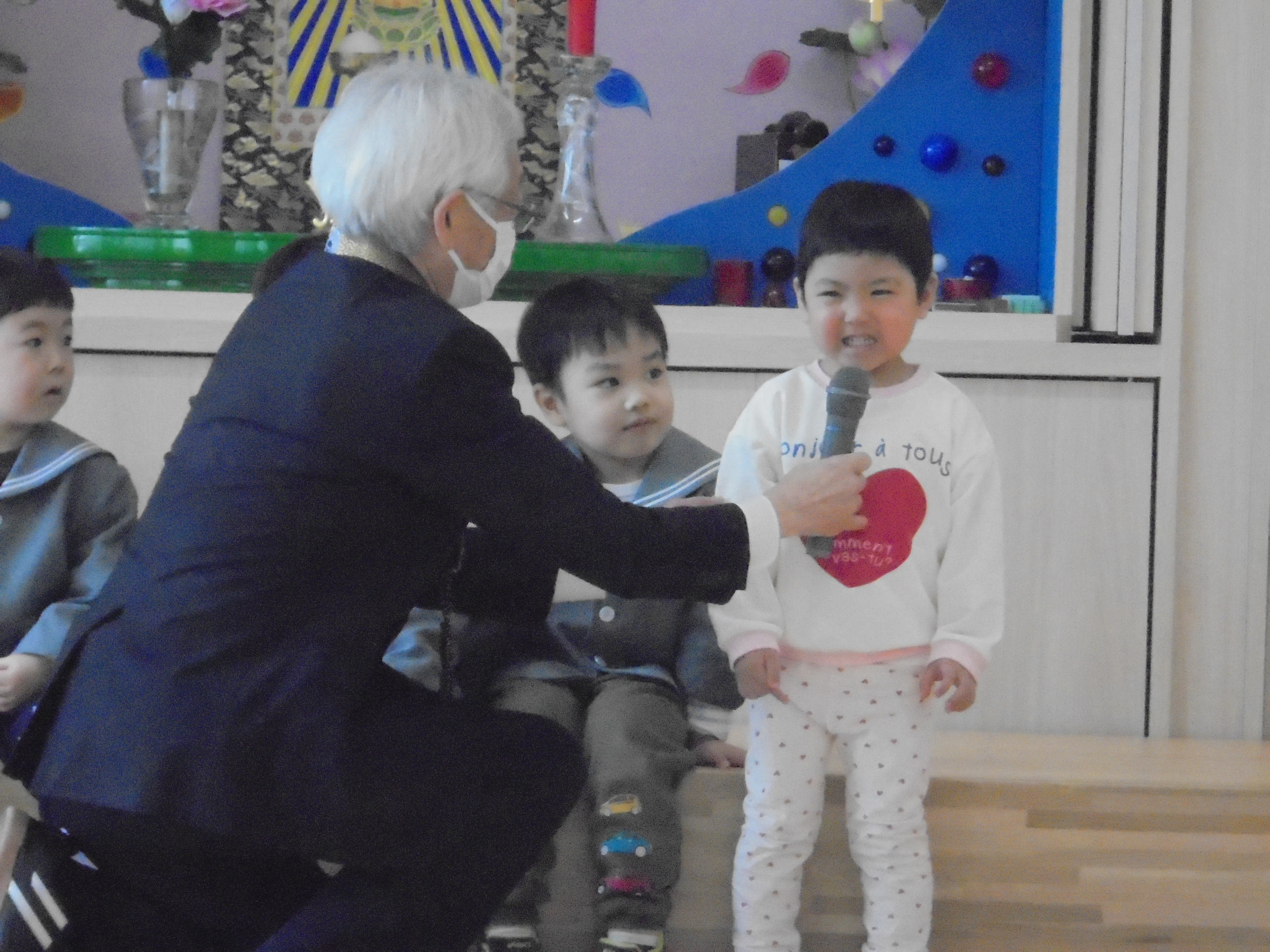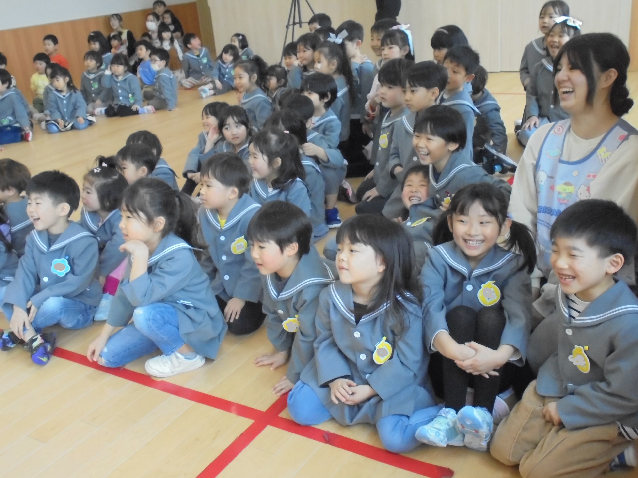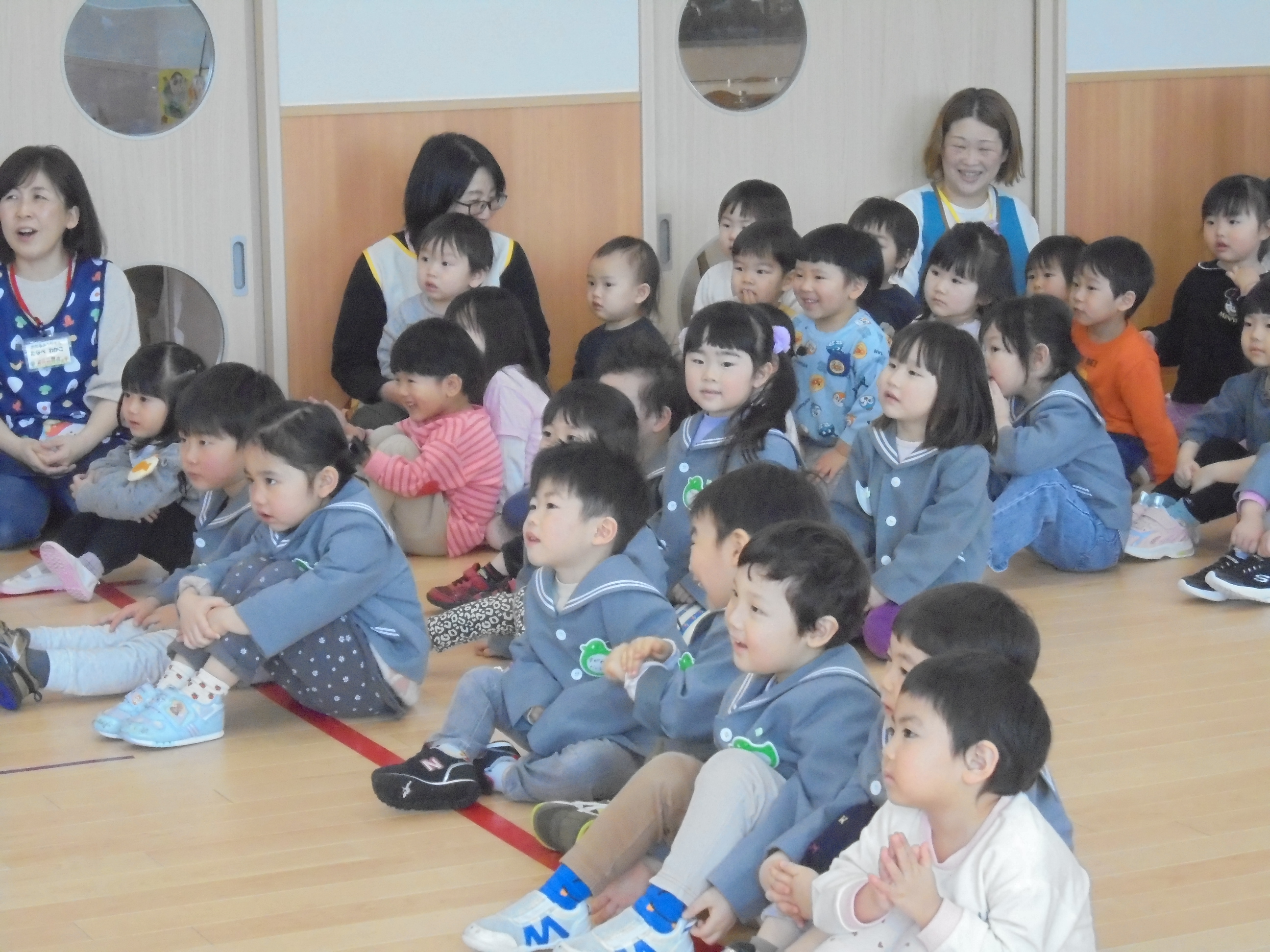 今日は3月のお誕生会でした。インタビューではどんな遊びが好きかはっきり言えてましたよ。先生たちからの贈り物は、先生当てクイズでした。(^^)/