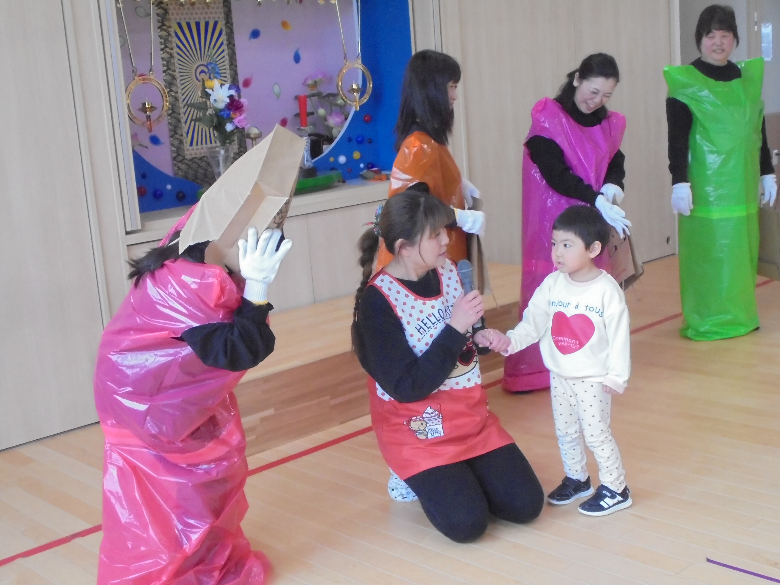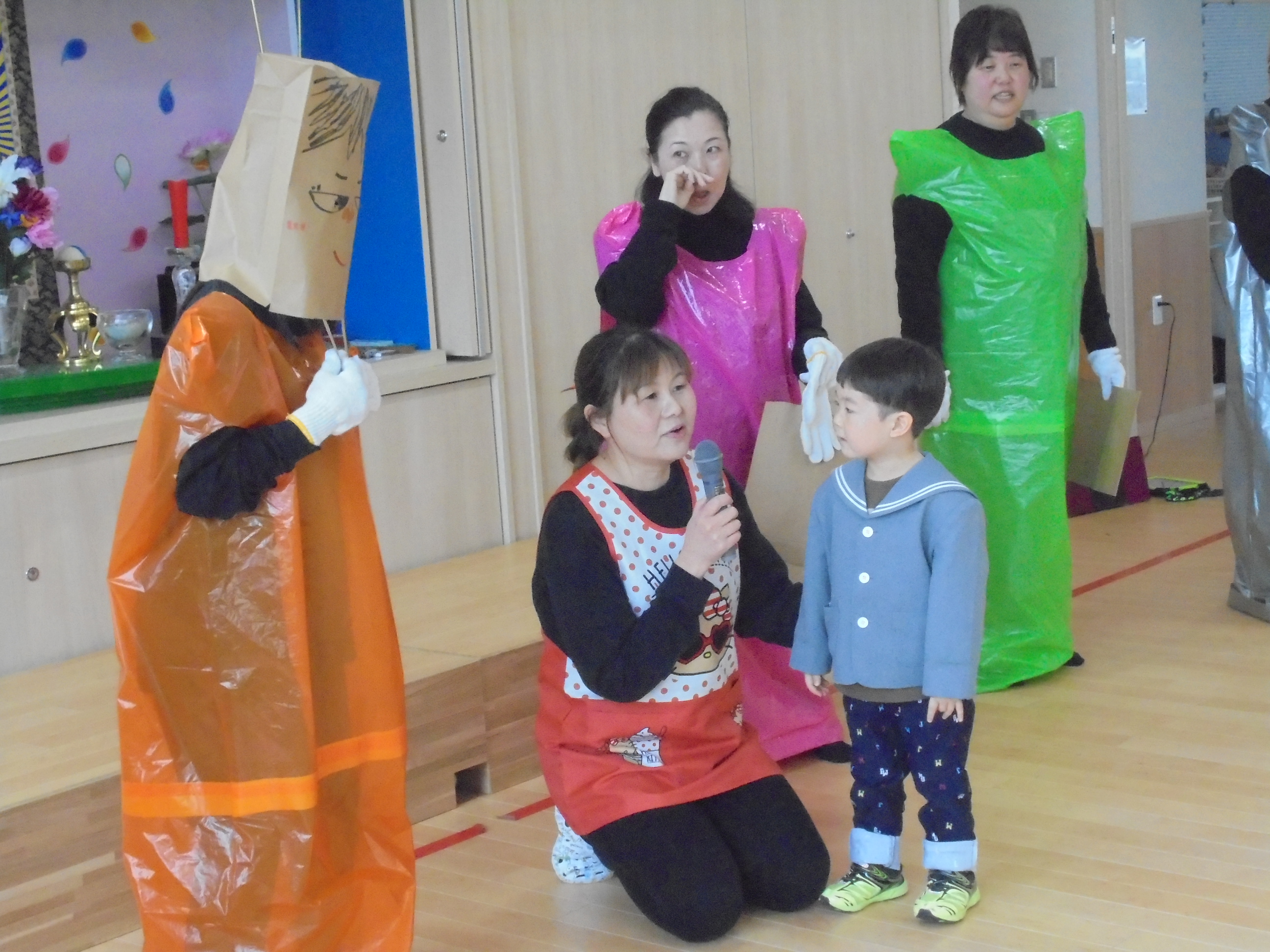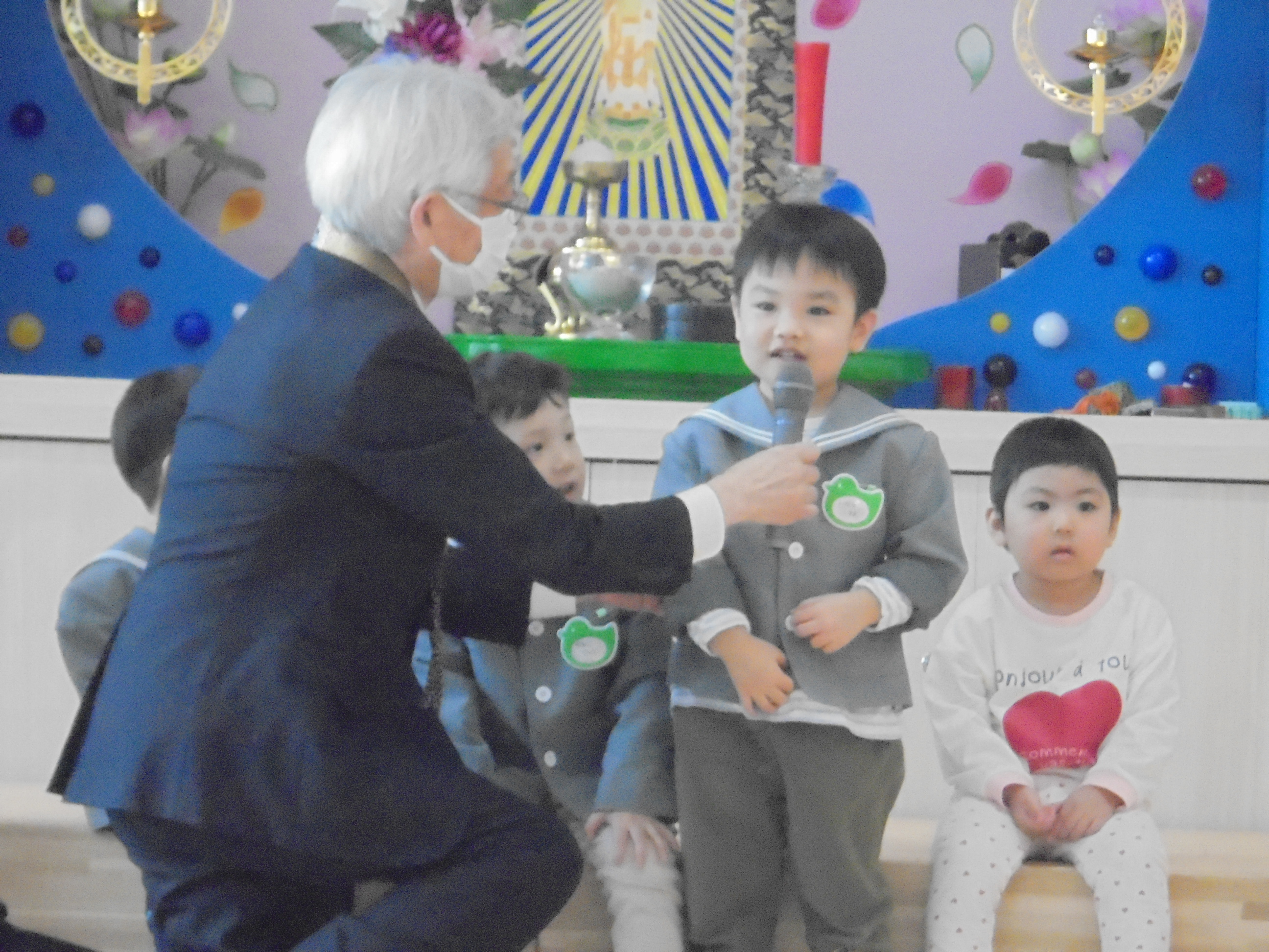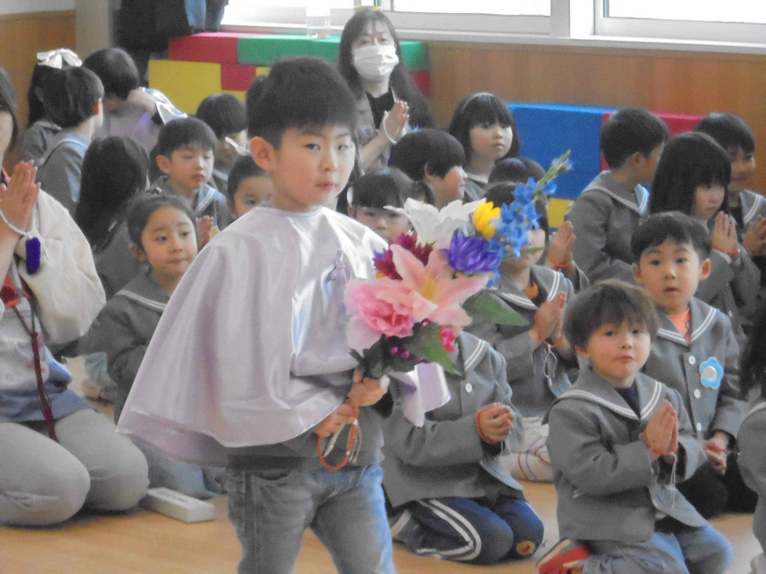 今日は3月のお誕生会でした。インタビューではどんな遊びが好きかはっきり言えてましたよ。先生たちからの贈り物は、先生当てクイズでした。(^^)/