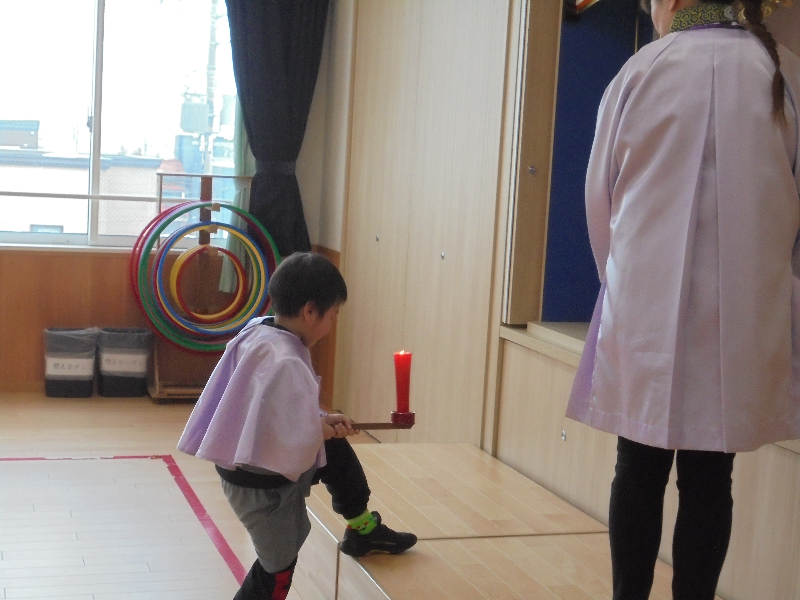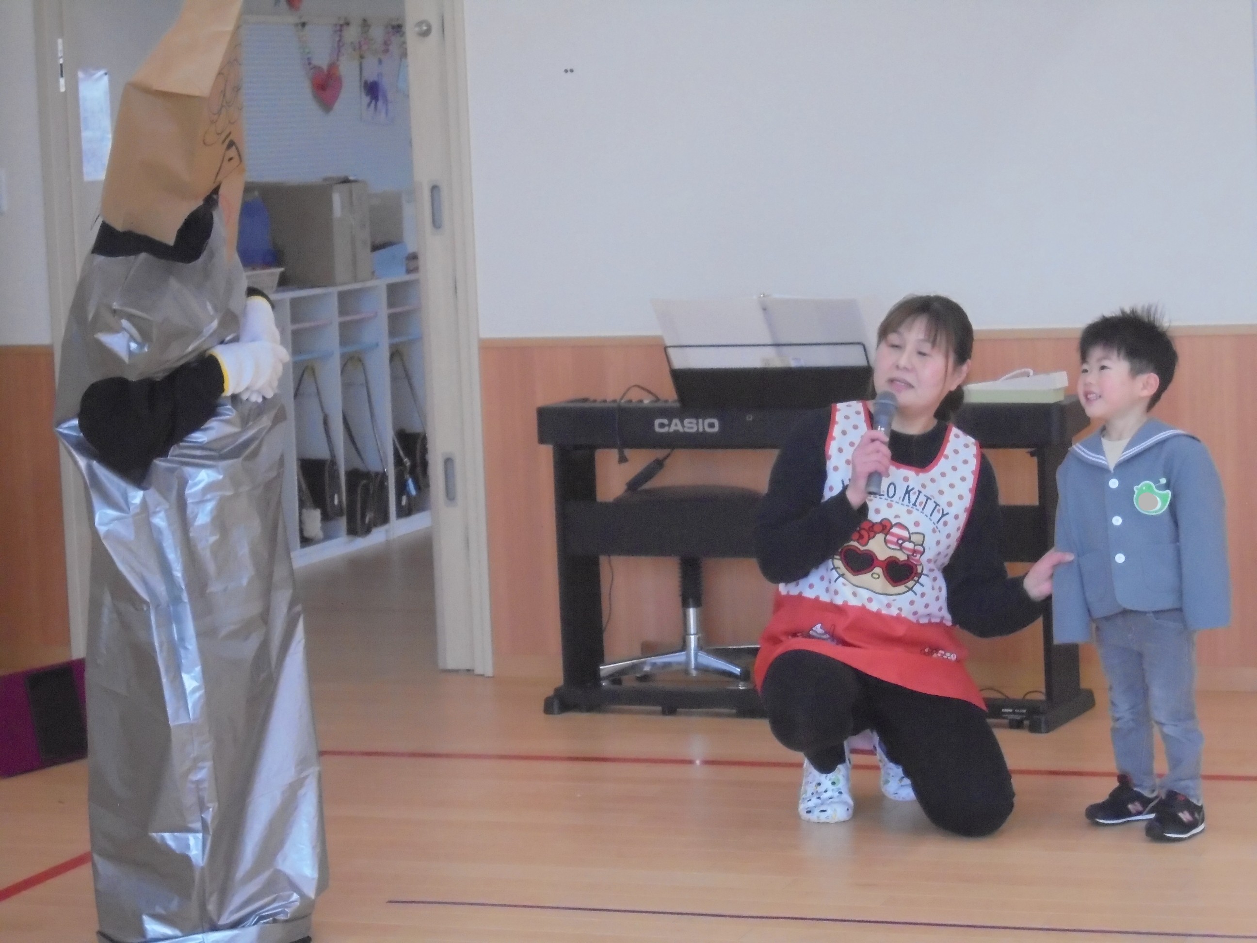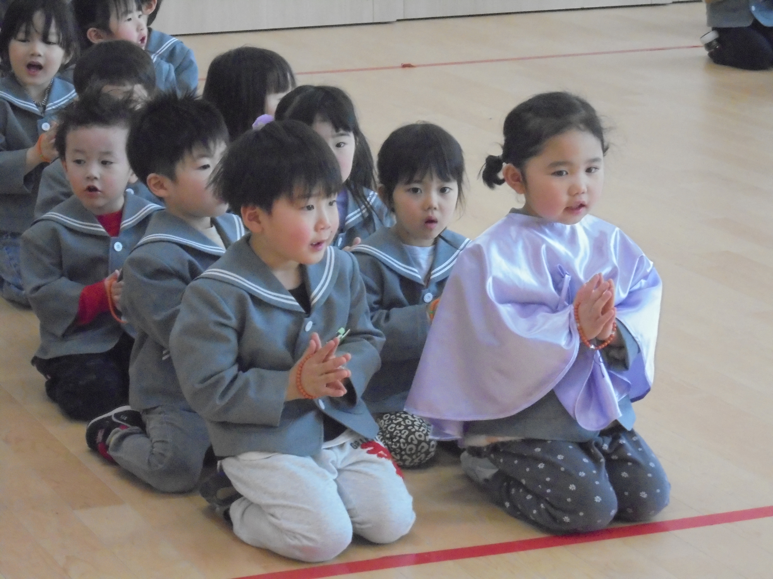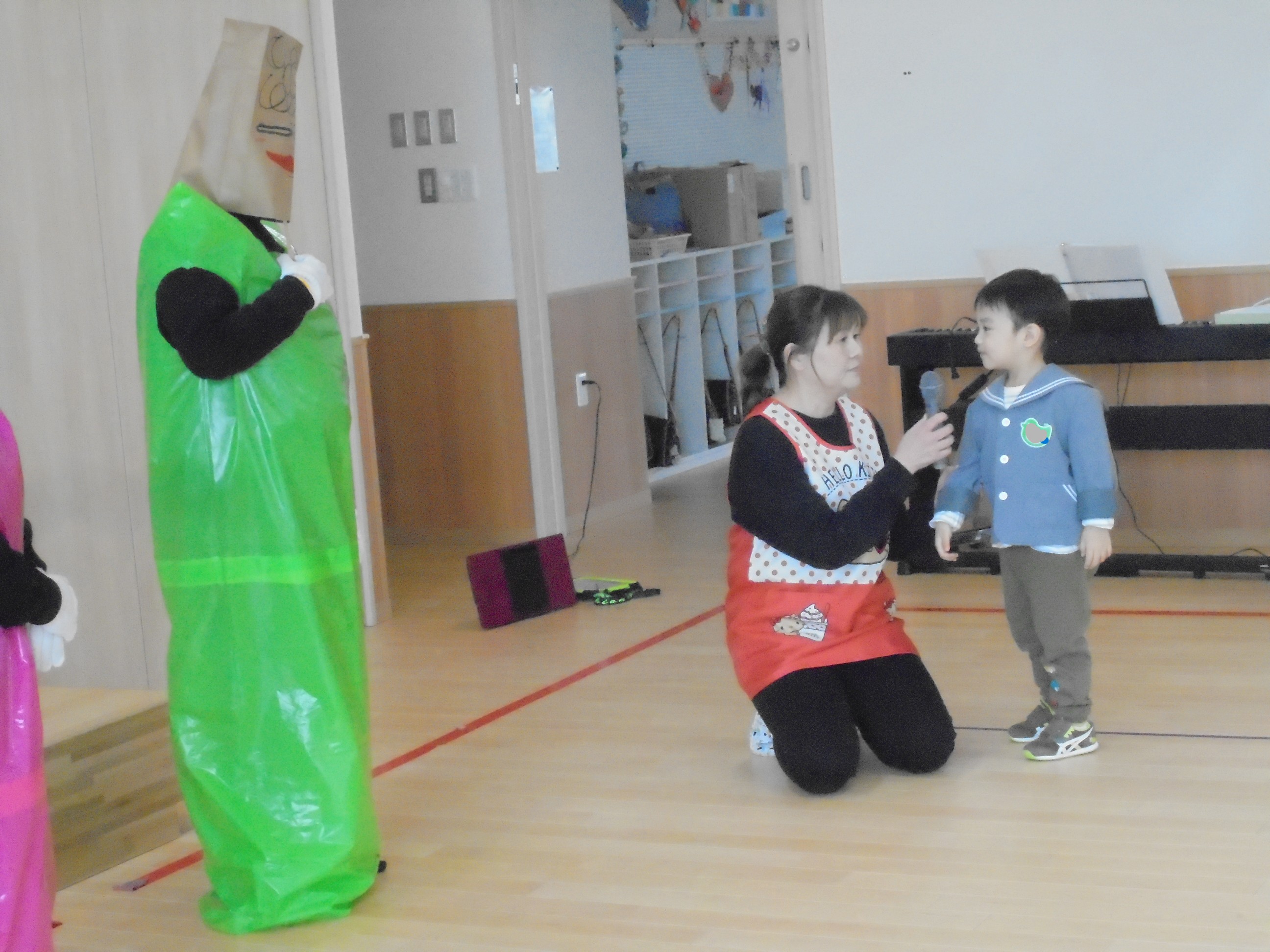 今日は3月のお誕生会でした。インタビューではどんな遊びが好きかはっきり言えてましたよ。先生たちからの贈り物は、先生当てクイズでした。(^^)/