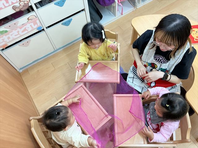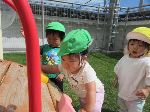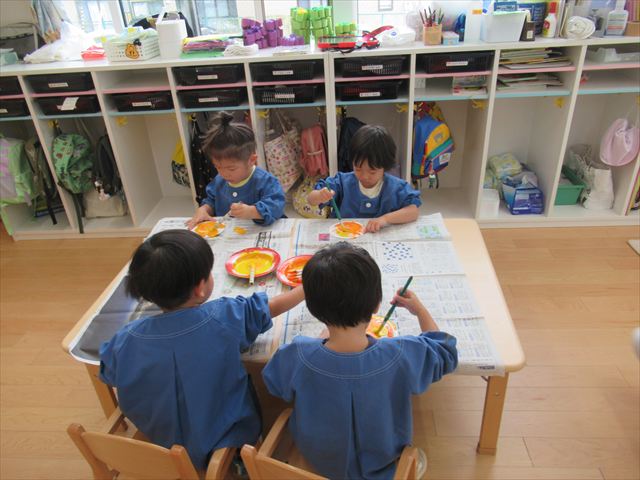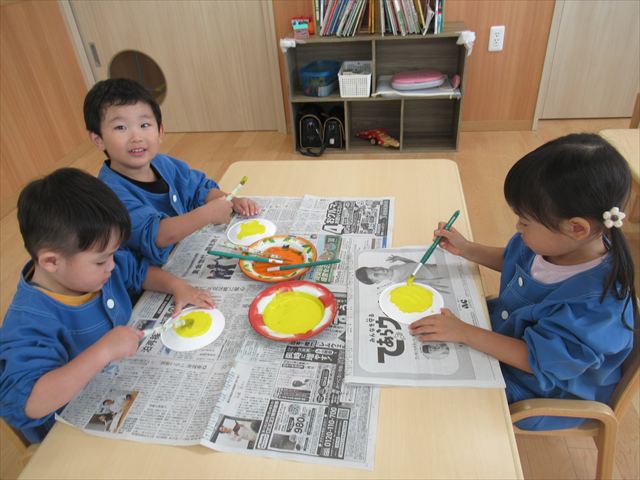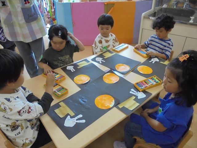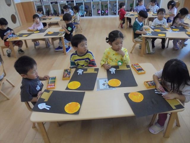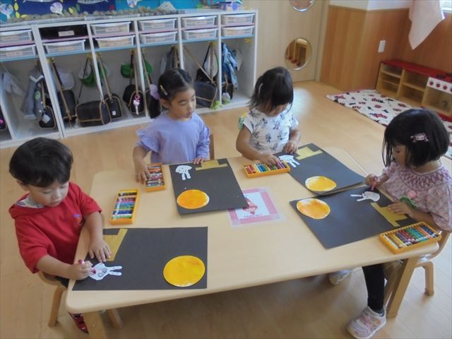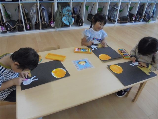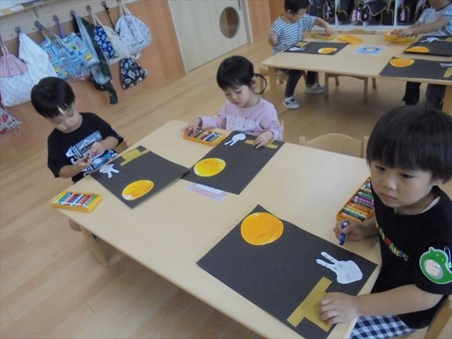 年中さんはピアニカ楽しんでました。年少さんはお月見制作。かめ組さんはお散歩に行ってから園庭で遊びました。らっこ組さんは先生とお部屋で遊びました。ペンギンさんは色遊びを楽しみました。