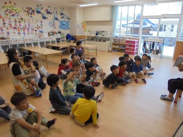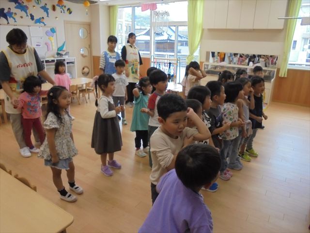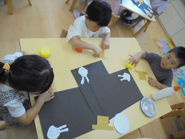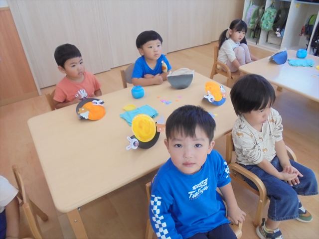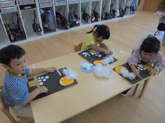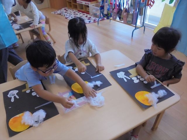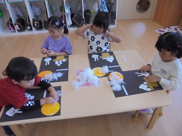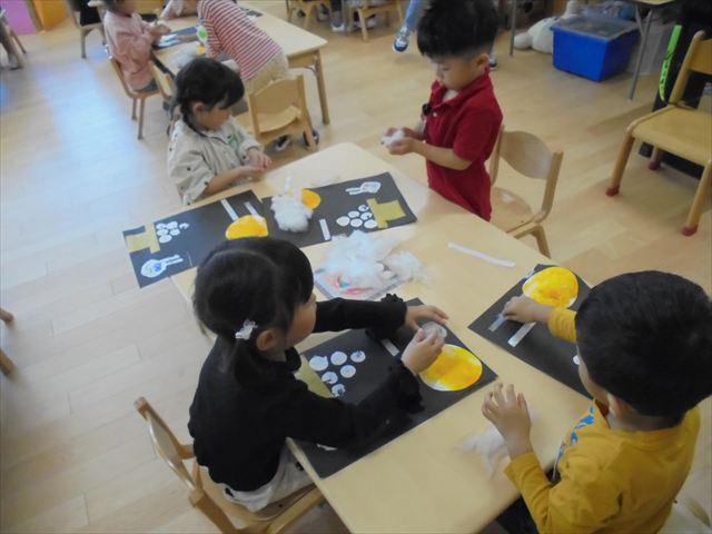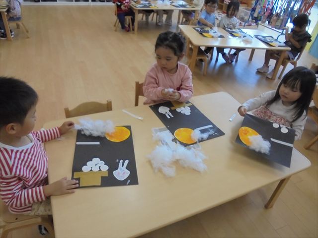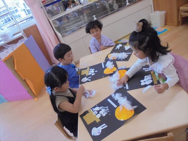 今日は年少~年長クラスは英語遊びがありました。あざらし組とぺんぎん組はお月見制作をしていました。